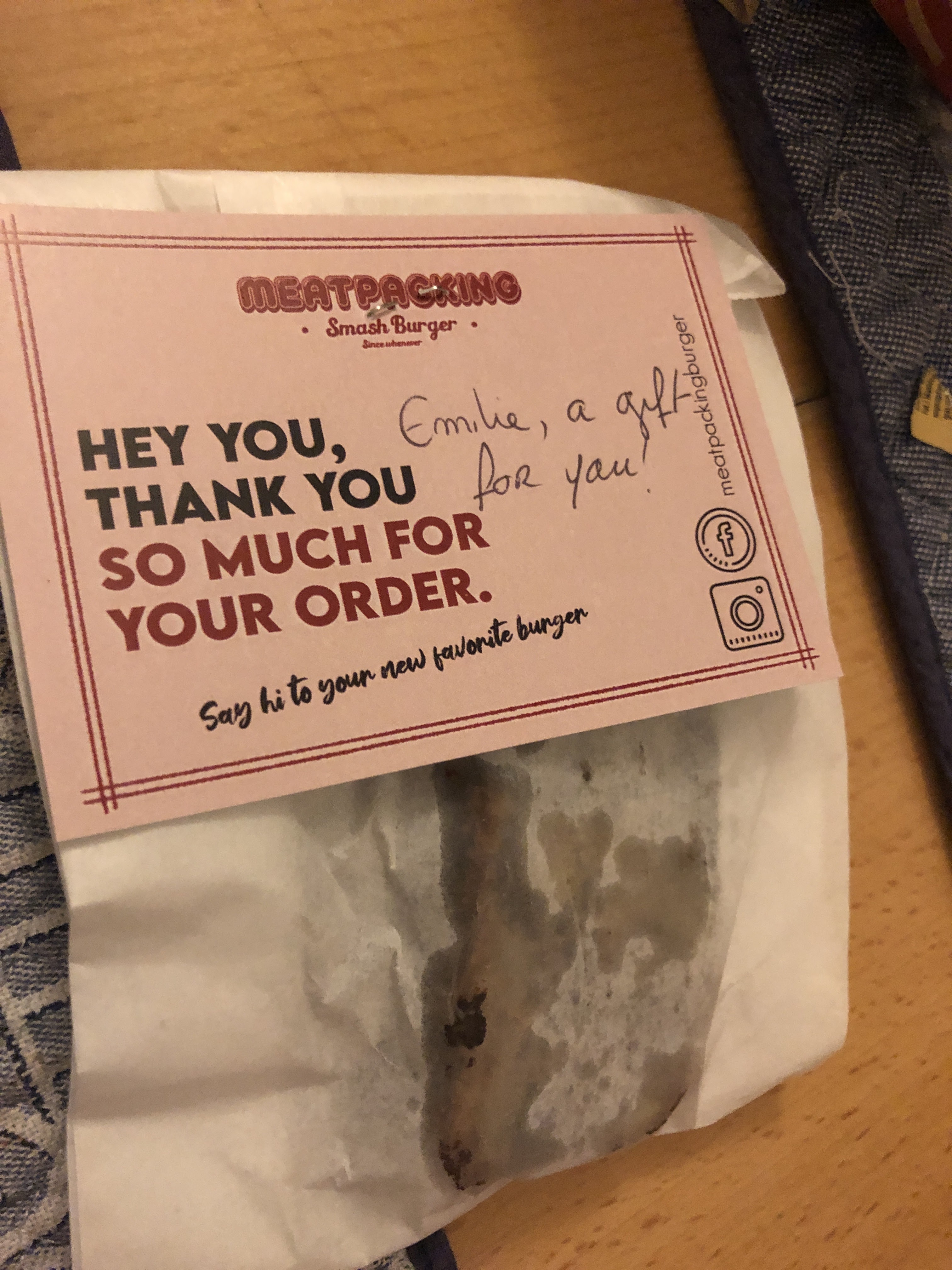 J'ai commandé aujourd'hui un burger de Meatpacking et je tiens à laisser ce commentaire pour partager mon retour. Un packaging super mignon, un burger excellent, des frites maison bien assaisonnées et une petite surprise dans la cmd un cookie cadeau avec une note écrite à la main. Commandez sans hésiter, c'est ma nouvelle maison de burger favorite !! Merci pour le service