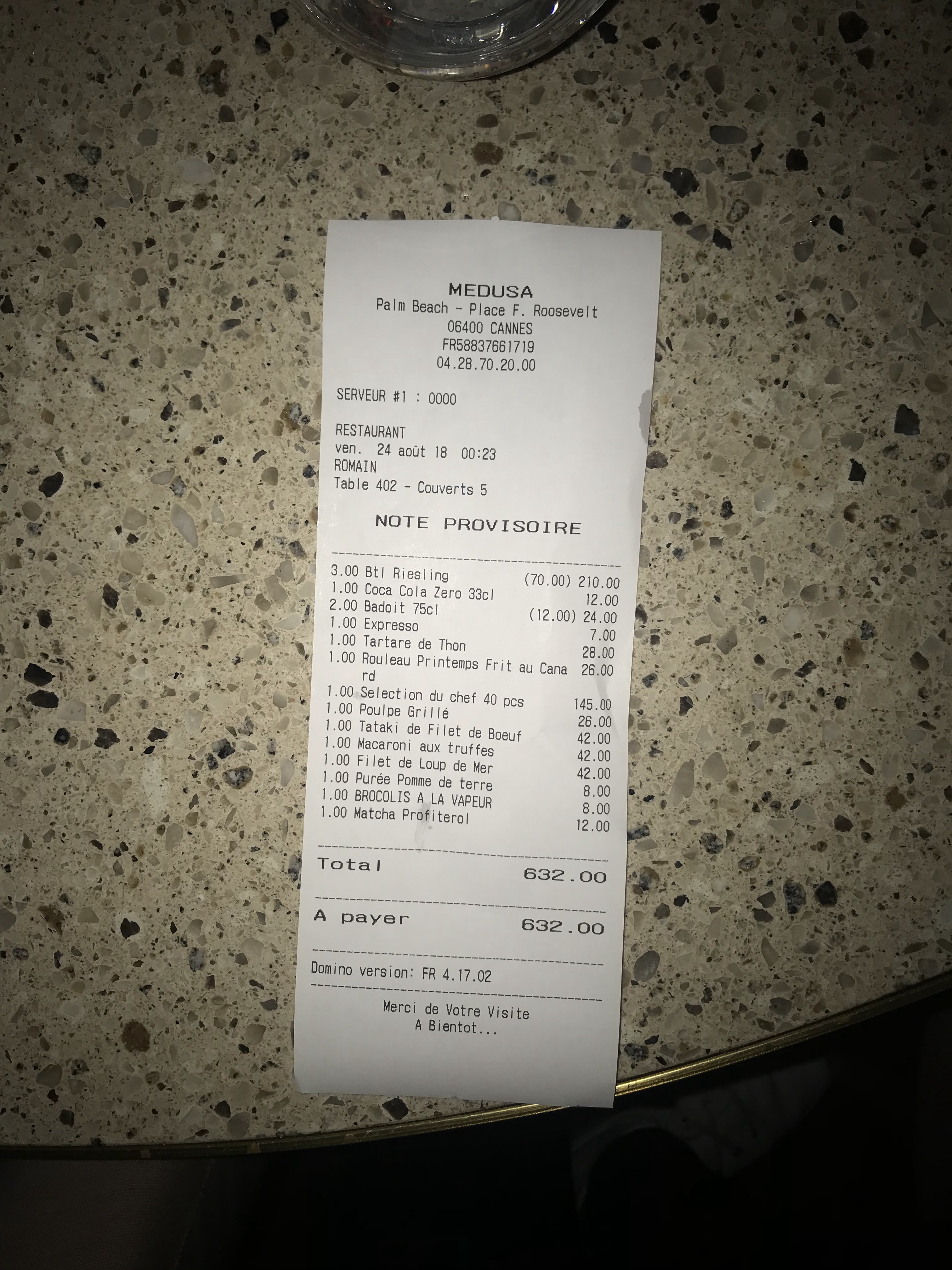 On te dit ! Table et 350 euros minimum par personne … la serveuse te dit ! Allez y … prenez encore des bouteilles vous n’avez pas utilité votre crédit …. On est 7 … au final … tu reçois la notre …. 440 par personne ! Plus jamais …