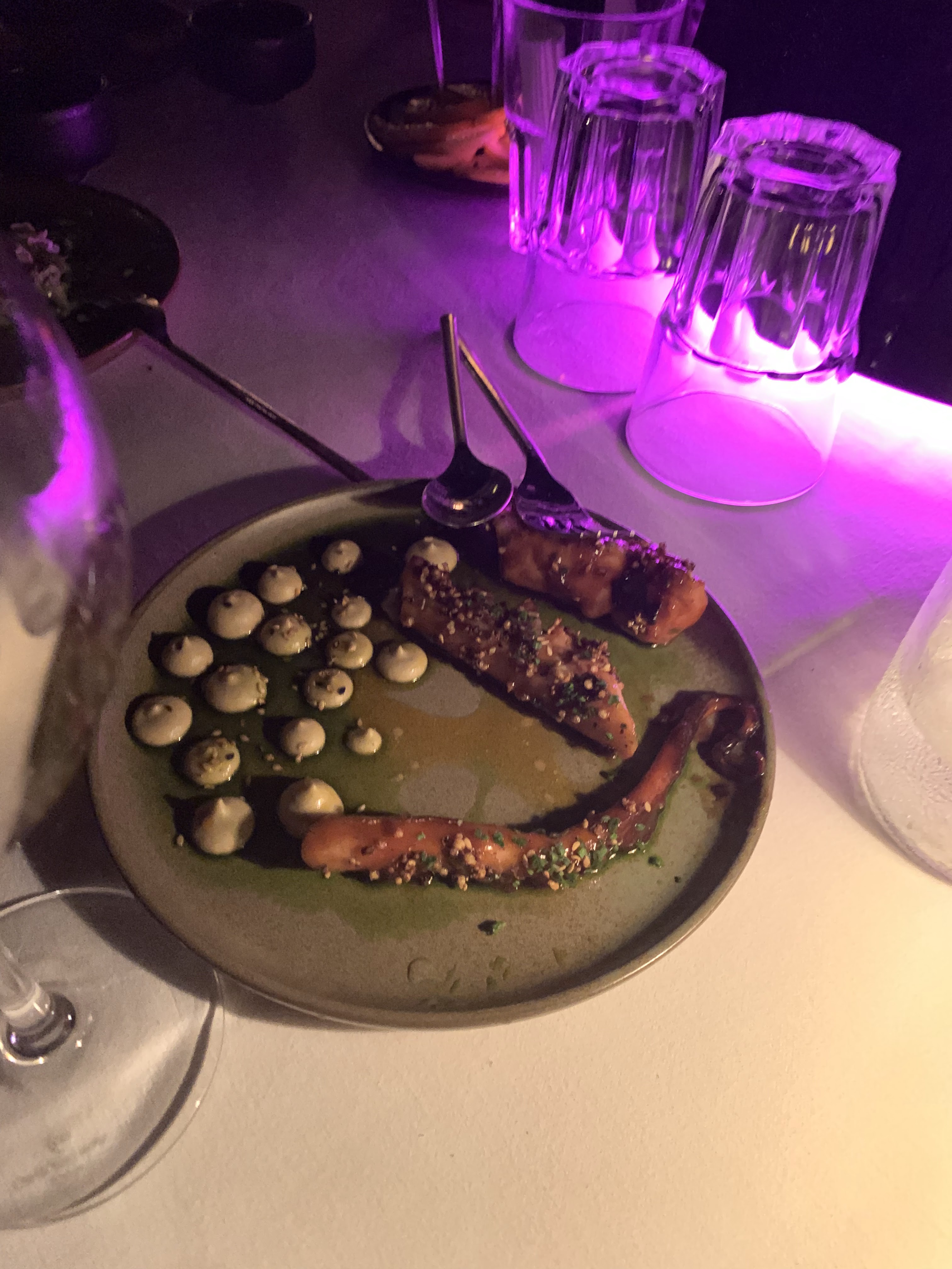 4,5 étoiles pour l'ambiance et l'expérience. Je regarde les critiques que les gens laissent et je ne sais pas si c’est un endroit aléatoire. Nous étions 9 personnes et avons eu une table avec une très bonne vue sur les performances live. Nous sommes arrivés vers 20h30/21h. Le poulpe grillé et les fruits frais étaient incroyables. Le reste de la nourriture était bon mais pas mémorable. Dans l’ensemble, c’était vraiment amusant. Les performances étaient super ! J'y retournerais avec un groupe d'amis.