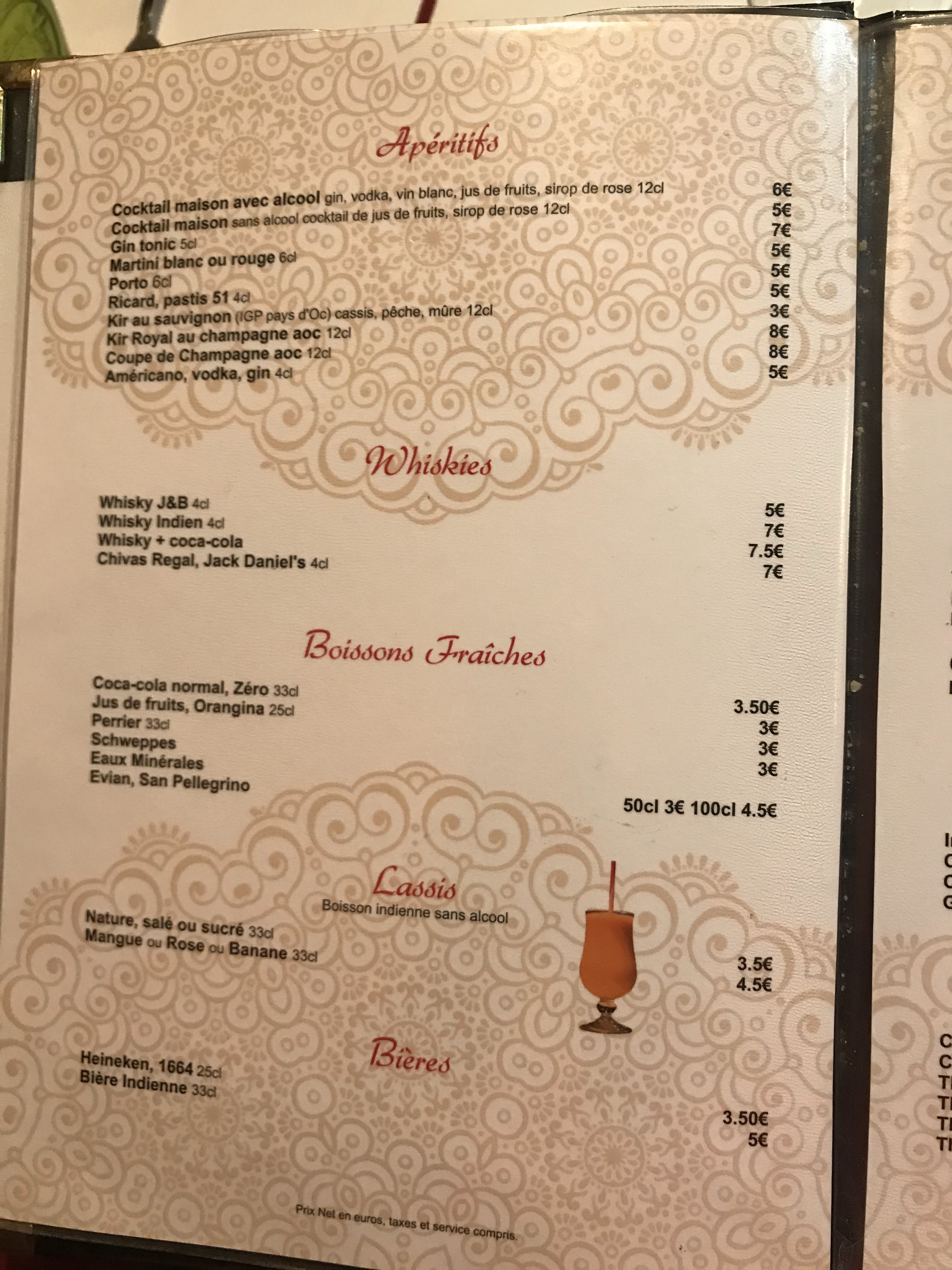 Franchement, c'est bon !! 12€ le midi, 17€ s&we. mais pains en option :( même pas le naan nature. 7 plats environ + riz et 3 entrées (fritures), 3 desserts (riz au lait, pastèque et sablé je crois). J'y retournerais probablement. ouvert en août.