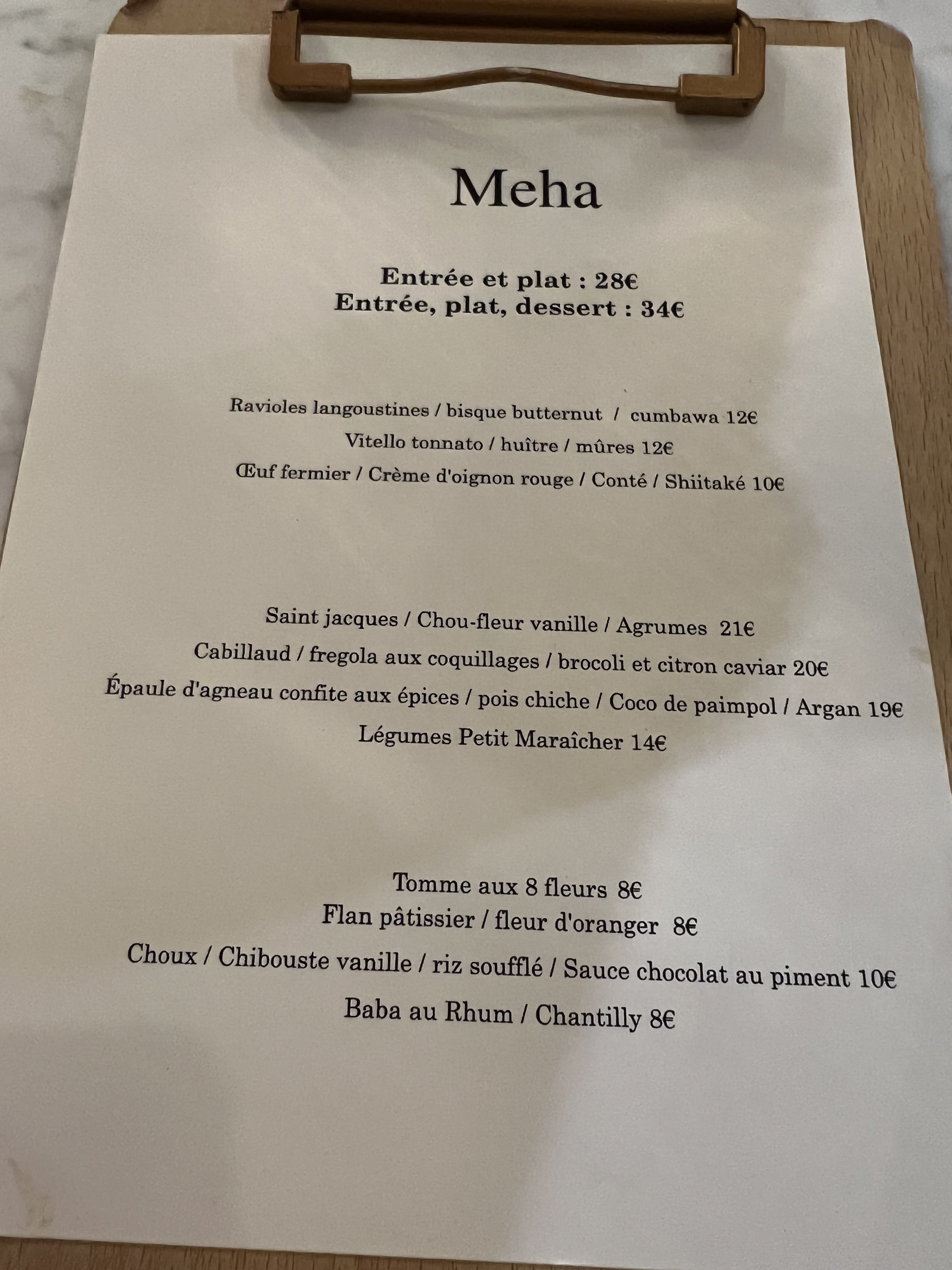 L accueil est super sympa. Nous avions réservés pour 6. La carte limitée garantit la fraîcheur des produits. Les crevettes sauce thai étaient excellentes et la noix de veau un délice. Les desserts faits maisons sont incontournables. MEHA était une très belle découverte que nous vous conseillons vivement ⭐️