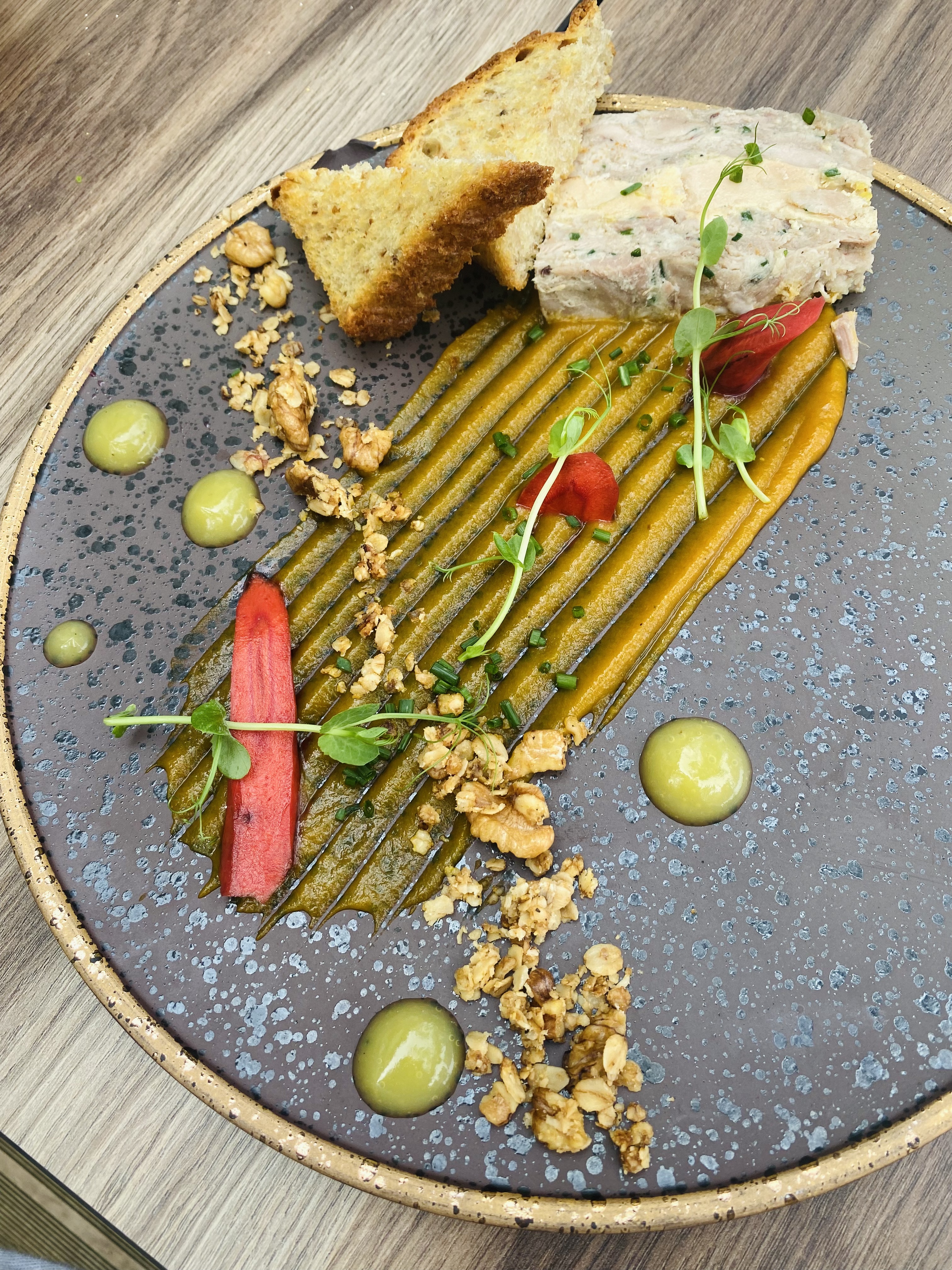 Nous avons vu que le restaurant était en cours de rénovation cet été et nous l'avons visité hier. Si la carte était un peu surprenante avec des associations insolites, nous avons été époustouflés par la qualité des plats qui nous ont été servis, le chef connaît clairement son métier ! Nous avons eu la terrine de lapin et les pétoncles pour commencer, le lapin parfaitement succulent et était l'un des meilleurs que j'ai jamais mangé, et les pétoncles étaient poêlés à point, juste parfaits. Suivi du porc, qui avait les meilleurs crépitements et la poitrine était joliment cuite, et le boudin noir avec une légère croûte sur le côté était merveilleux. L'assiette entière était parfaitement équilibrée et l'assaisonnement était parfait. Le bar avait une belle peau croustillante et encore une fois parfaitement cuit - si je suis difficile, les nouilles soba n'avaient pas de sarrasin pour que ce soit du soba, je ne pensais pas mais la sauce aux moules et au gingembre était un délicieux accompagnement au bar. La panna cotta à l'avocat était si bonne avec le croquant dans la couche intermédiaire. Mélanie était très chaleureuse et serviable et a suggéré un bon vin local pour accompagner notre nourriture fabuleuse. Merci d'avoir pris soin de nous, vous avez rendu notre soirée ! Je reviendrai certainement !