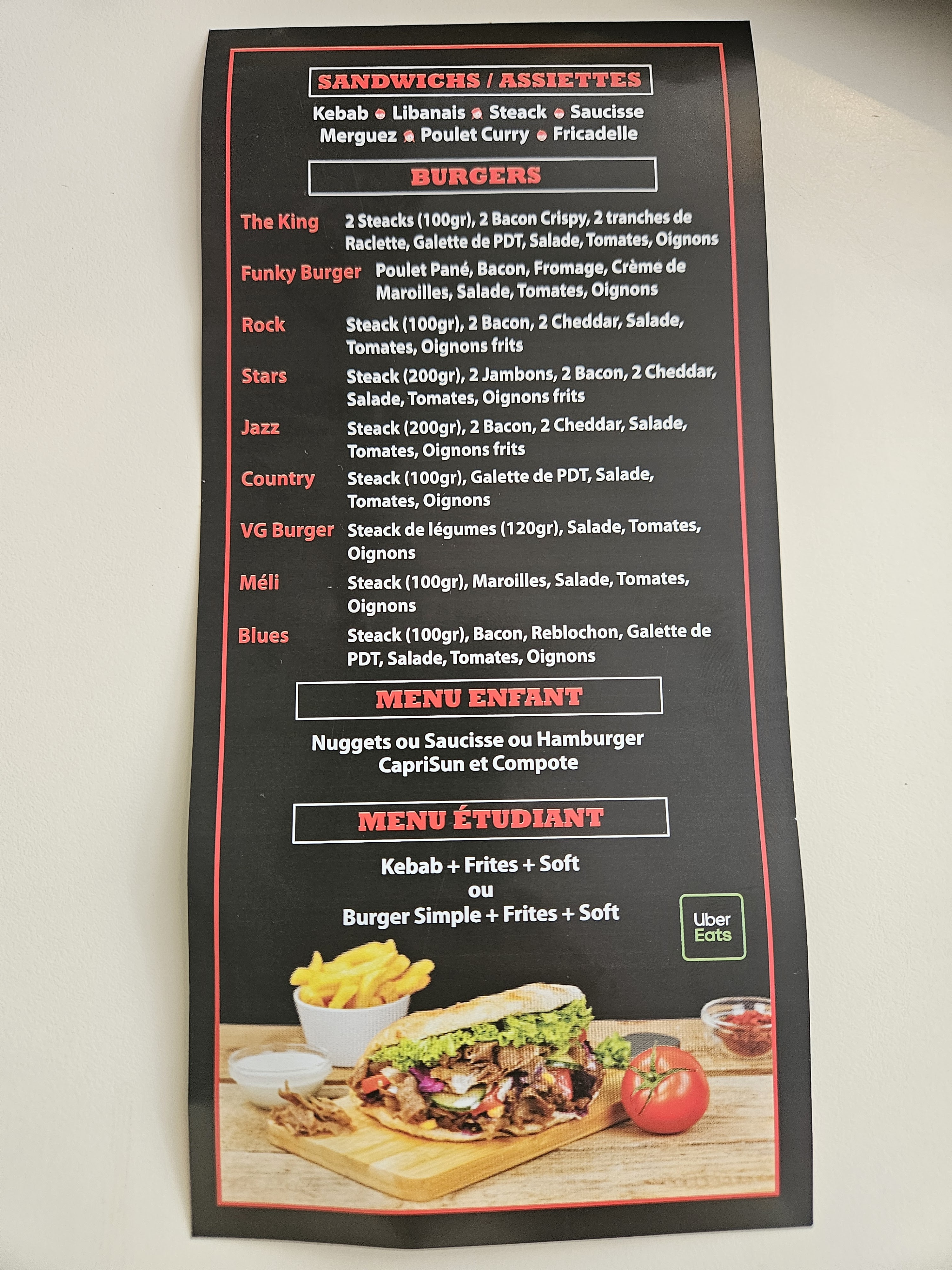 Nous avons avec mon copain commandé sur uber eats le libanais XL avec salade tomates oignons. Au final 1 rondelle de tomate, pas d'oignons, très peu de sauce et pas de frite. Pour 12 euros un. Il faut à ce prix tout rajouter, le fromage, les frites. Du coup c'est très sec. Déçus.