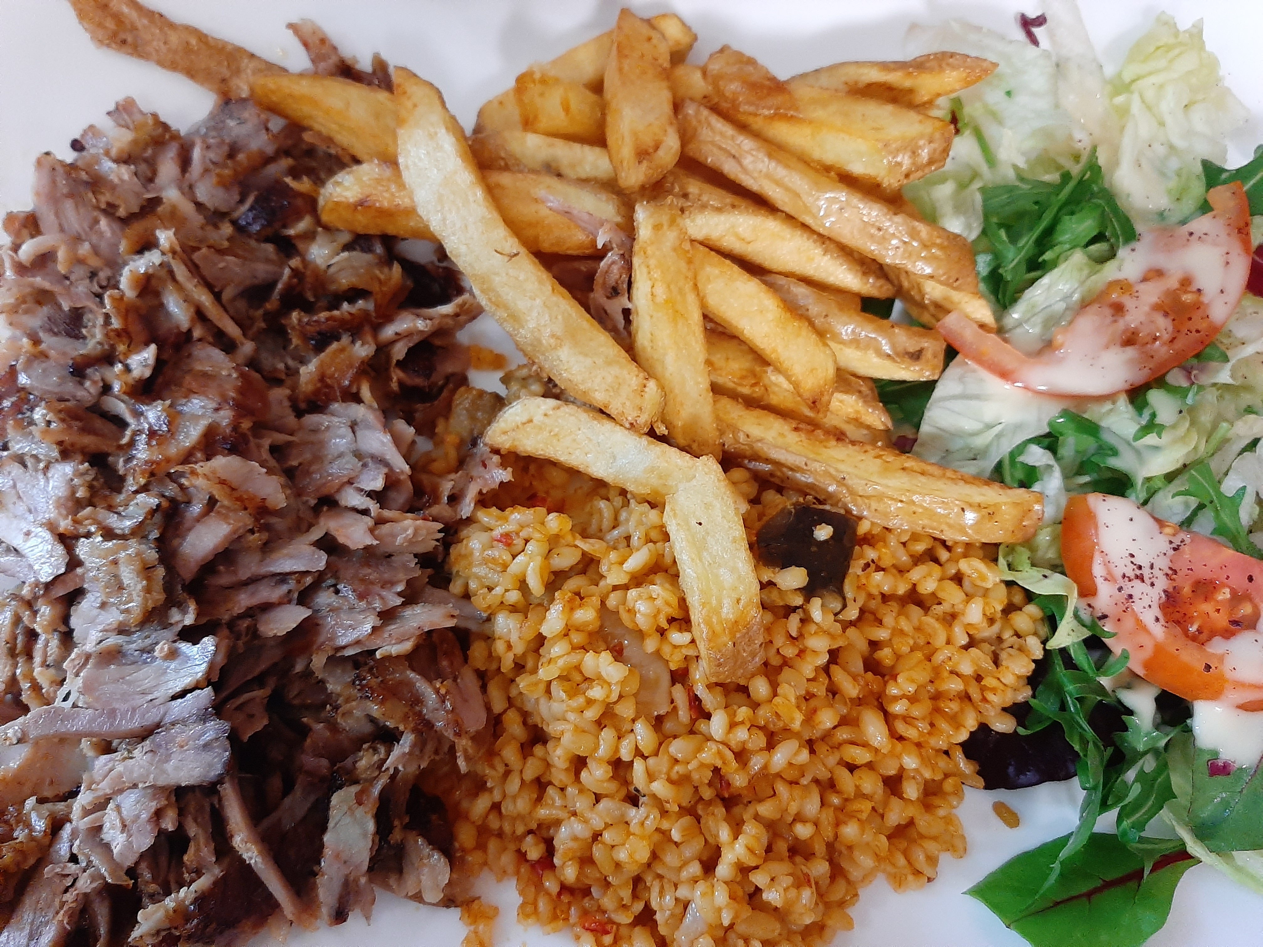 Repas sur le pouce correct et bon grillade au charbon de bois, service rapide et accueil agréable. Juste les frites sont un peu trop cuites. Pas fan des mc do et burger king c'est largement meilleur. Le doner est fait sur place nous avons visité la cuisine ils étaient en train de le préparer. On peut s'y poser en cette période.