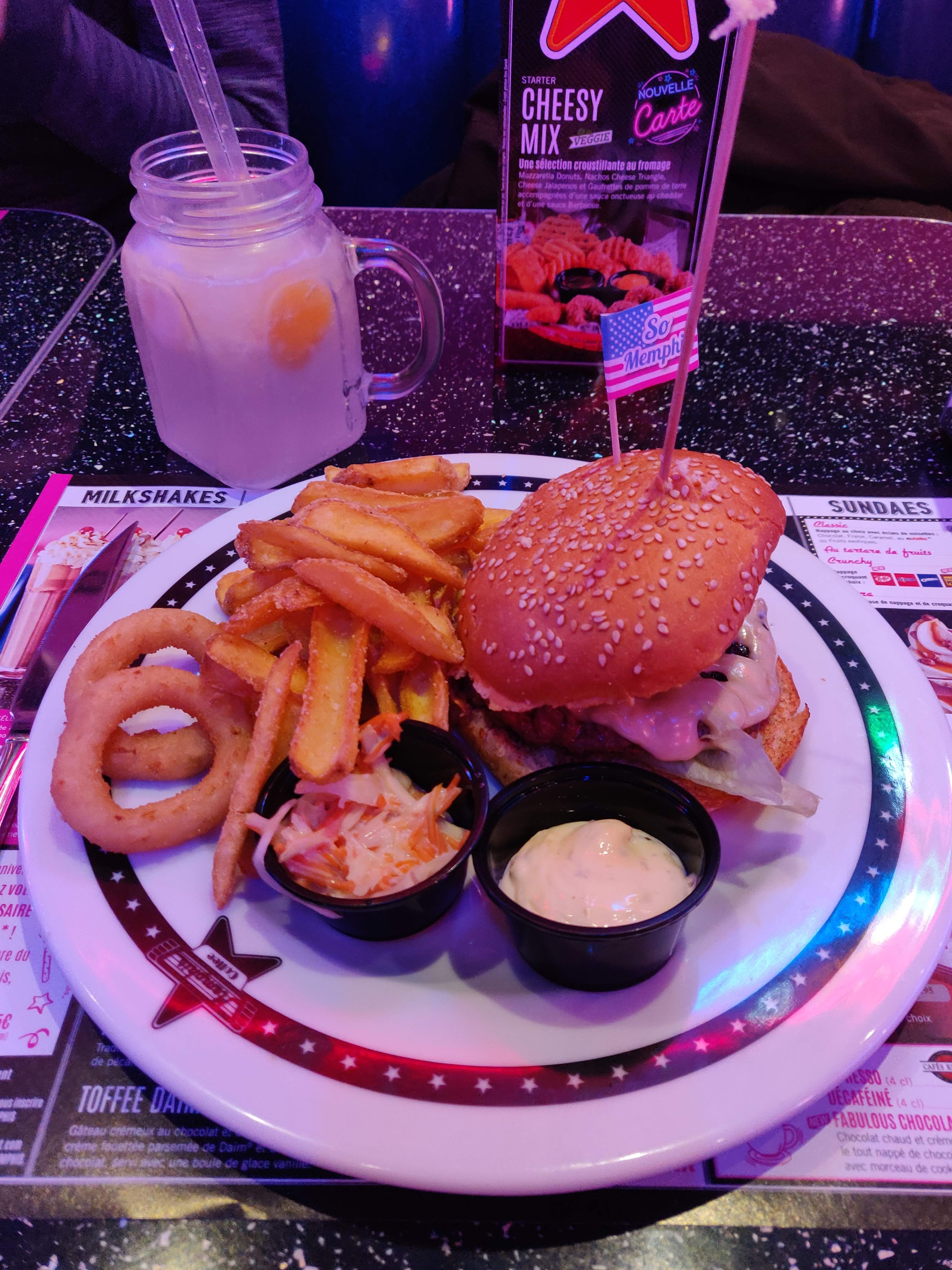 Un voyage dans les années 50-60 américaines... Un beau décor, un service très agréable et des plats type fast food...la qualité et la quantité sont à la hauteur de nos attentes... Le service mériterait d'être parfois un tout petit peu plus rapide mais l'expérience vaut le détour et on peut totalement vous recommander de découvrir ce restaurant très original !!!