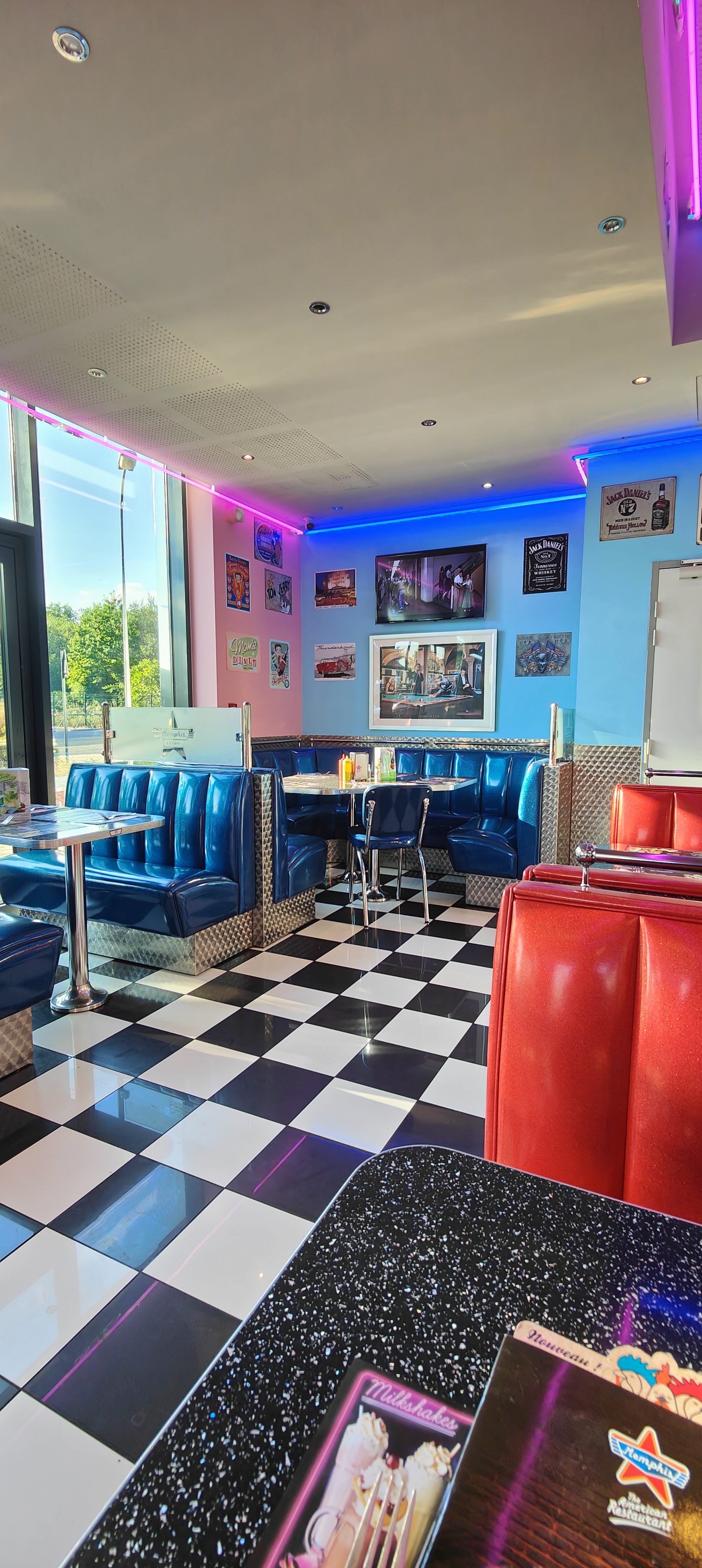 Contrairement aux avis Google que j'ai consulté avant de me rendre dans ce restaurant, le service fut assez rapide. (Entre un fast food et un restaurant classique). J'ai bien été accueilli par une serveuse qui ne m'a pas déçu tout au long de mon repas. Étant un jeune fan des USA, on est, dans ce restaurant, plongé dans l'époque des dîners des années 50 avec une décoration moderne, neuve et très fifty ! 🇺🇸 Très grand choix sur la carte (celle-ci pourrait par ailleurs être un peu plus ergonomique) Je me suis laissé tenter par un Starter (apéritif) composé de différents tapas, puis d'un Western BBQ 2 viandes (cuisson de la viande choisie par le client). Ce Burger est fourni avec des frites, une sauce et un pot de coleslaw. J'ai trouvé cela très bon, mais la quantité de coleslaw est vraiment ridicule (en une fourchette et demi il ne reste plus rien)... dommage vu le prix de mon assiette à 15€ Pour le dessert, j'ai choisi un milkshake vanille, un classique. Malheureusement, j'avais l'impression de boire de la mousse, c'est dommage car il est vraiment beau. En tout cas, je reviendrai pour profiter d'un bon repas dans une ambiance que j'adore particulièrement !