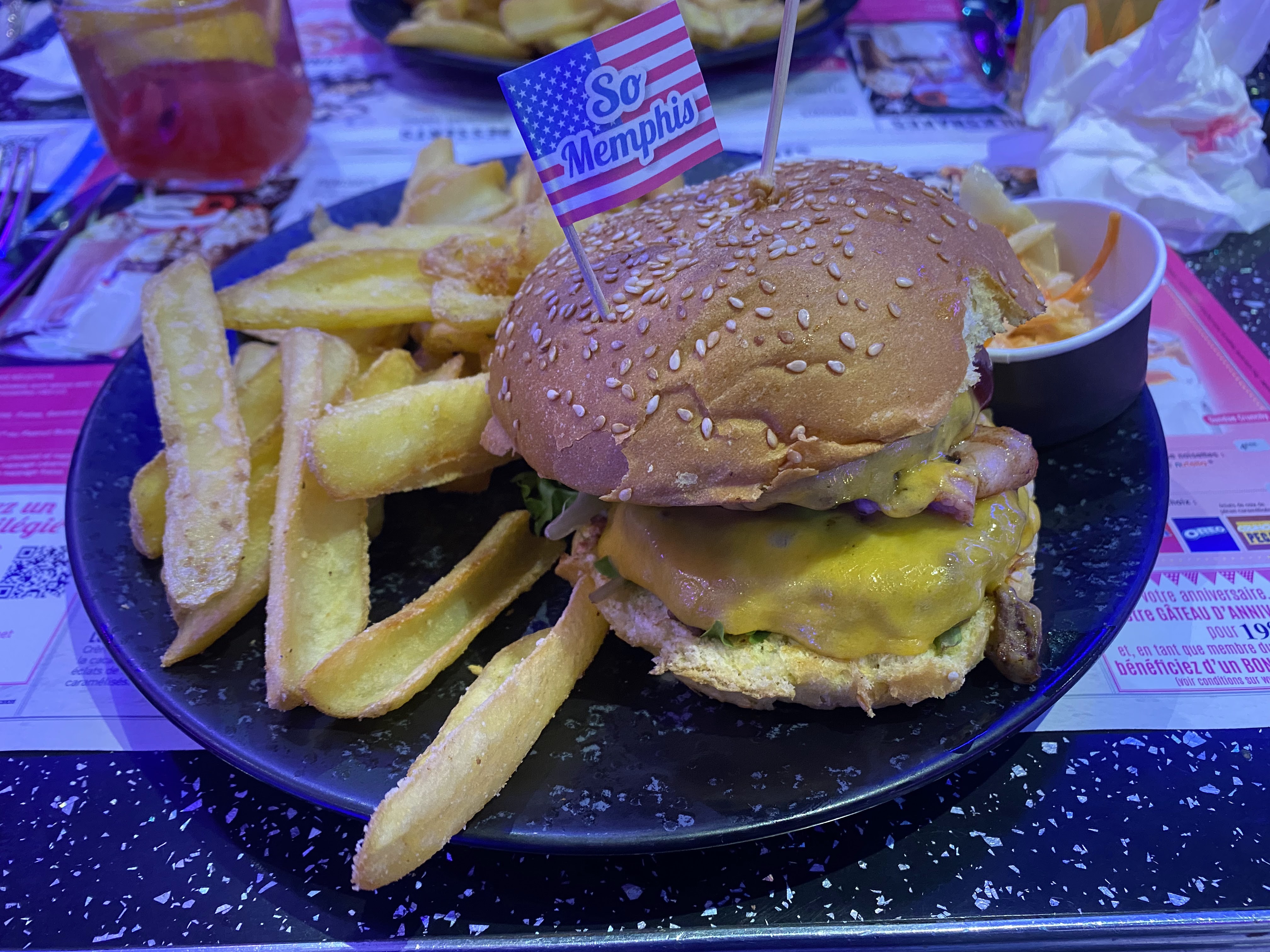 Très belle ambiance avec style bien tenu sur leur thème américain 👍👍 , rapport qualité prix plus que satisfaisant avec de nombreux choix à la carte pas si facile 😋😋 , service impeccable par plusieurs serveurs bien sympathique 😁😁 , et petit échange bien sympa avec la gérante sur (statue pin up a vendre elle me reconnaitra 😉😉) , je recommande sans hésiter et pensé peu être à réservé à l'avance. Merci l'équipe Memphis vous êtes au top 👌👌