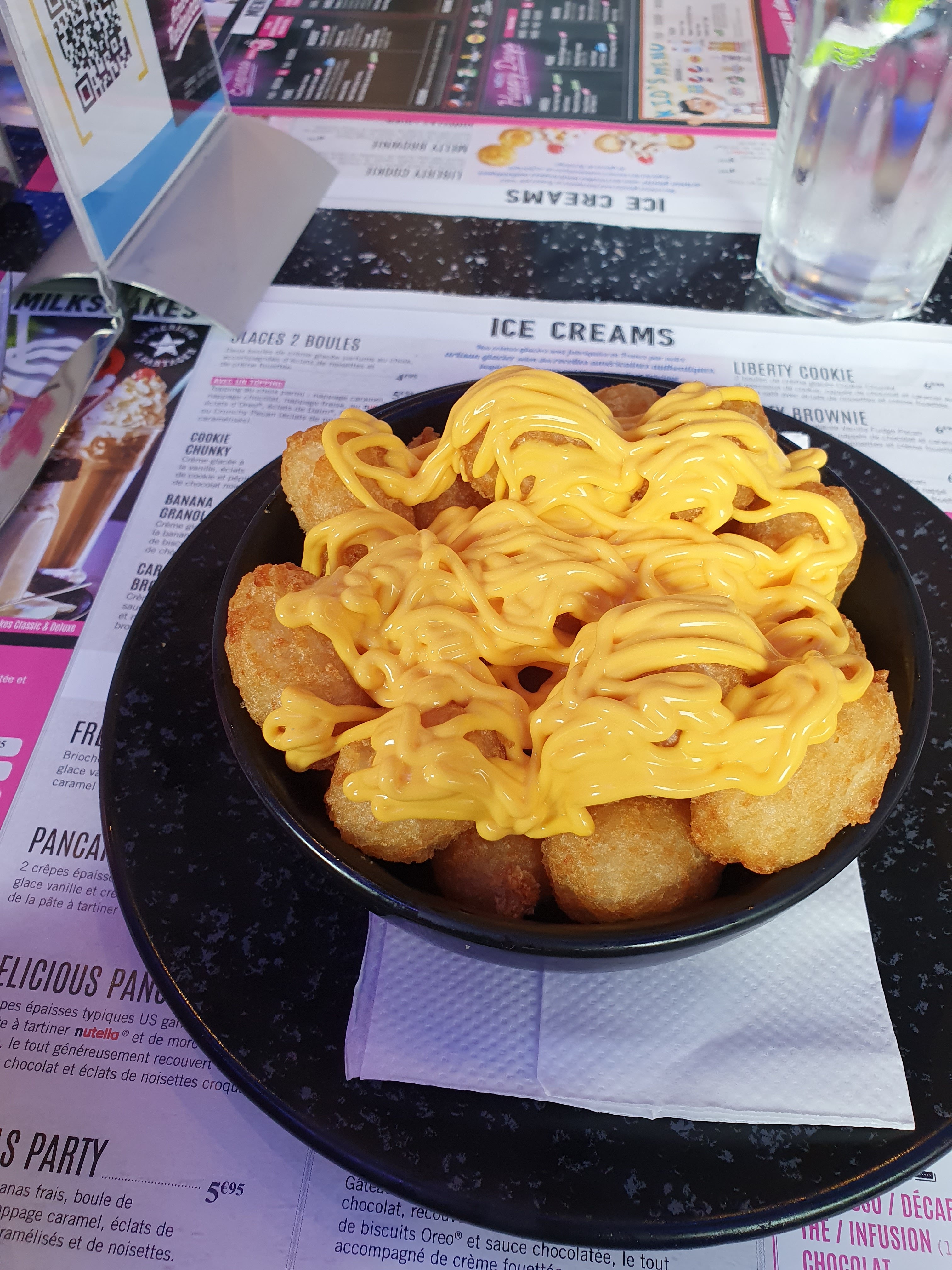 Commander ce soir via uber eat !!! 67€ Pour 3 churros 5 soit disant beignet hot dogs saucisses mais c'est plutôt des knacki balls 3 doubles cheeses burger 1 cheese simple L'arnaque total 1h d'attente Arrivée froid, les potatoes c'était leur fin de paquet. Les burger dégueulasse, pleins de ketchup. Le burger contrairement à leur photos, ils sont minuscules en vrai mdrrr Franchement fermé votre restaurant !!!!!!
