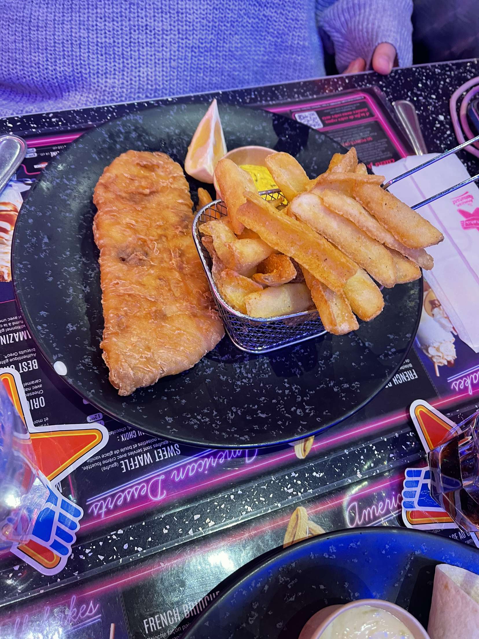 Restaurant original même si le serveur n'était pas très aimable et commentait beaucoup. Restaurant non halal et le poisson est mangeable , même si les portions sont petites . Un peu chère pour ce que c'est . Cependant le décor faisait très américain et la serveuse qui a pris la relève adorable . le sundae était très bon ...