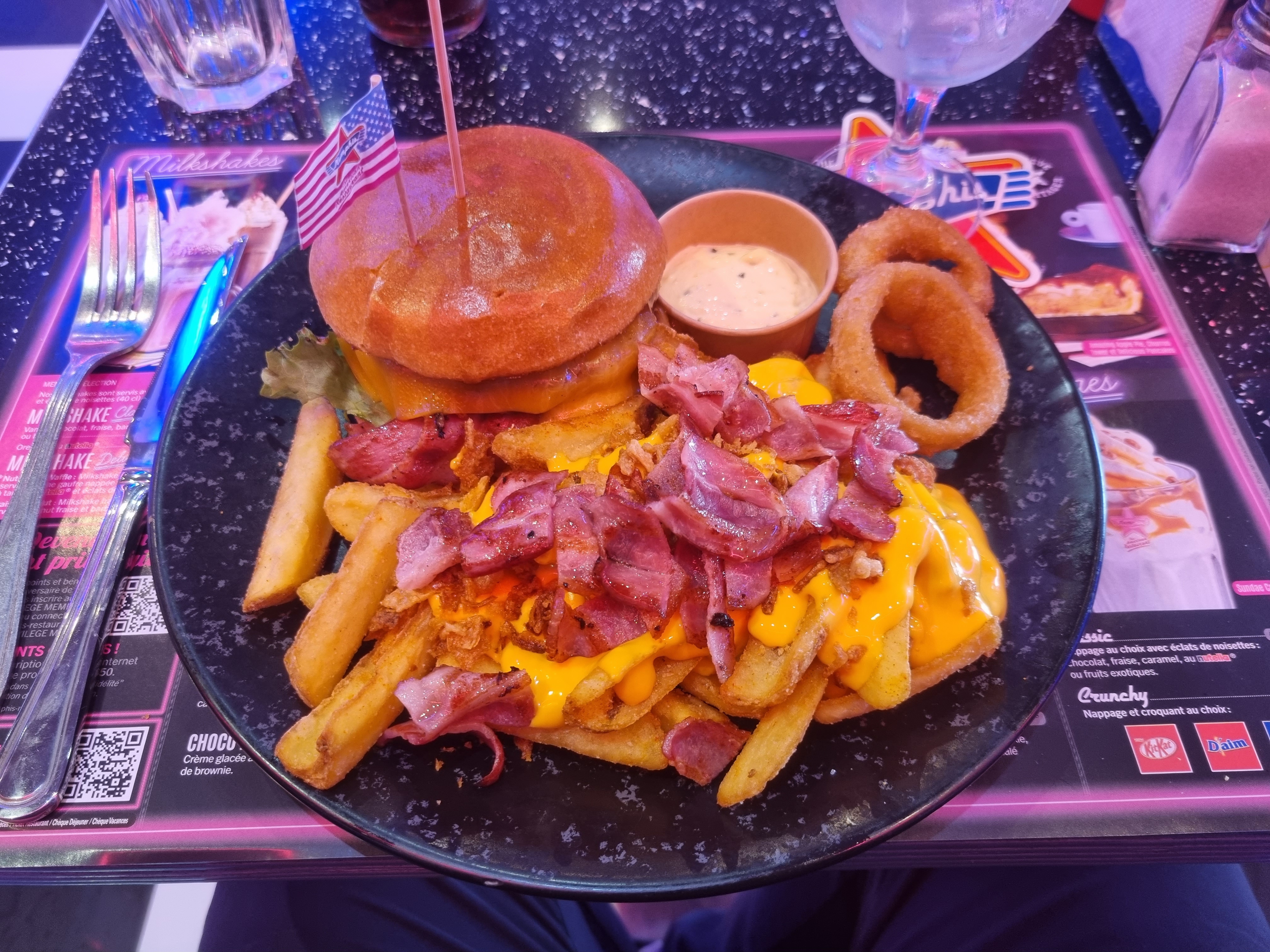 Le temps d’attente pour les plats/boissons est beaucoup trop long (10min pour avoir 2 boissons) sachant qu’il y’a peu de monde dans la salle,de plus il y a beaucoup de choses qu’ils en ont plus quand on veut commander. De plus les plats sont trop gras, comme les onion rings, on a l’impression de manger de l’huile. La serveuse qui commente tout et n’arrête pas de dire « on est fou » , cela met mal à l’aise . Plus jamais ! Je recommande pas.