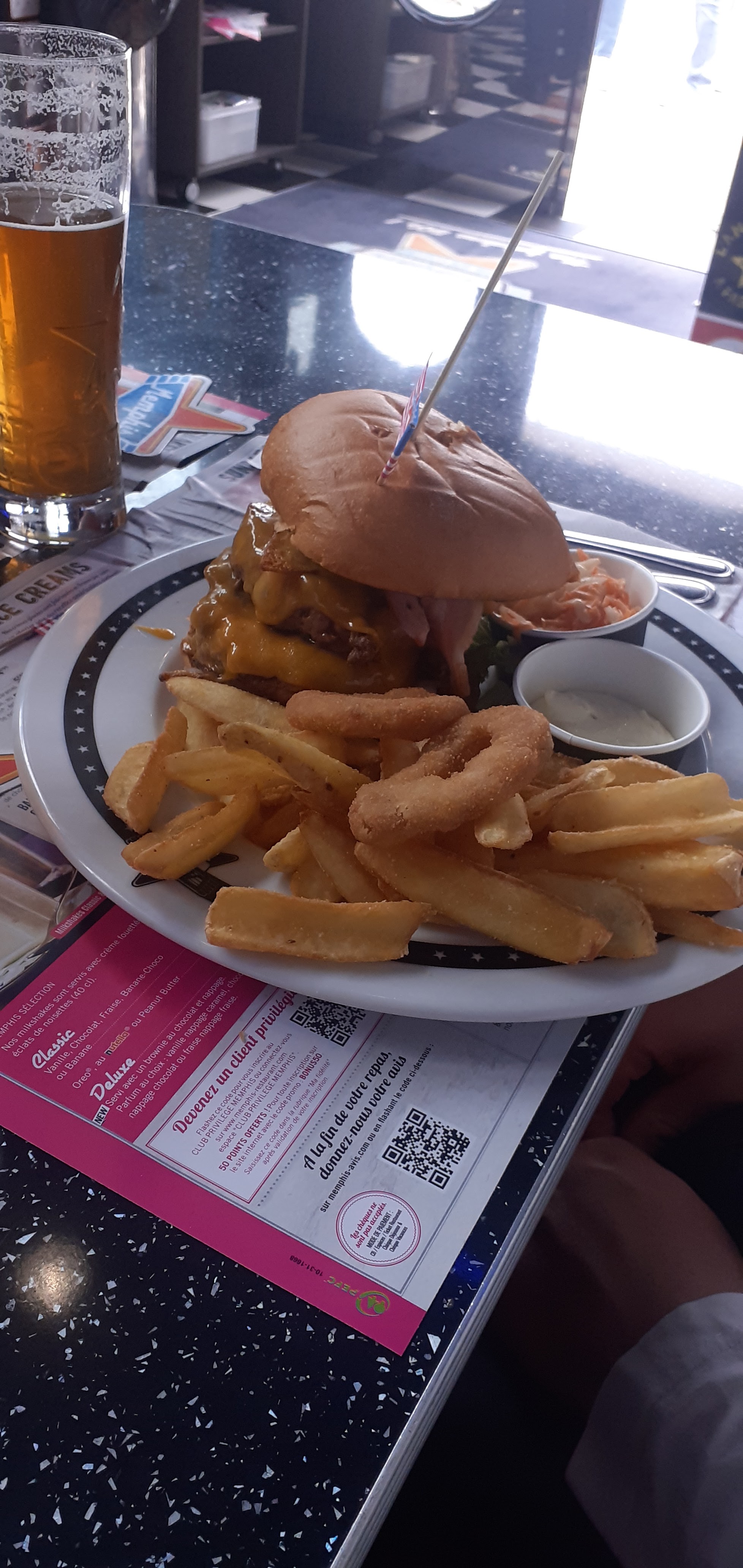 Une première dans ce restaurant qui fut une grande déception, comparer aux autres Memphis ou j'ai pu allez (orleans 45 barantin 76 ) 15 min d'attente pour l'apéritif et le repas servie avant les cocktails hors que nous avions bien précisé prendre l'apéritif avant le repas qui es logique . La serveuse n'a pas apprécié que nous demandons le report des assiettes. Je pense qu'il y a un manque de communication dans l'équipe. Dans l'après-midi nous avons souhaité revenir pour boire un verre cela nous a été refusé car ils ne fesait plus de service à 17h30 pour des simple verres du jamais vue dans leurs autres restaurant de la chaîne ! Alors que quelques secondes avant ils continuer de servir des repas. Restaurant à fuir !