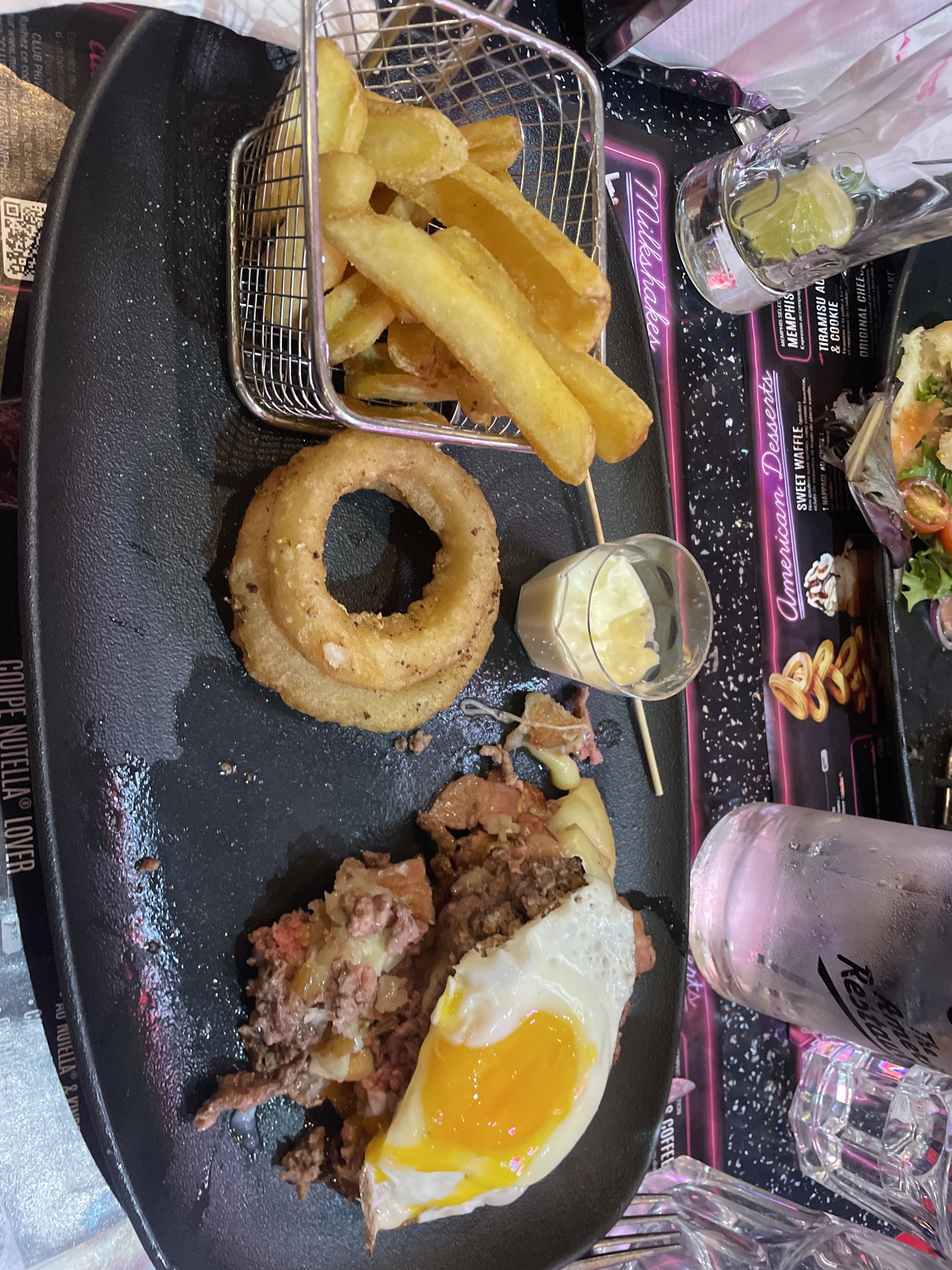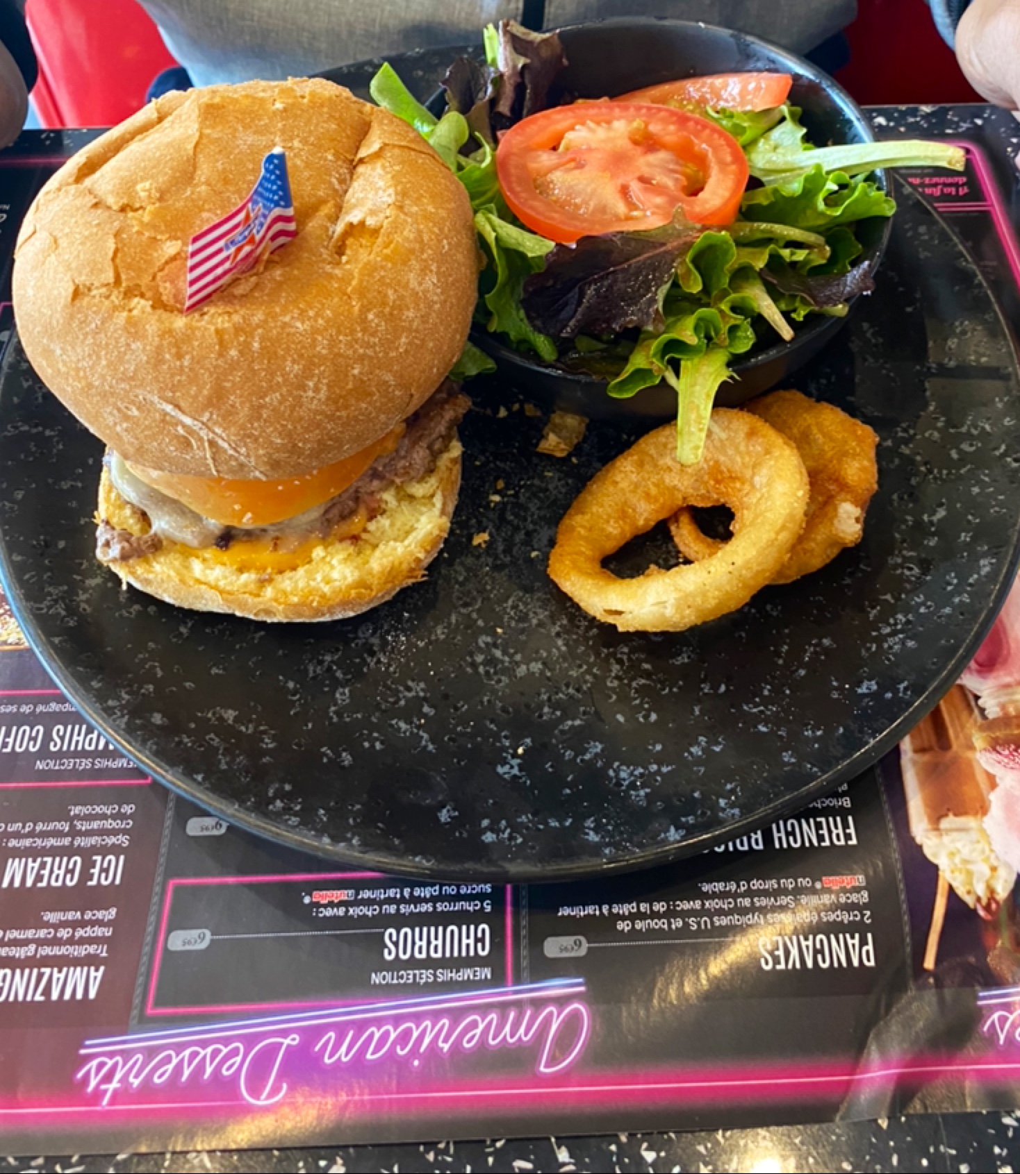 Plats typiques d'Amérique ! Hot dog, croc monsieur, chicken wrap, salades, burger de 1 à 6 steak ! Choix de boisson à volonté. Large choix dans les desserts : glaces Ben&Jerry's, milkshake, café gourmand (les gâteaux servis avec sont très petit) cookies, gâteau oreo, pancakes... Décors et ambiance des années folles, des néons partout, restaurant à 2 étages très colorés et plusieurs écrans TV. Musique ElvisPresley, Queen... De jeune serveurs et serveuses très agréable et souriant ! L'attente n'est pas très longue... Nous avons l'habitude de venir en famille pour nous laisser voyager vers les États-Unis !