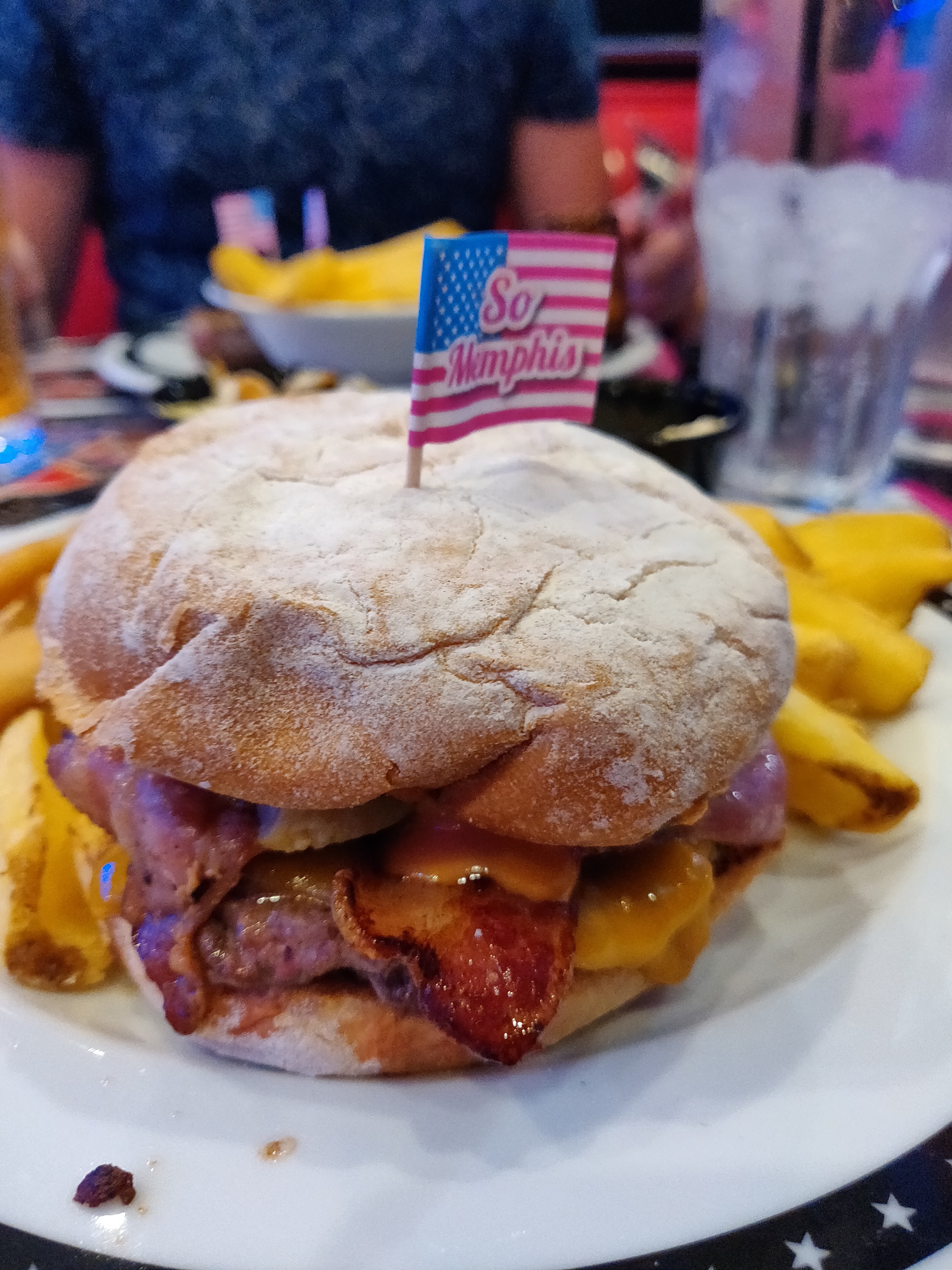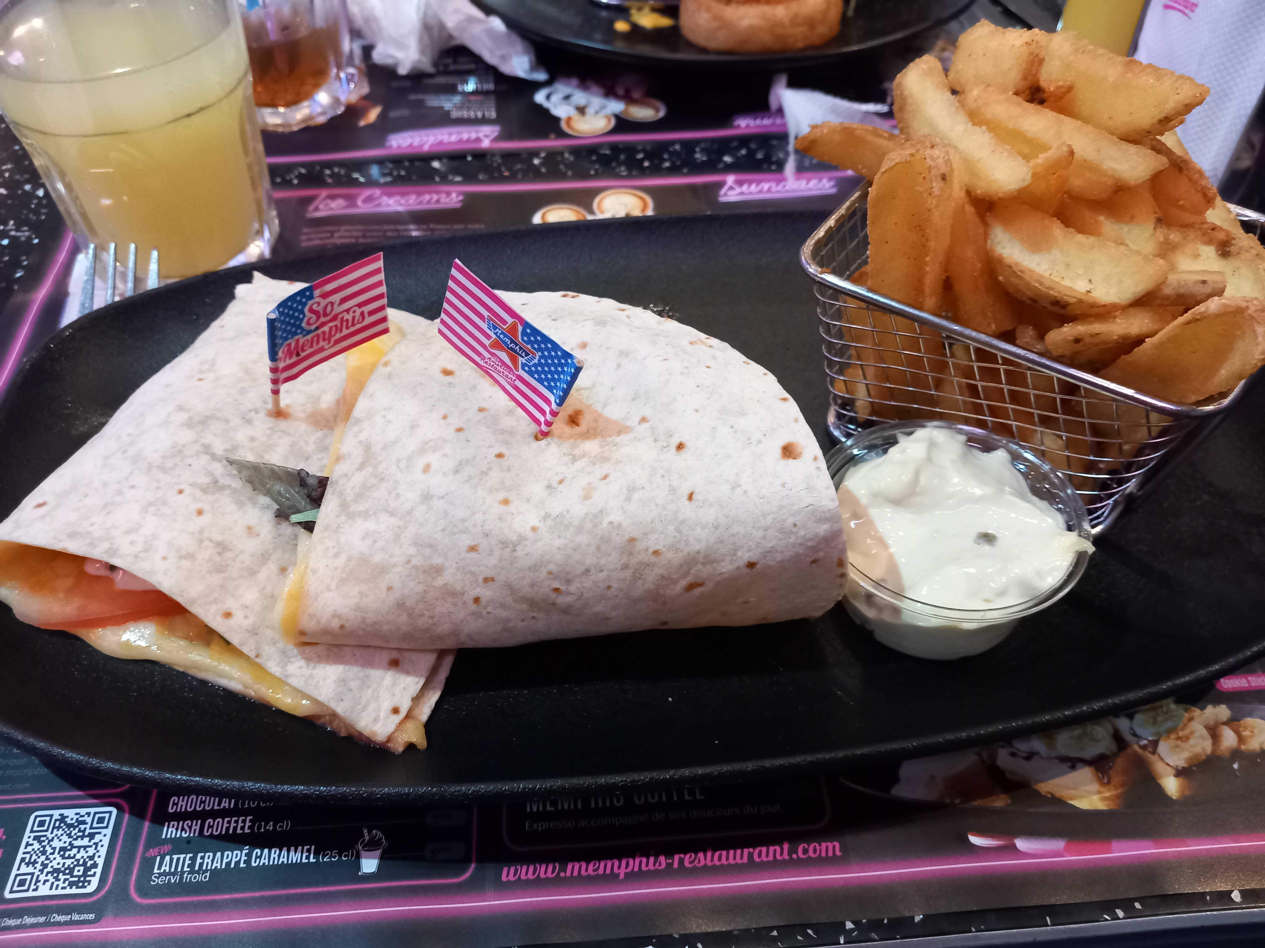 Première visite à Memphis et j'ai particulièrement adoré la décoration du restaurant, on se croirait aux States. Cocktail Pina Colada Spicy un peu trop sucré pour ma part mais très bon. On a débuté le repas avec un Tapas Tower, vraiment très bon avec un bon point pour la sauce blanche qui l'accompagnait 👌🏽 J'ai terminé avec un hot dog. Serveuses agréables et patron très sympathique. Merci, nous avons passé une belle soirée 😘