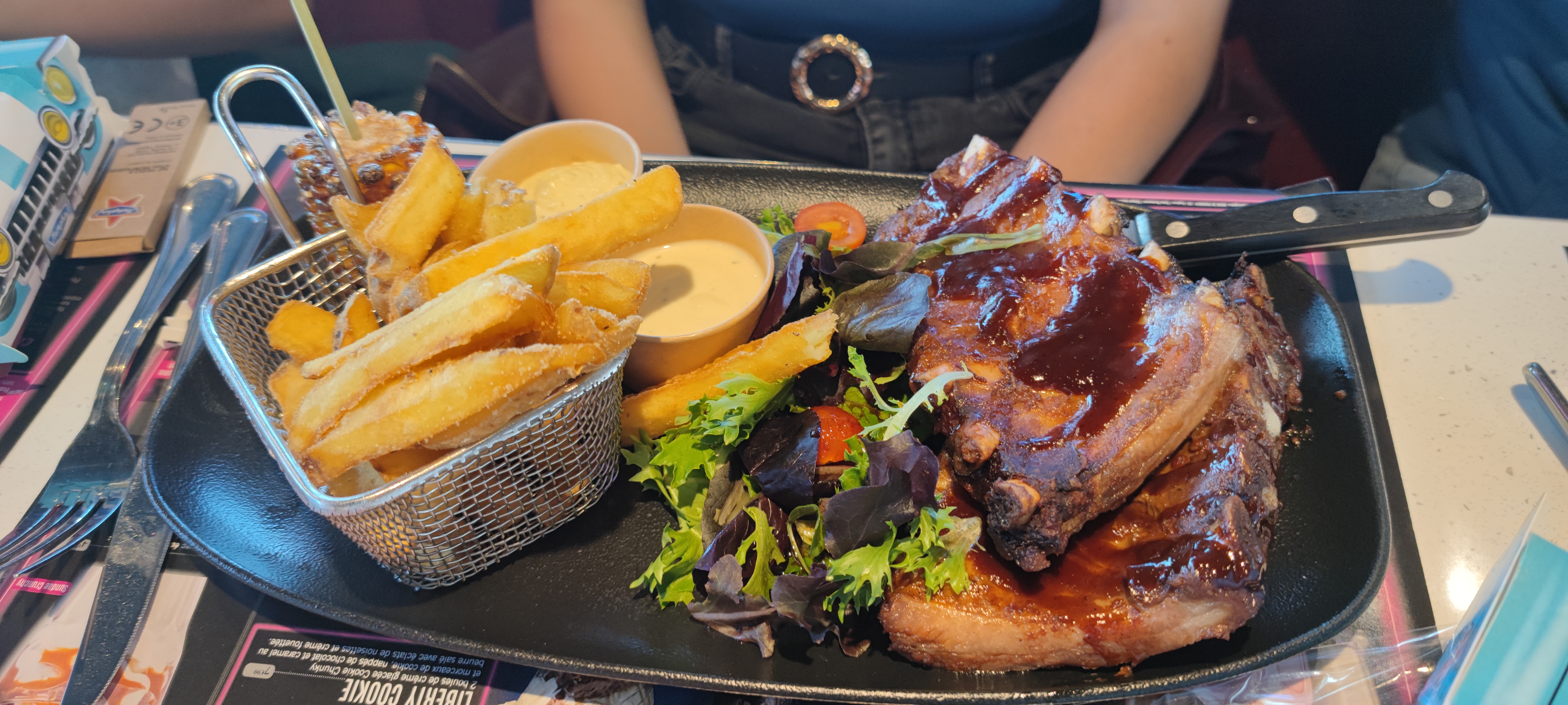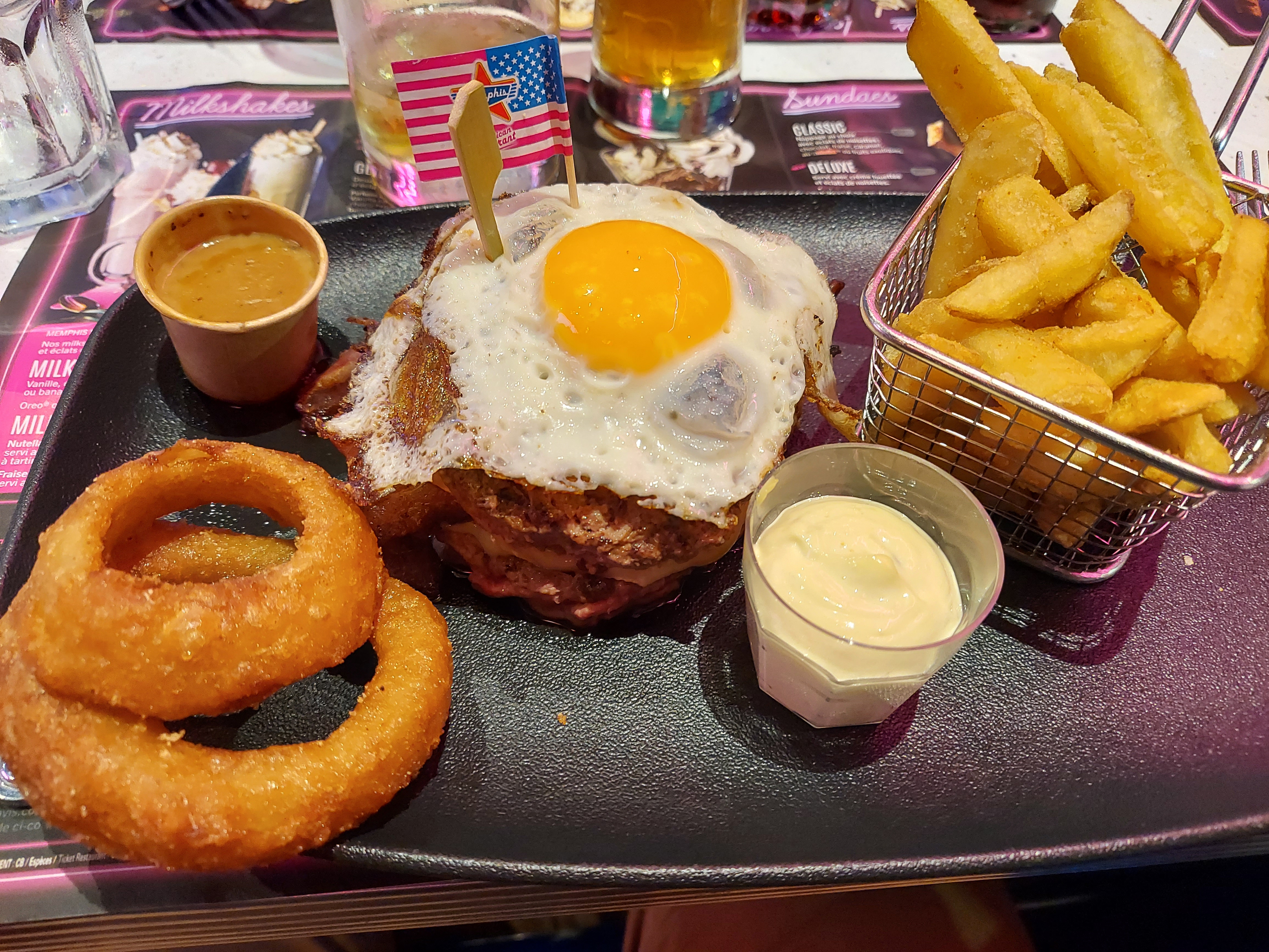 Belle déco. Mais vraiment trop cher niveau quantité/prix (ça goûte normal, rien d’extravagant). Guettez le nombre de frites que j’ai reçu. Jamais on revient.