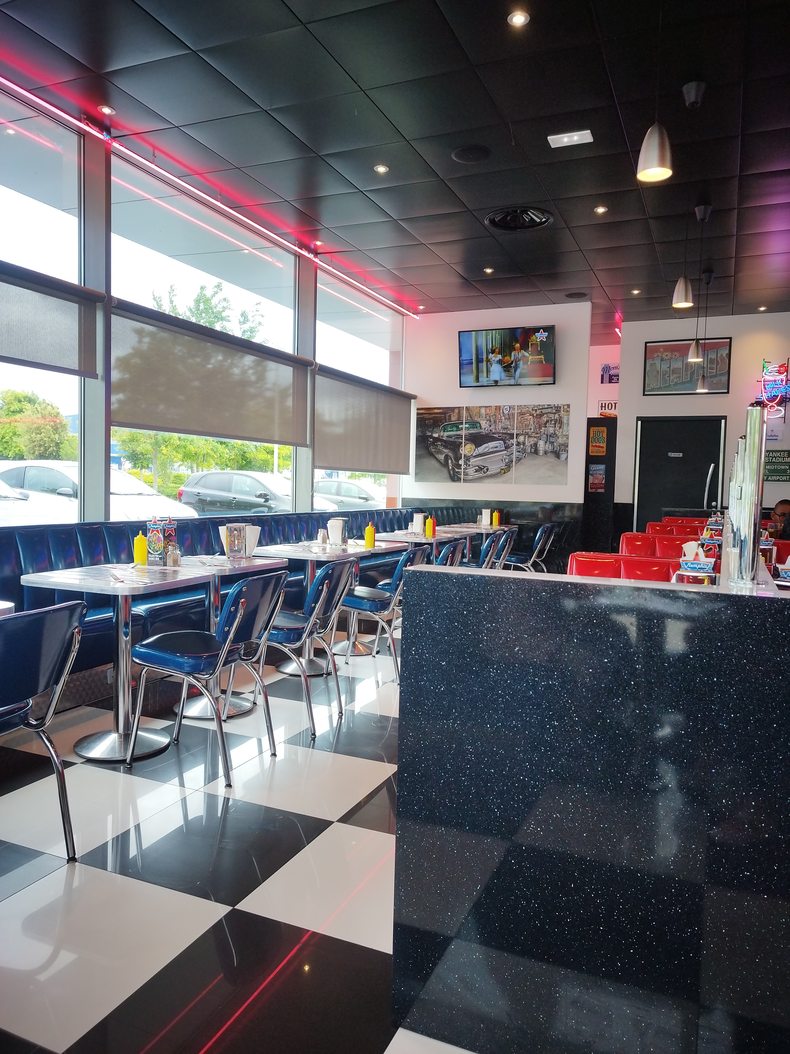 Dîner à l'américaine avec décoration très vintage années 50-60. Établissement propre. WC propres à l'intérieur. Personnel agréable et souriant. Bon rapport qualité/prix. Parking gratuit à proximité dans zône commerciale avec emplacement PMR.