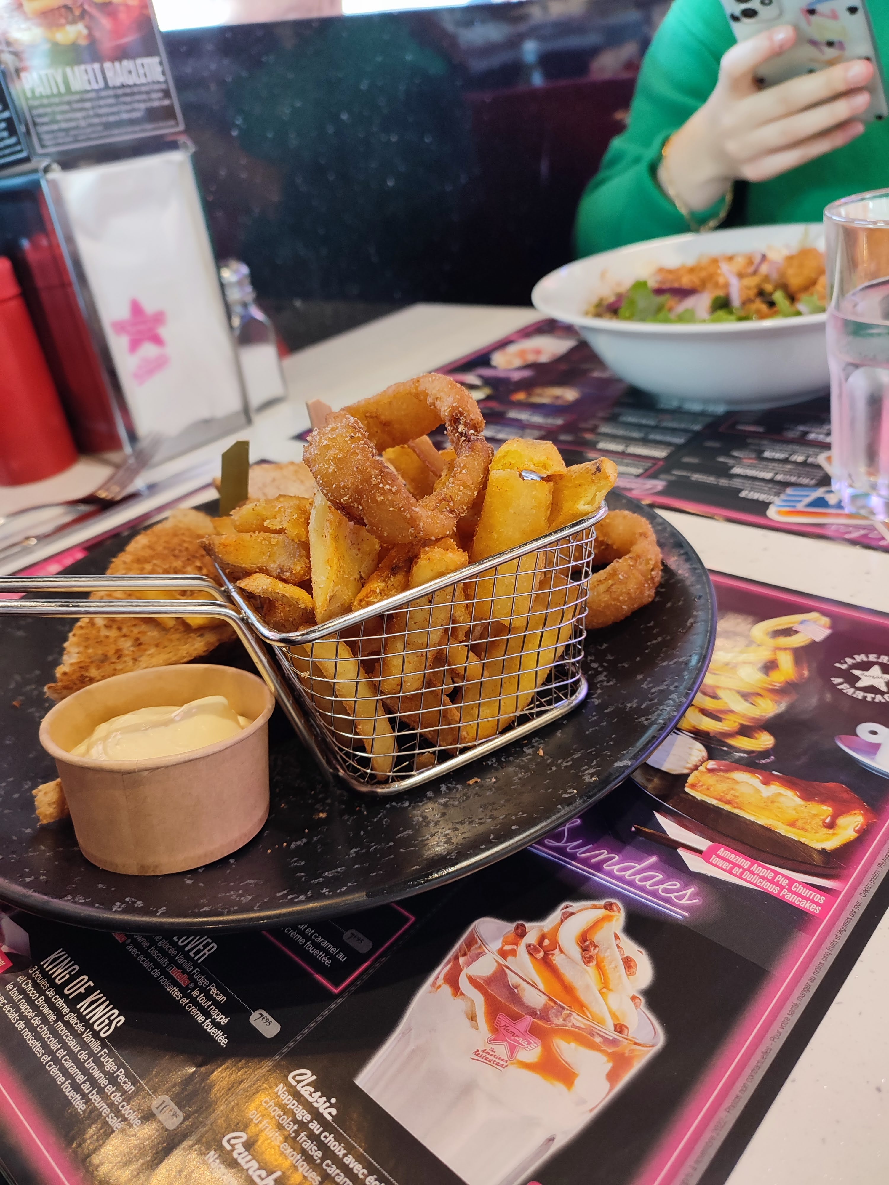 L'environnement est super, on se retrouve vraiment dans un Diner américain, l'immersion est réussie, les plats sont vraiment bien présentés et délicieux, il y a vraiment beaucoup de choix, c'est l'endroit idéal pour se faire plaisir. De plus, la serveuse qui nous a servis était vraiment aimable et agréable. Je recommande vivement !