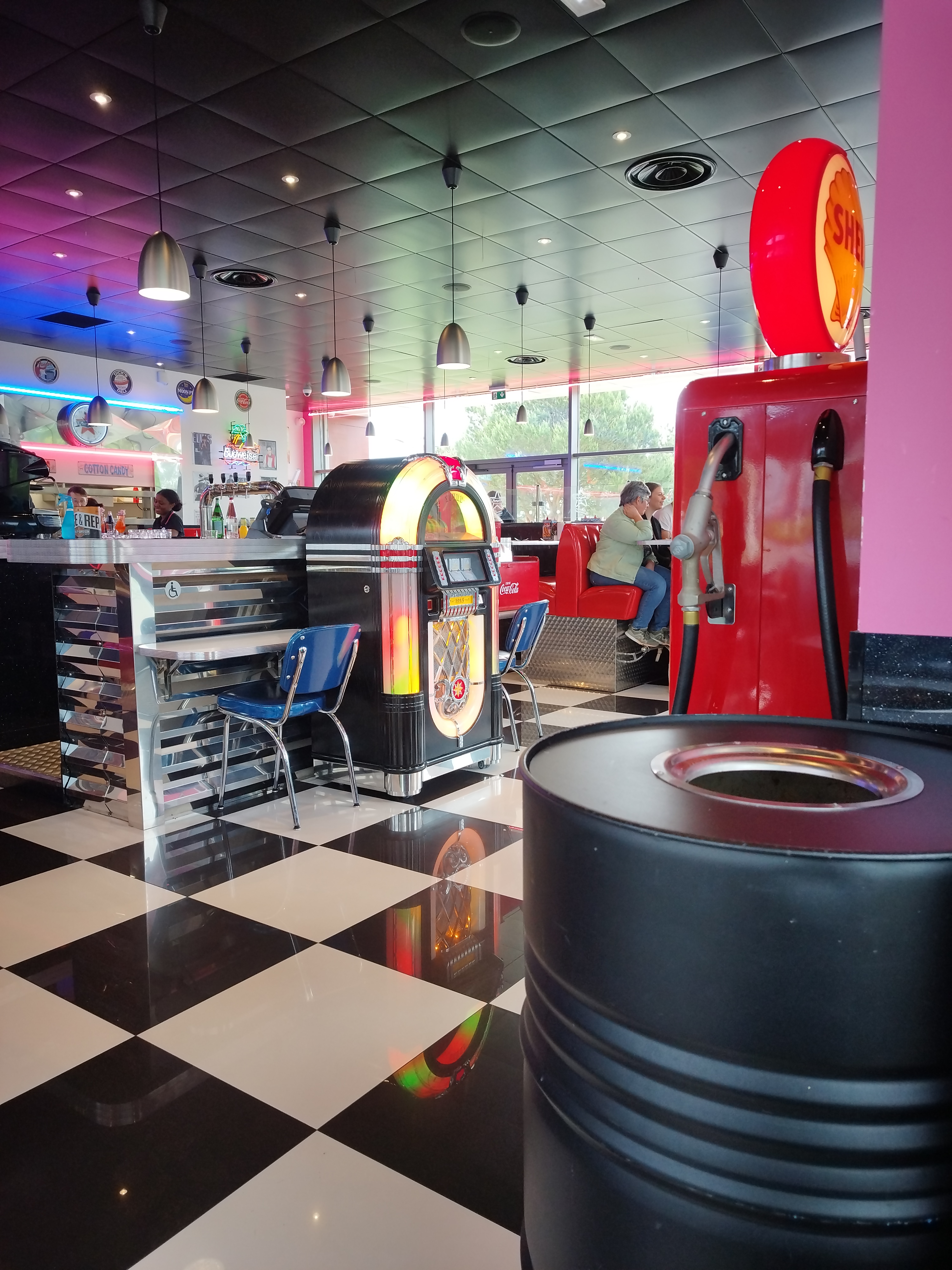 Restaurant Américain (les enfants et ados adorent) grand choix de plats et dessert à la carte ! Personnel sympa et accueillant. Dommage que la salle de restaurant soit si petite, on se sent un peu oppressé quand le restaurant est plein, et que plusieurs personnes font la queue dans le sas d'entrée ! Super sympa ce Jukebox à l'entre où l'on peut choisir la/les chansons que l'on veut (une fois qu'on a compris le fonctionnement) et c'est Gratuit !!!😀