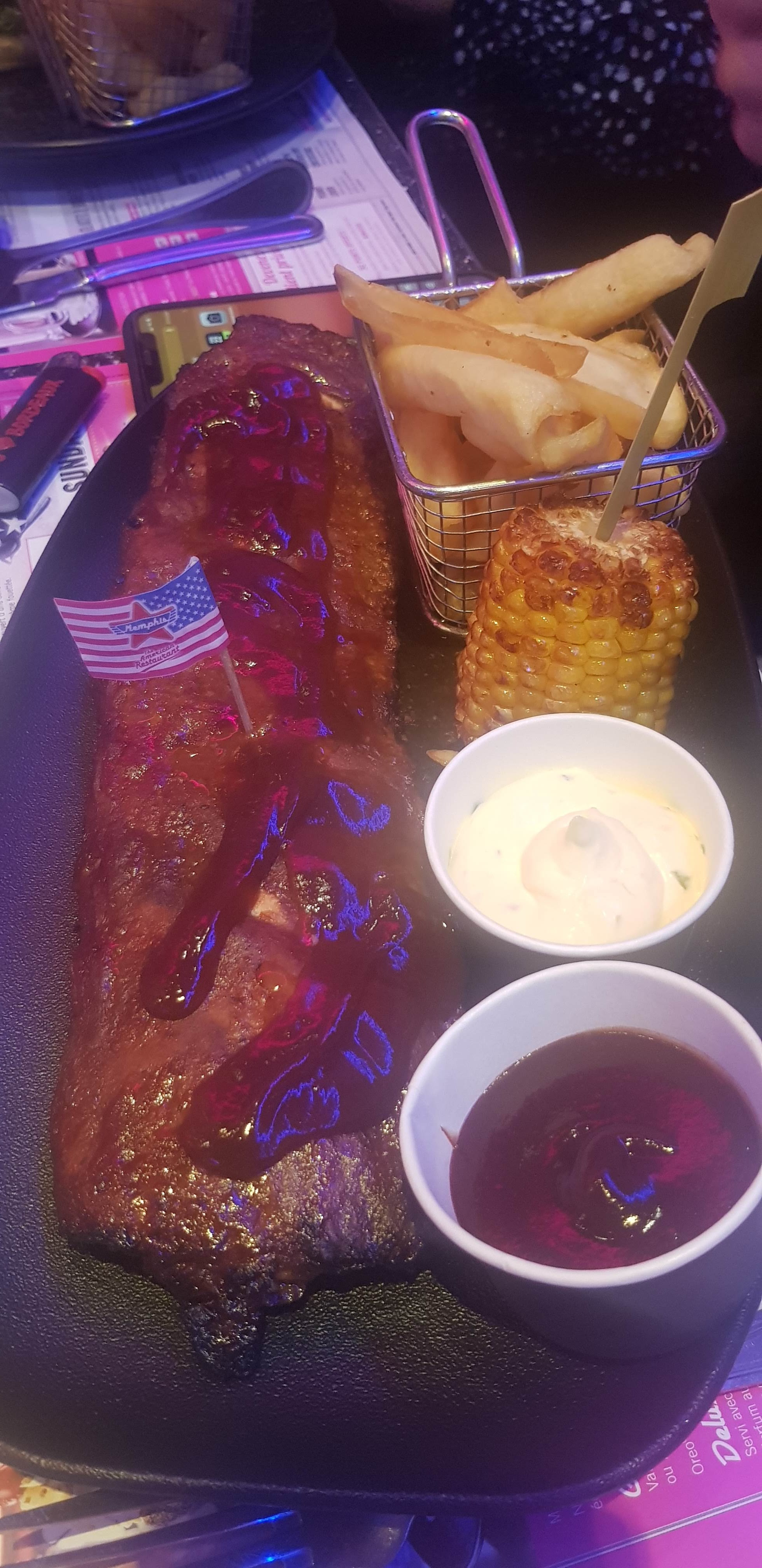 Nous avons passé une agréable soirée par contre il faut éviter d'avoir les yeux plus gros que le ventre si on veut bien tout finir!!! Mon chéri lui s'est éclaté le ventre avec le ribs ... la déco est belle et colorée mais c'est vrai que ça manque un peu d'ambiance ... dommage que la machine à glace était en panne ...