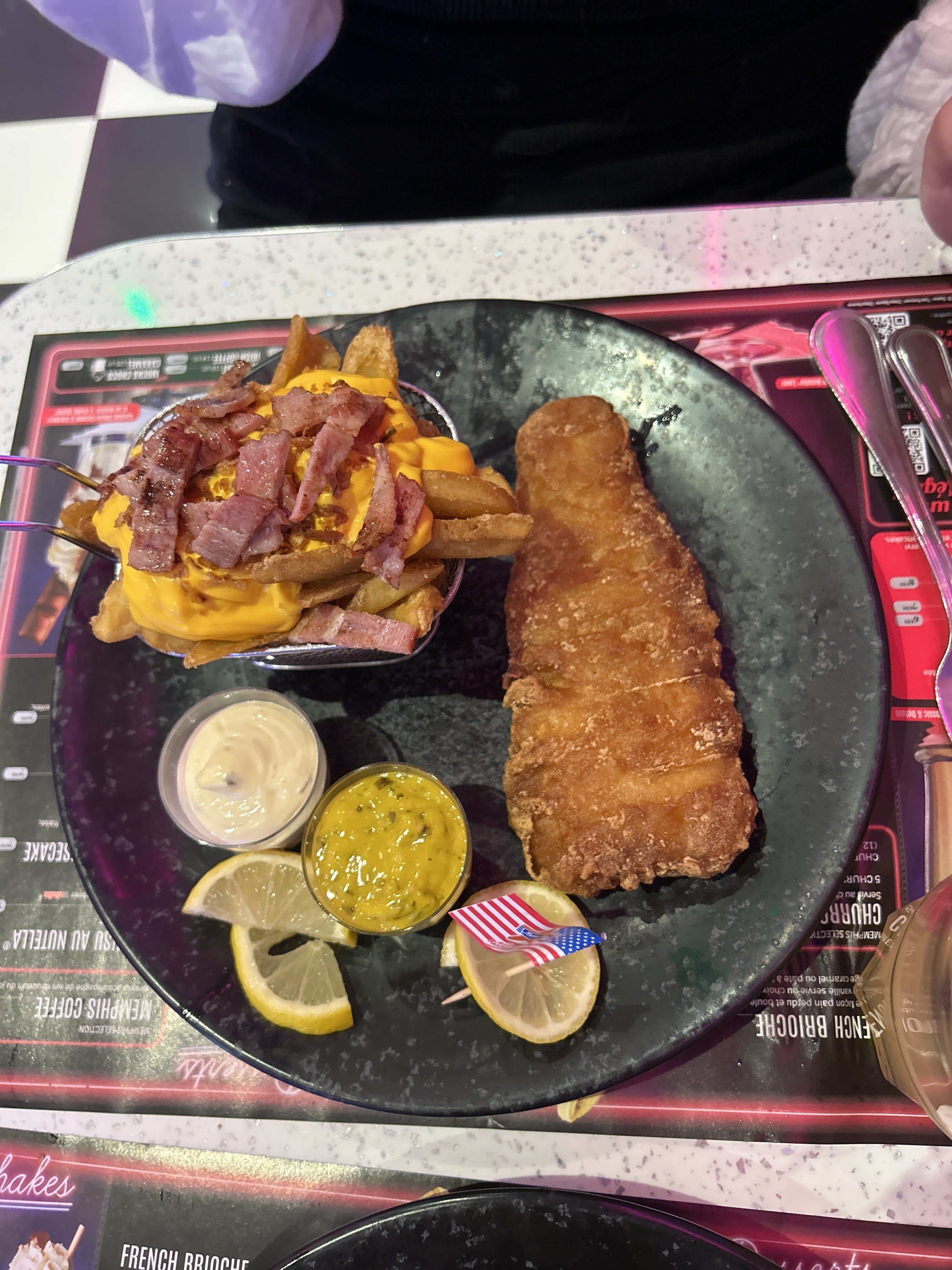 A notre arrivée restaurant fort bien décoré(thème d'halloween), plonger dans un univers USA. Personnel accueillant, très souriant, très gentil et serviable. Caissière/patronne aussi gentille que le reste du personnel. Repas succulent, carte des desserts très appétissante. Service rapide et efficace. Prochaine visite pour voir votre déco de Noël 😁 Très bon restaurant, merci de votre accueil.