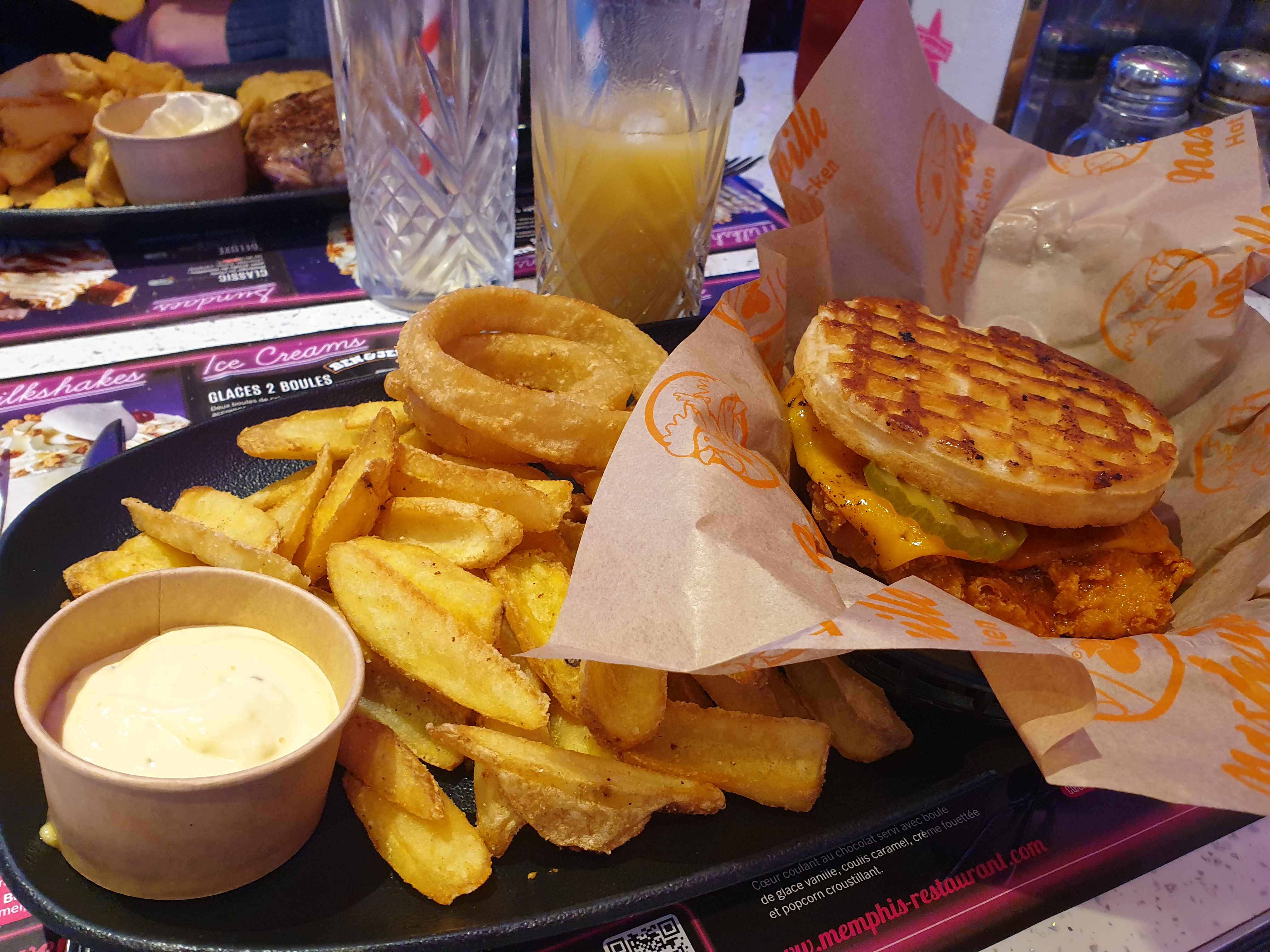 Bonsoir amis américains 🇺🇸 Je recommande fortement le Memphis si vous souhaitez passé un moment convivial entre amis ou en couple, les prix sont abordables côté plats je n'ai pas le sentiment que les prix aient augmenté avec la fameuse inflation . Attention toute fois au tenders de la nouvelle carte ils sont très épicés ca ne m'a pas dérangé mais certains pourraient ne pas apprécié. J'ai enlevé 1 étoile pour le côté frites surgelés c'est dommage vu le côté diner us qu'offre le lieu de ne pas aller au bout des choses mais cela demande de la main d'oeuvre en plus évidemment. Pour les gourmands, attention à la coupe king of the king qui est absolument GIGANTESQUE 🤣 Merci à tout le personnel présent le soir du 19 Juin ils ont tous été très adorable et très serviable ( augmentez les svp )