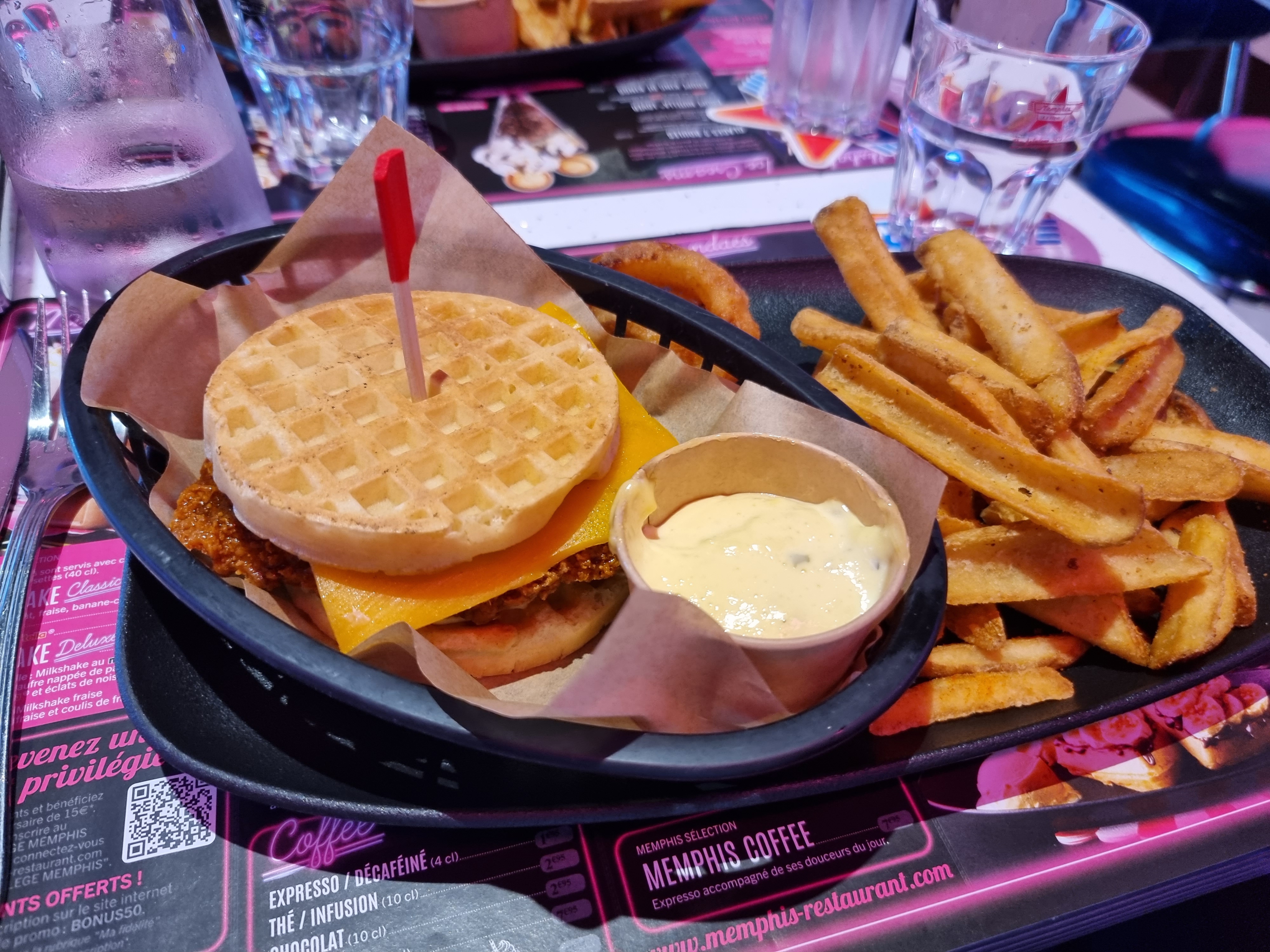 Je voulais vraiment aimer cet endroit mais cela a fini par être un peu décevant. Le service des serveuses non anglophones était très bon et mon manque de français était le seul problème. Les gaufres utilisées pour les burgers ne sont pas cuites sur place et sont sans goût ni texture. La viande des hamburgers est fade et pourrait nécessiter un peu d'assaisonnement. J'ai commandé du poulet avec le plus haut niveau d'épices - ce n'était pas du tout épicé. Nourriture très moyenne livrée à des prix premium. Cadre charmant et personnel adorable cependant. Le service est inclus, mais si vous souhaitez donner un pourboire aux serveurs, vous ne pouvez rien ajouter à la facture lorsque vous payez par carte, vous aurez donc besoin d'argent supplémentaire. Pas étonnant mais certainement pas mauvais.