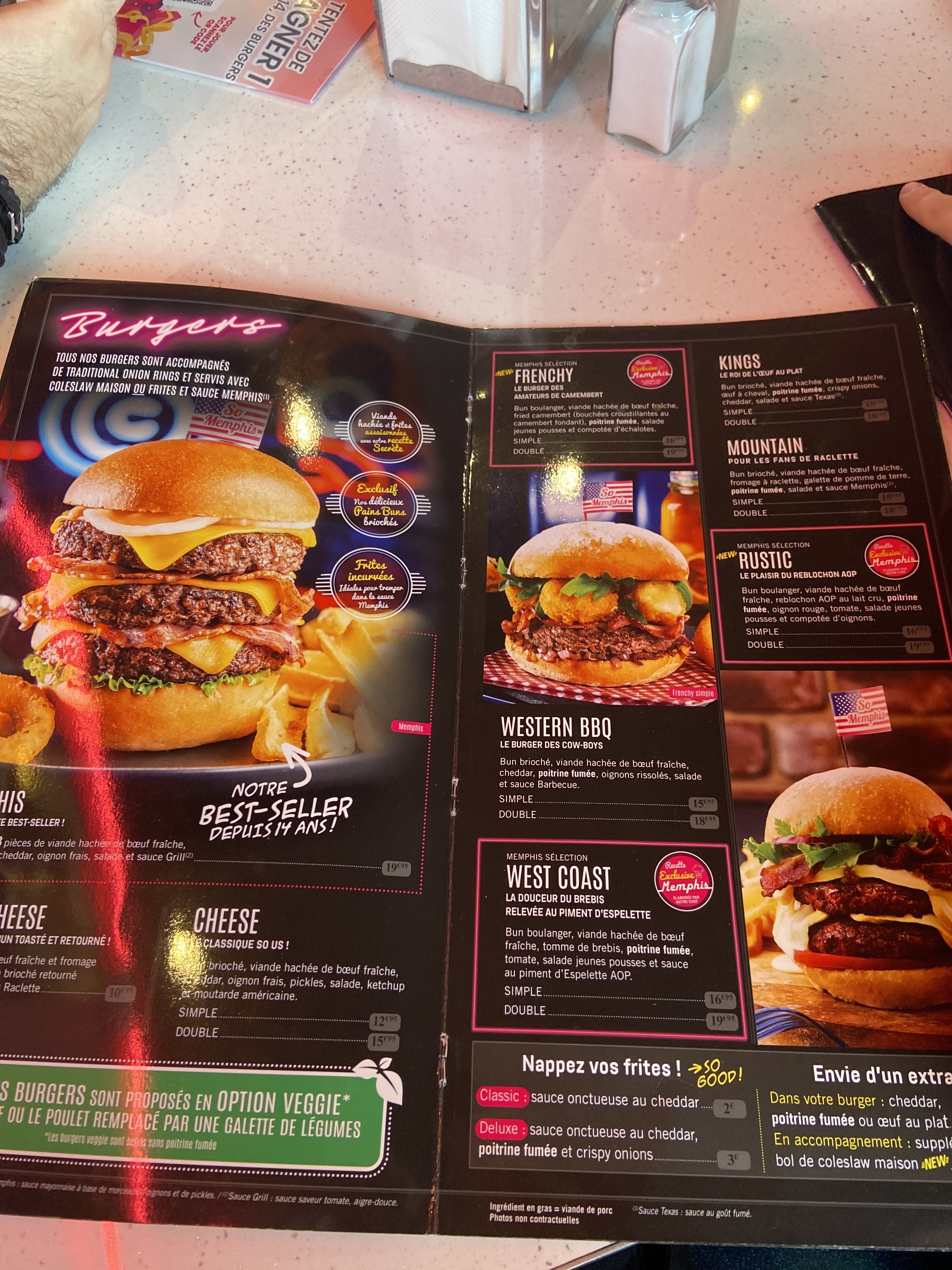 Personnel peu agréable. Cuisine : Plats corrects, mais la sauce cheddar était froide. Les boissons en bouteille étaient chaudes... Le milkshake n'était pas bon. Plus de lait qu'autre chose. J'ai longtemps cherché la glace vanille, et même le goût de la vanille... en vain. Je l'ai signalé au moment du paiement. Il a été retiré de l'addition. Pour une première chez Memphis, nous avons été déçus.