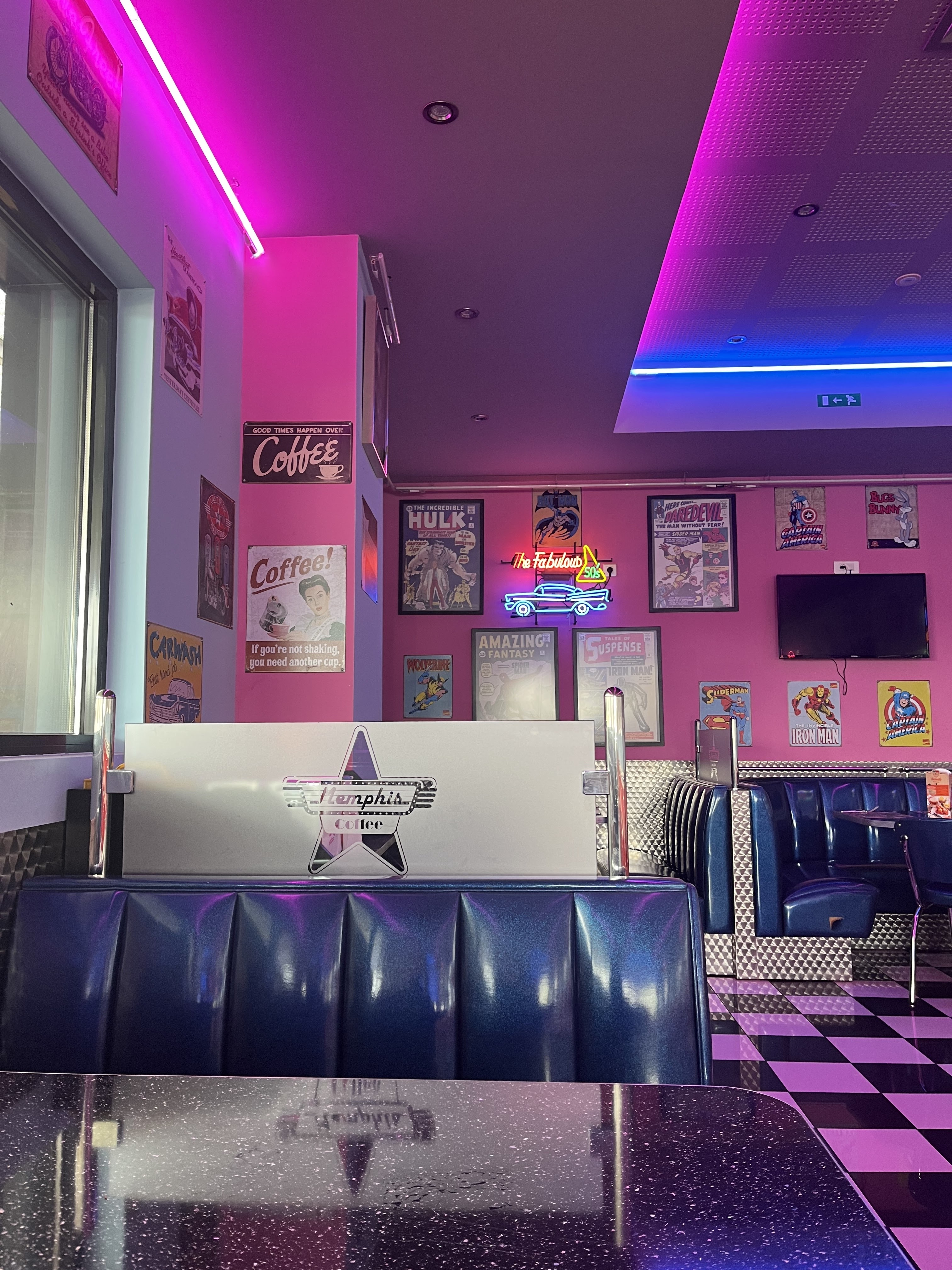 Un peu bruyant et le délai entre les plats est un peu longuet mais la serveuse est très avenante et serviable. L’ambiance 50’ est très agréable