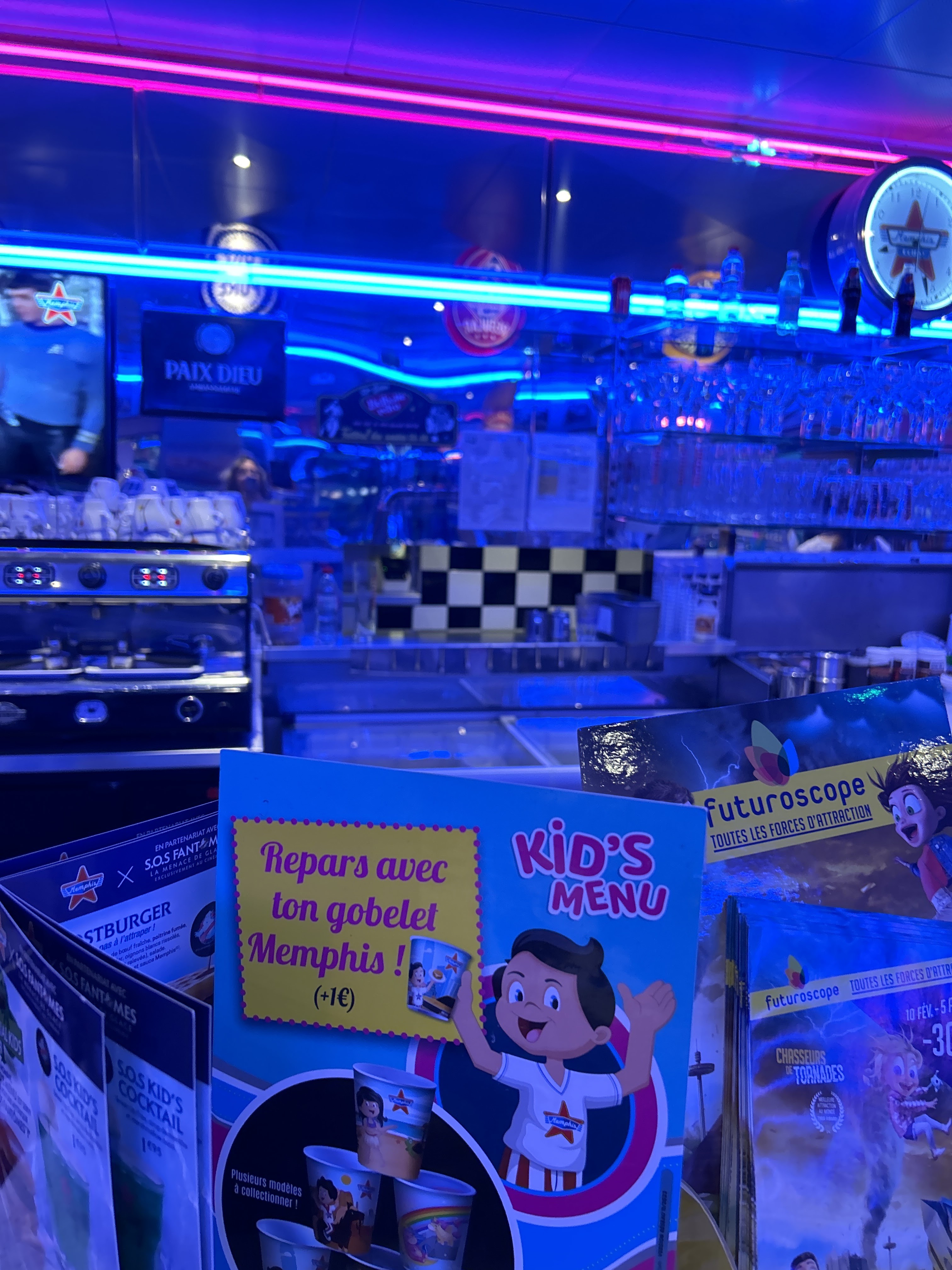 Un restaurant parfait dans le thème américain éclairé au néon blue et rose magnifique un agréable moment passé et très bien accueilli par Justine très souriante et à l’écoute on y mange bien et y boit aussi pour passé un un petit moment tranquille je ne peux que recommander merci beaucoup ☺️