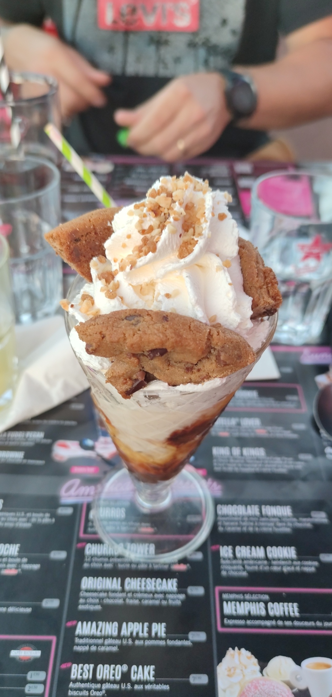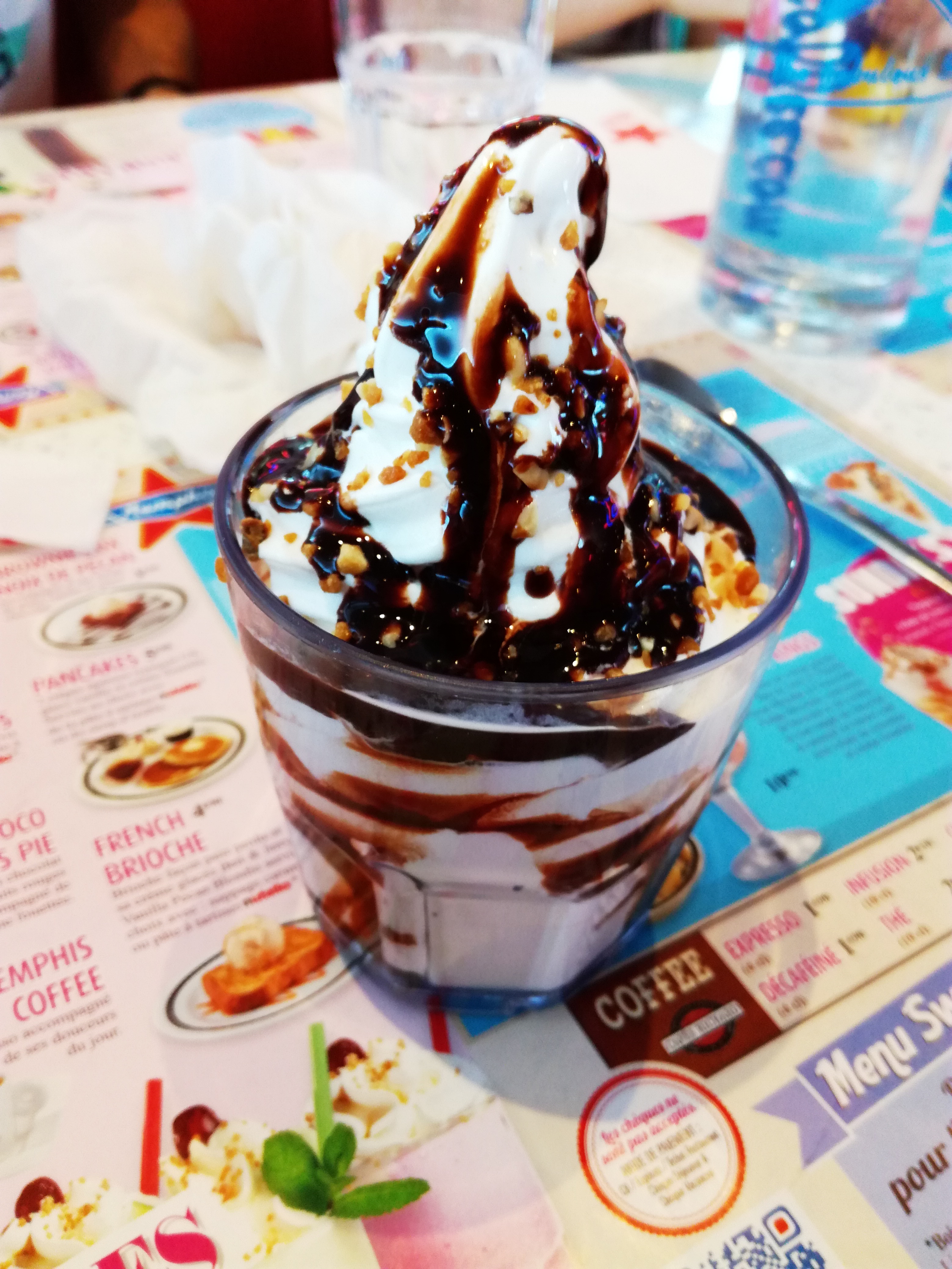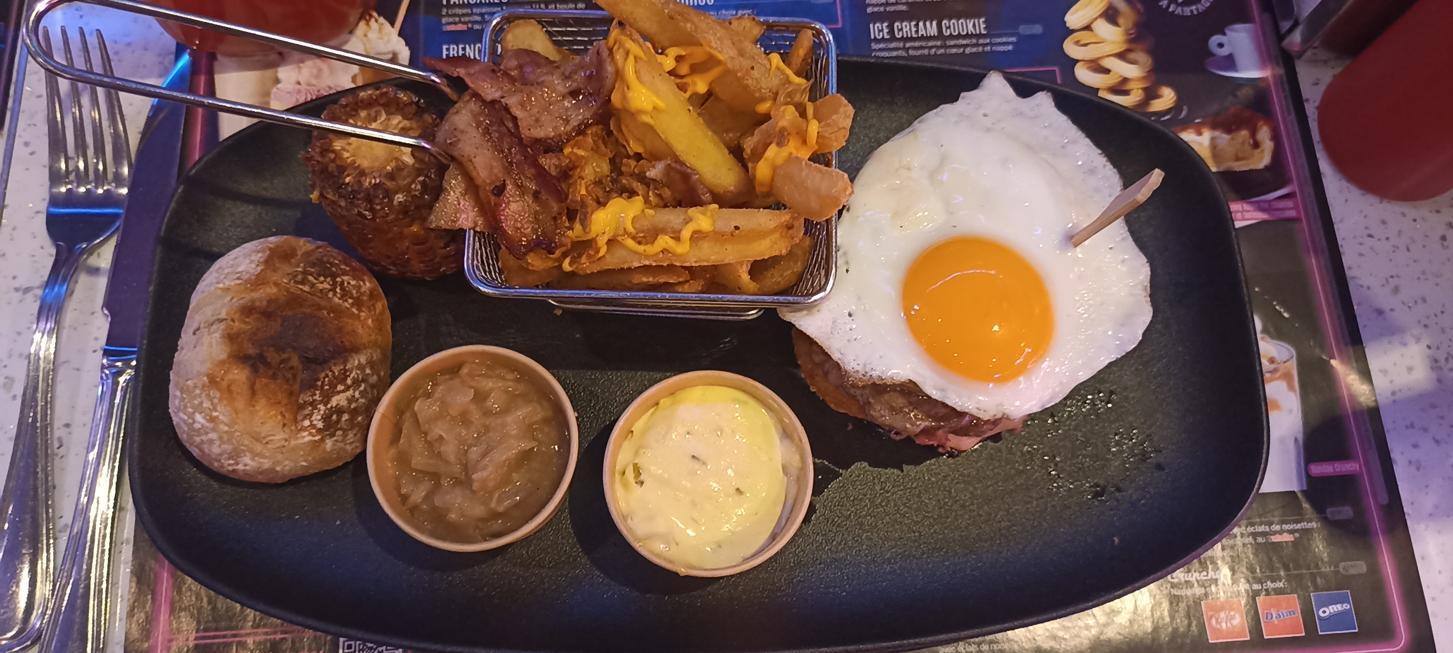 Viande demander saignante reçu un peu trop cuite. Pris un café gourmand, pas génial non plus point de vue goût. Je pense que le burger a 6 steak (si la cuisson est bonne) et mangeable, si vous l'avalez ils offrent un sundae... Ambiance sympathique