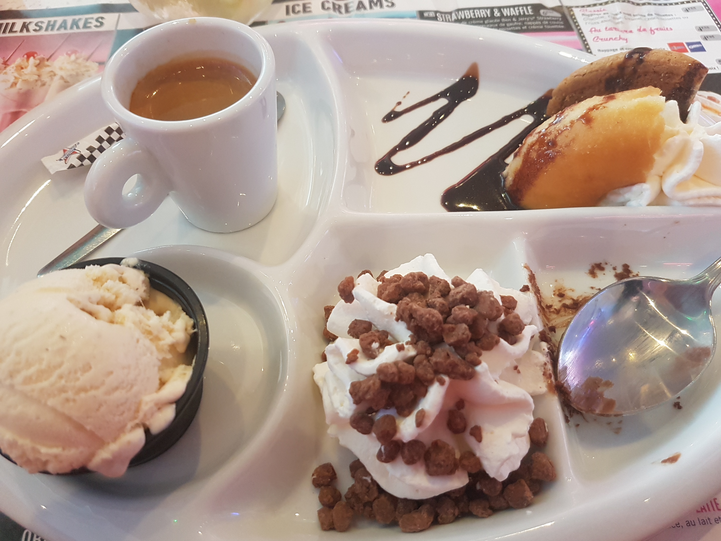 Plats copieux de l'entrée au desserts. Service rapide et très sympathique. Ambiance rétro qui colle bien au décor. Petit bémol une cuillère sale.