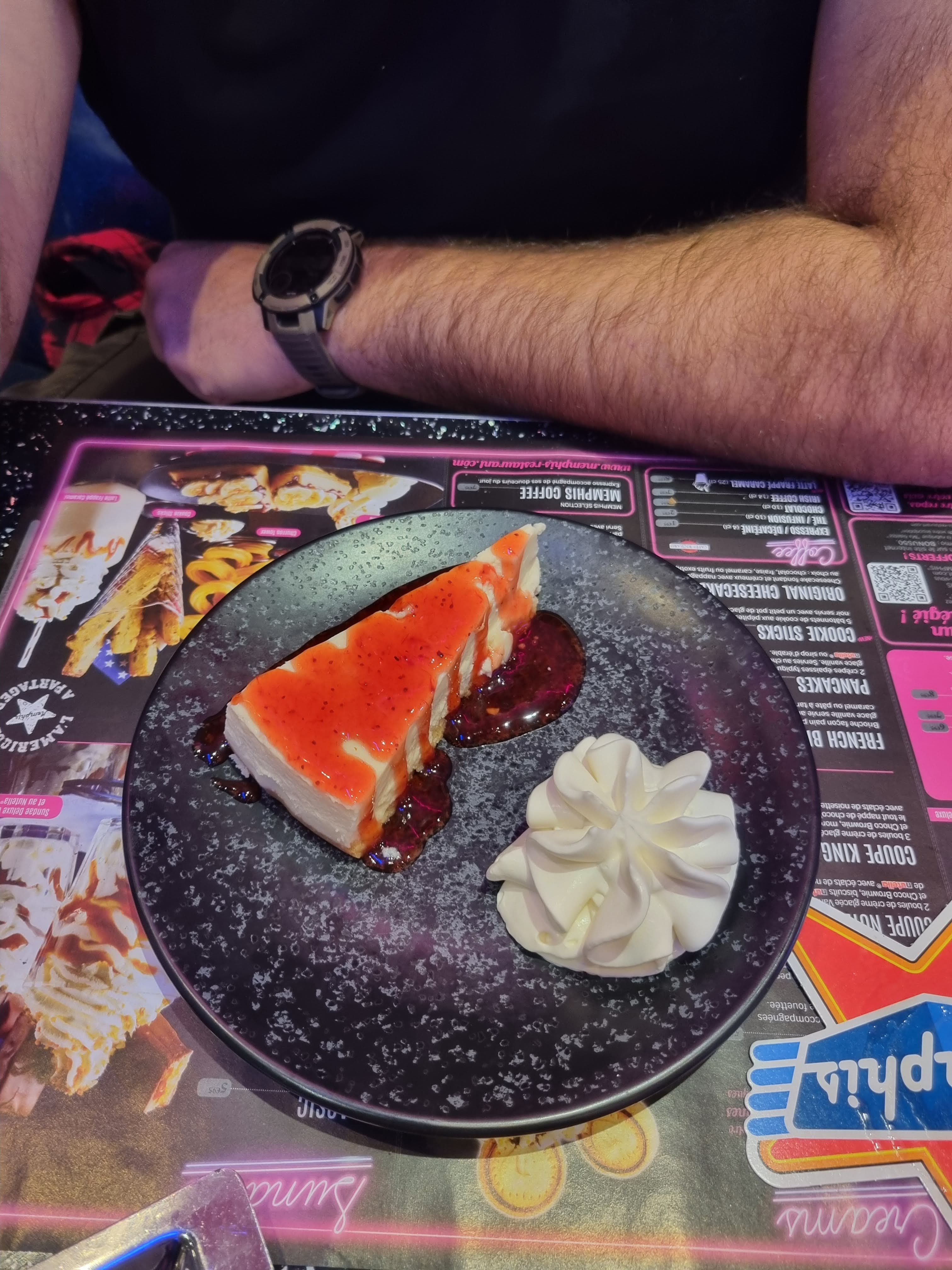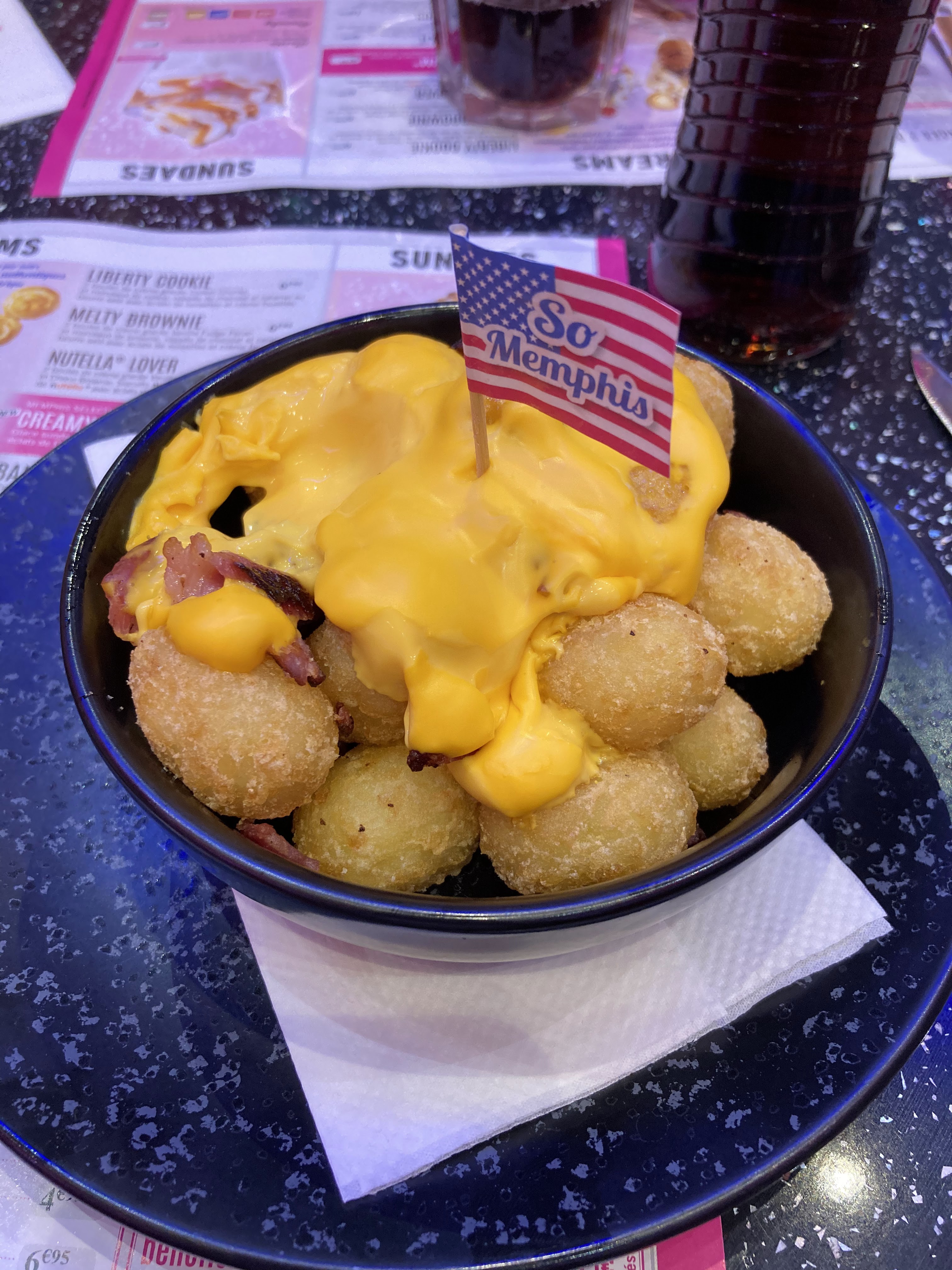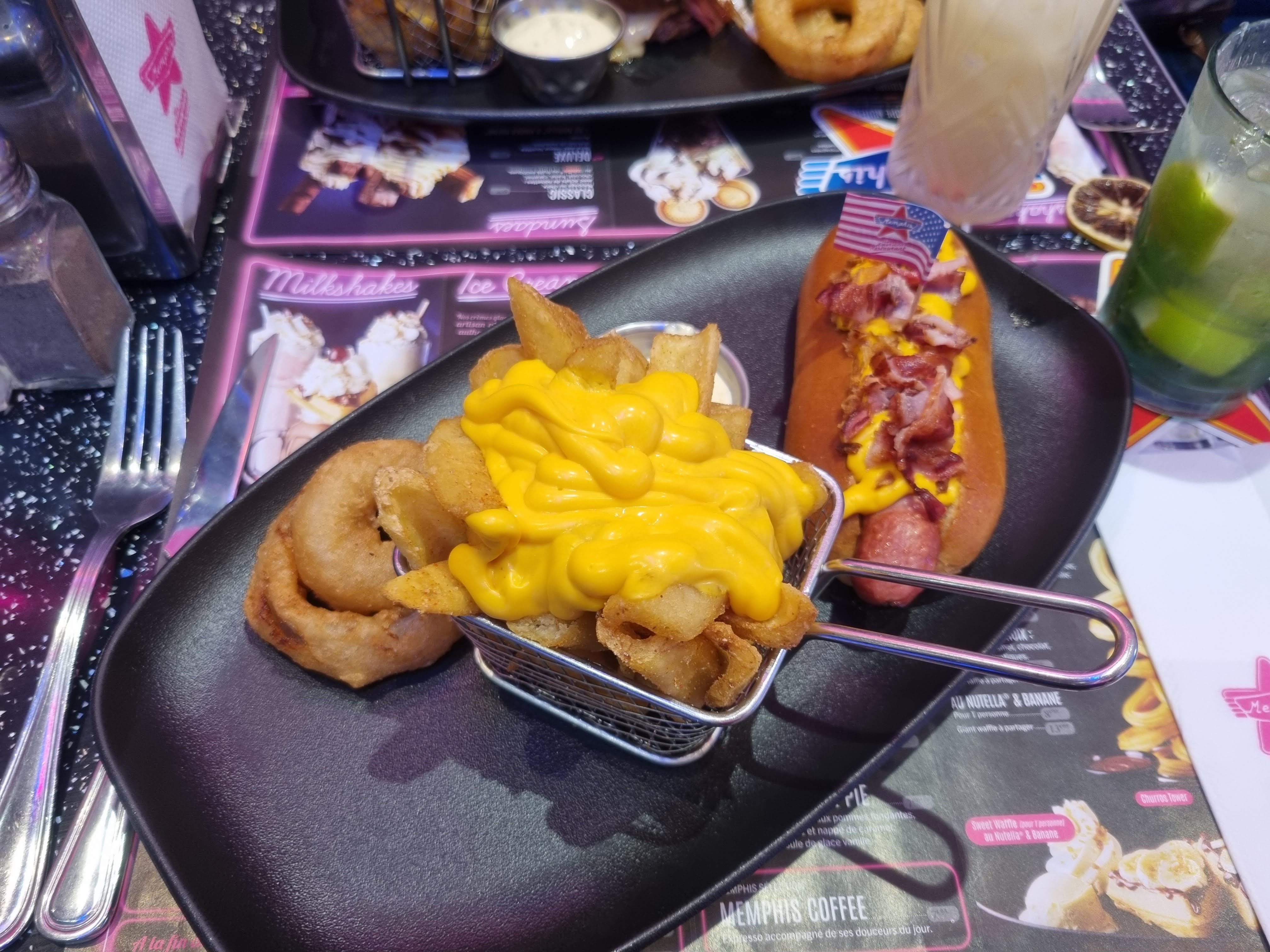 Restaurant américain très sympa, coloré et tourné vers Elvis PRESLEY, personnel à votre écoute, sympathique mais quantité trop copieuses à mon goût. Beaucoup de Menu le midi, très peu le soir. Donc obligé de commander à la carte. Nous y sommes aller avec Mon chéri cette semaine. Il a pris en cocktail un Red Moon et moi un Sunlight. Très beau et très bon. En entrées : 1 fries bacon et moi un traditional onion rings. Bien présenté, bon également. En plat : 1 Macaroni & Cheese et moi un cow-bow hot-dog raclette. Très bon mais très copieux. En dessert : 1 Sweet lover à partager pour 2, Vraiment succulent mais j'aurai aimé pouvoir choisir le coulis du cheesecake. En boissons finales : 1 Iced coffee latte et moi un chocolat chaud avec chantilly et marshmallow. Mon chéri n'a pas aimé et dit que c'est spécial et qu'il faut aimer et moi je n'aime pas les marshmallows et personnellement j'ai trouvé qu'il y avait un goût très prononcé d'eau (Je préfère chocolat de chez moi pour le coup). Excellent rapport qualité + quantité / prix, pour tout ce que j'ai énoncé au dessus nous en avons eu pour 70.70€.