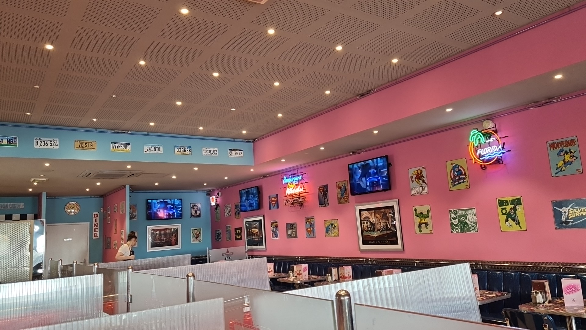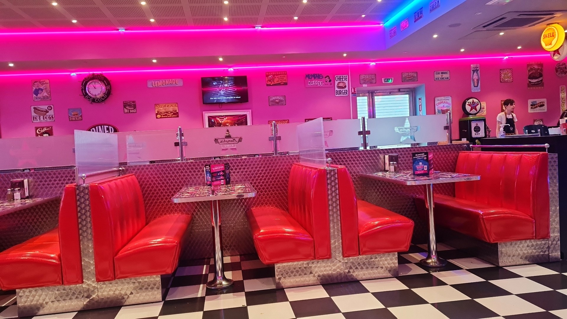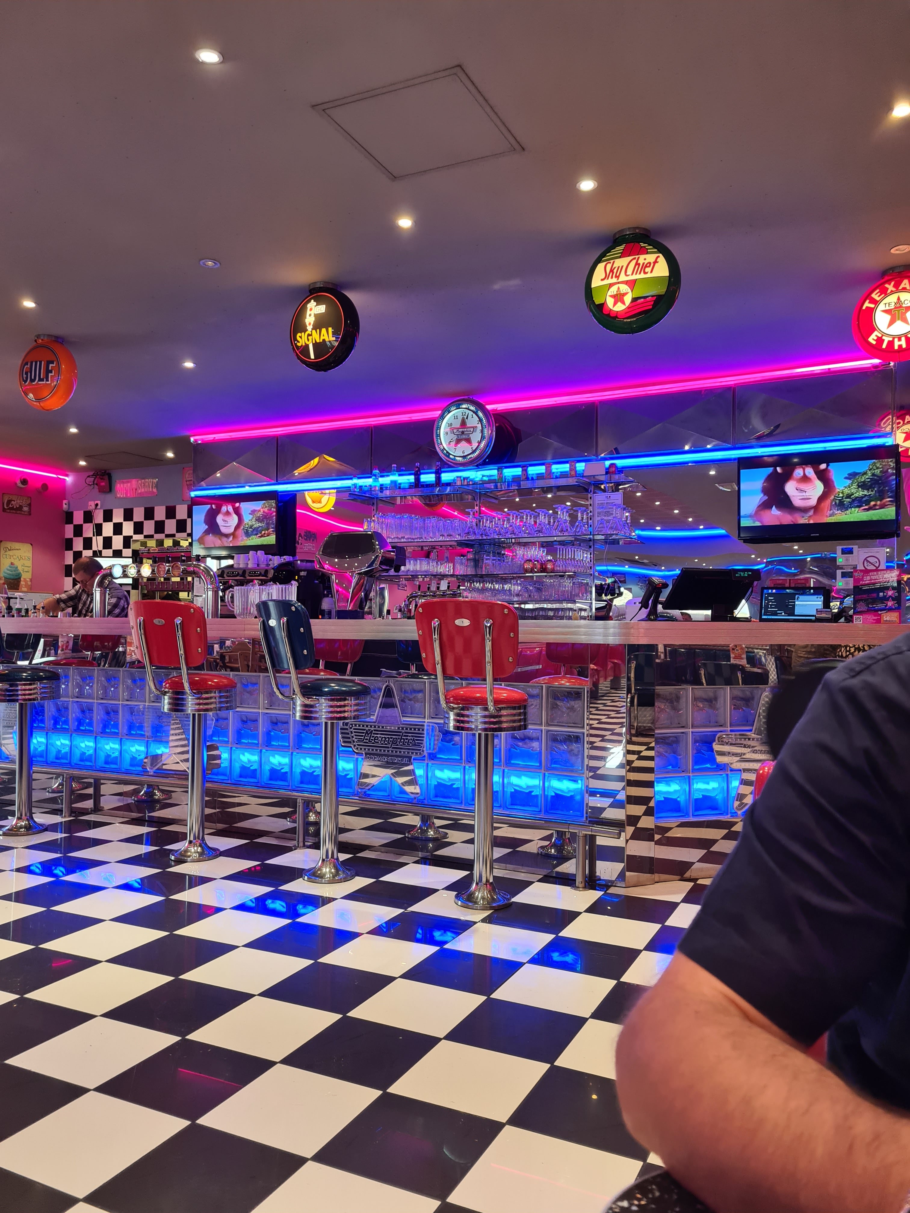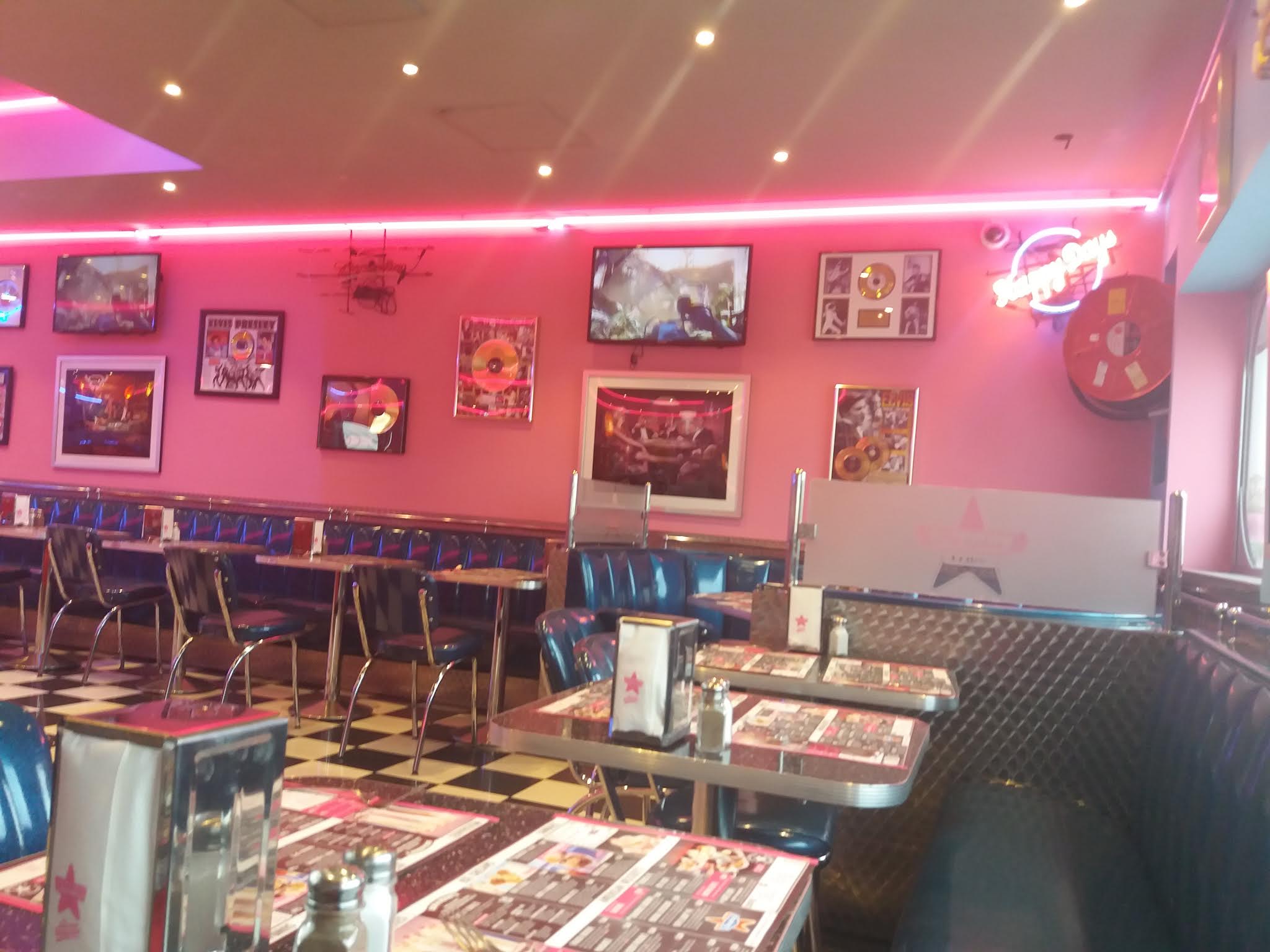 Restaurant type Dîner américain. Décoration et LEDs néons/ banquettes etc... Qui mettent directement dans l'ambiance. Serveurs sympathiques, les burgers sont bons, moins aimé les hot dogs. Prix dans la moyenne.