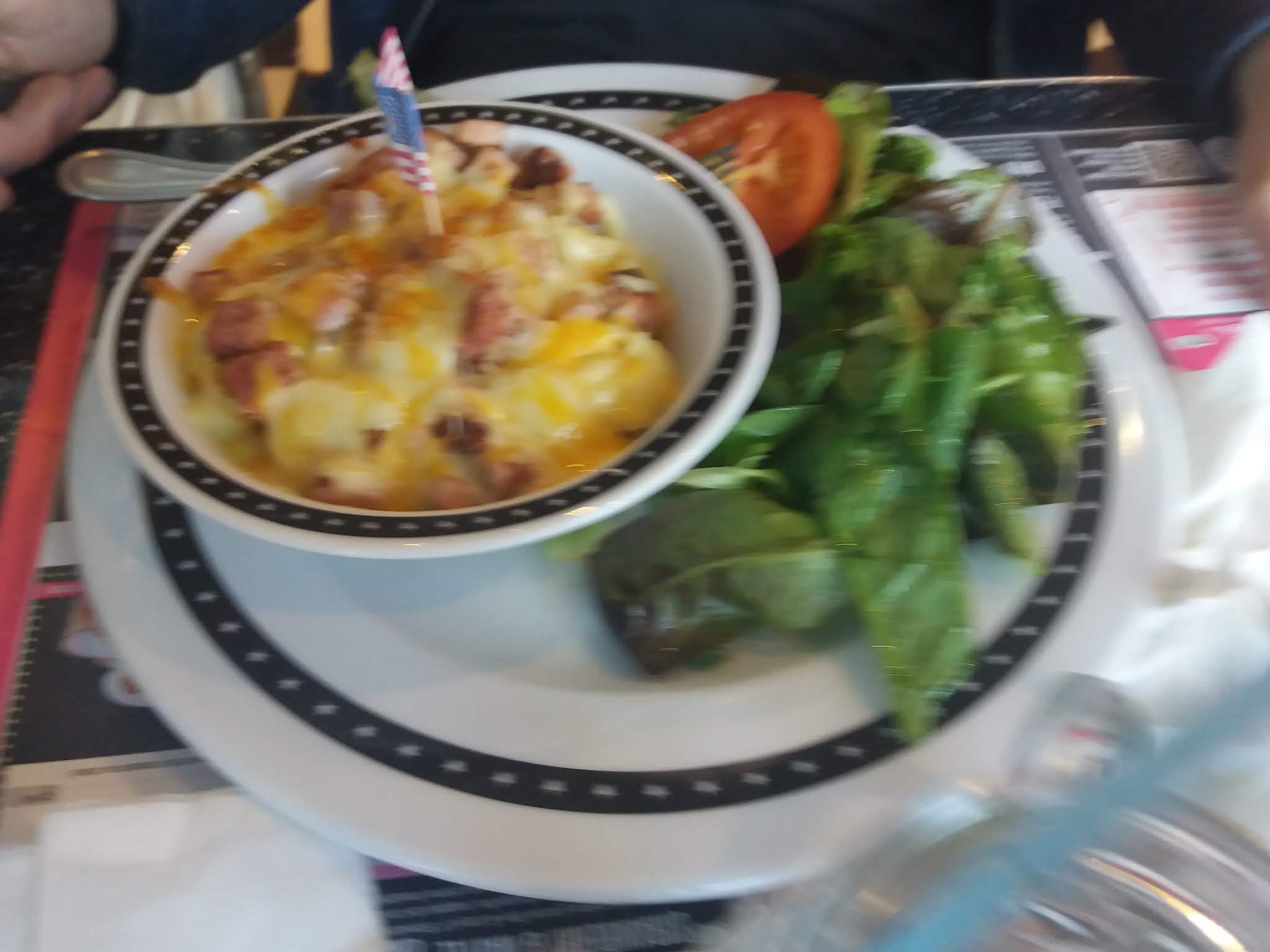 Très belle déco et ambiance américaine ! Le service et l'accueil étaient très bien, peu d'attente, personnel agréable et repas très bon. Le seul petit bémol était la propreté des banquettes.( un petit coup d'aspirateur entre le dossier et l assise serait bienvenue).Cela ne nous empêchera pas de revenir !