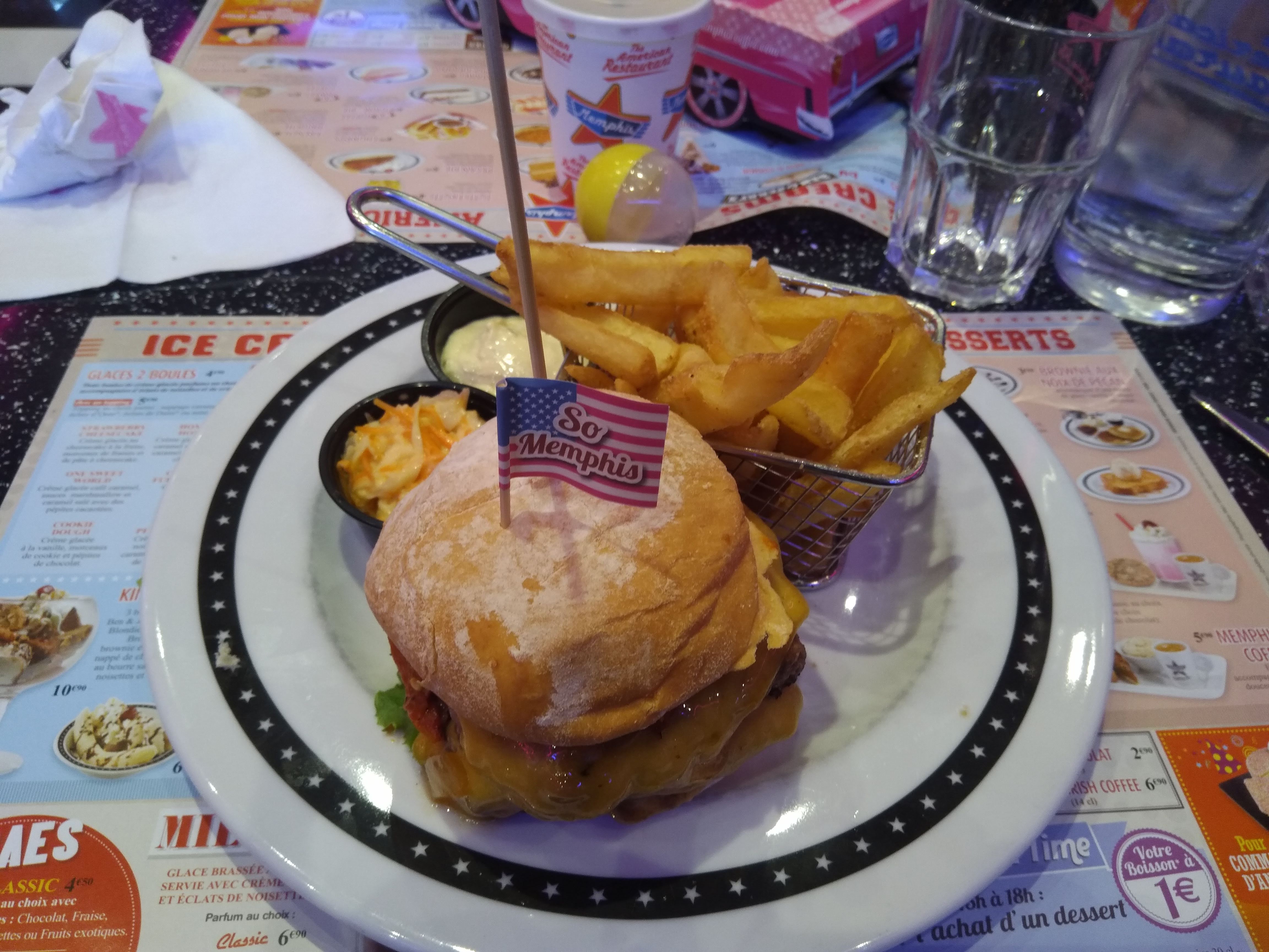 Pour notre déjeuner de ce samedi midi, nous avons choisi Memphis. D'abord les menus enfants : rien à dire à part que les filles étaient ravies de leurs cheeseburgers et de leurs glaces au chocolat servies dans des contenants très originaux. Maintenant les menus adultes : deux excellents burgers bien copieux. Et concernant les buns, vraiment excellents, rien à voir avec ceux de la restauration rapide, ils sont tendres avec beaucoup de goût. Nous avons fini le repas une coupe glacée avec des morceaux de brownies et un banana split que nous avons beaucoup appréciés. Prochaine étape, le défi Crazy Memphis ! Merci pour qualité de votre cuisine.