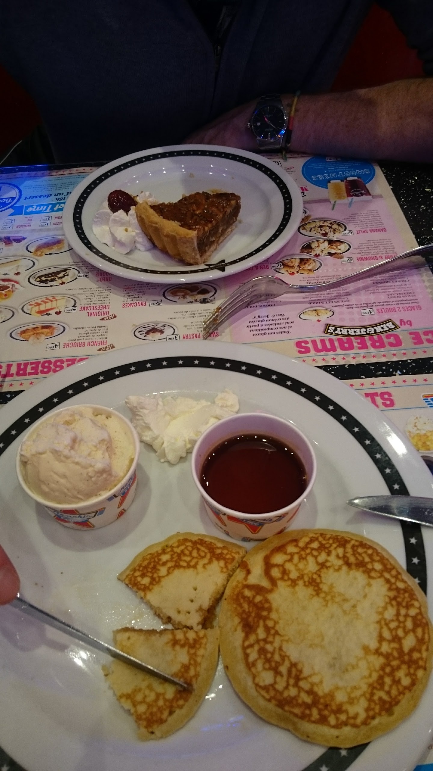Le serveur n était pas aimable. Il a amené une cuillère pour manger des pancakes. Les pancakes étaient froids. Le dessert devait être servi avec une boule de glace vanille et j ai eu une boule au chocolat ( que je n ai pas mangé). La chantilly était chaude. Le serveur n a pas répondu quand on lui a dit au revoir. Il était plus occupé à discuter avec ses collègues assis au bar. Très déçue...