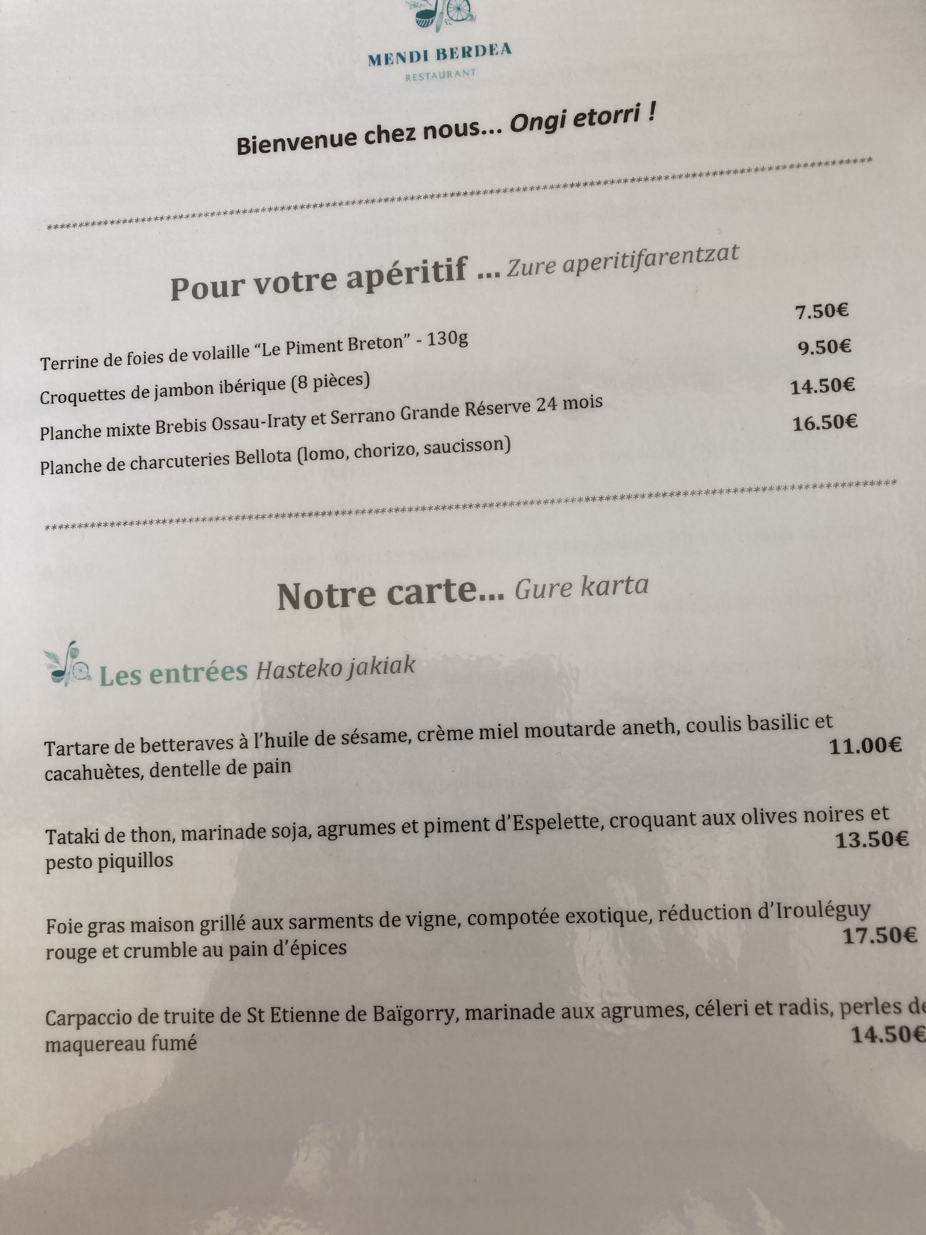 Un bon petit restaurant avec des saveurs de saisons le service très agréable bonne ambiance je recommande ce petit restaurant en visite au pays Basque 😊😊😊