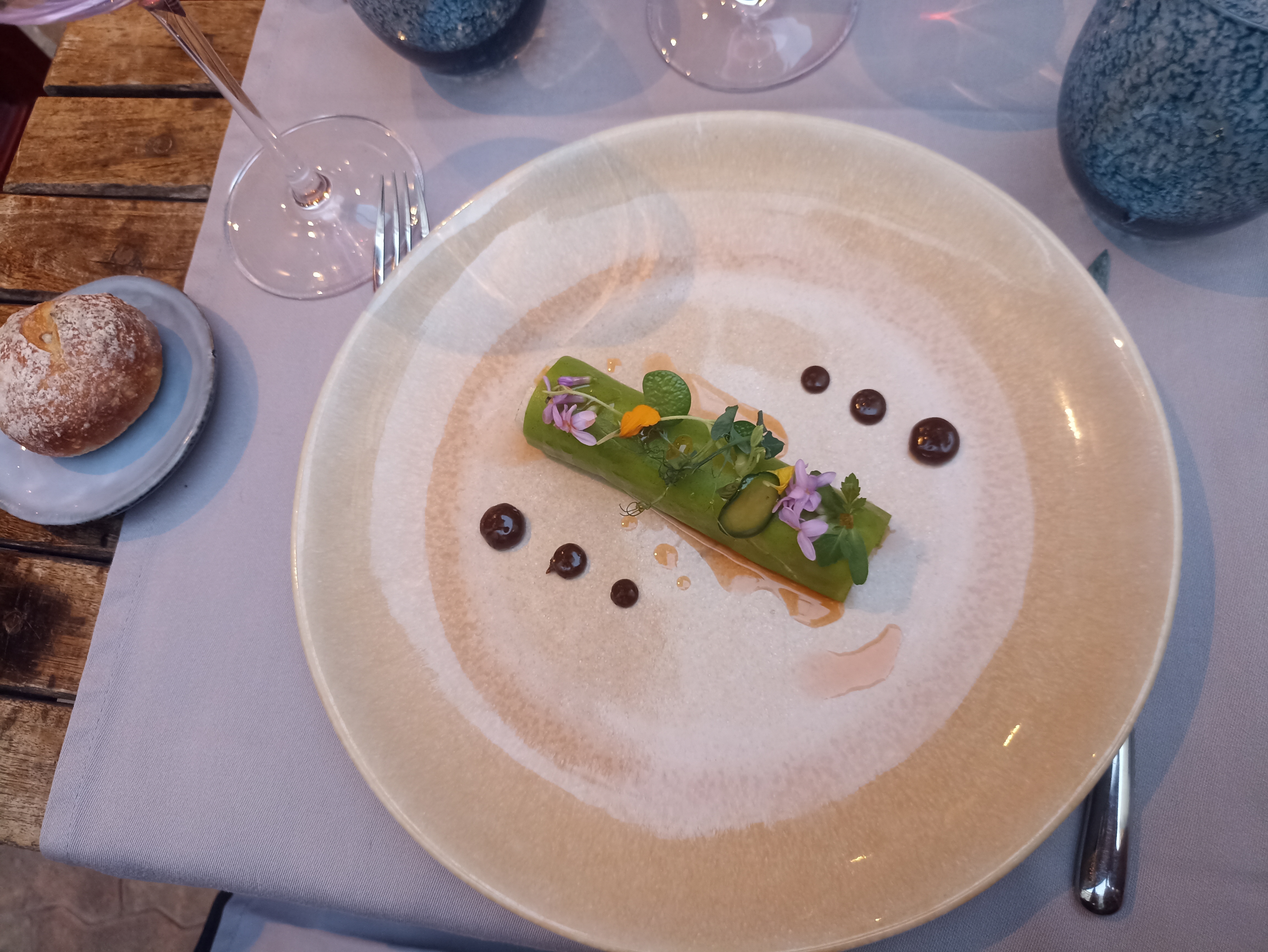 Déjeuner en 8 services. Les plats sont d’une excellente qualité gustative et la technique est maîtrisée. Belles présentations. Il s’agit d’un menu de découverte de saveurs car les portions sont vraiment petites de l’ordre de 3 cm pour le filet de maquereau, 4 cm de boudin blanc de petit diamètre (mais sublime), et ceci pour tous les plats. Nous avons trouvé les vins un peu chers, avec une absence sur la carte des vins proposés au verre et facturés 9€ pour 6cl pour un AOP de pays.