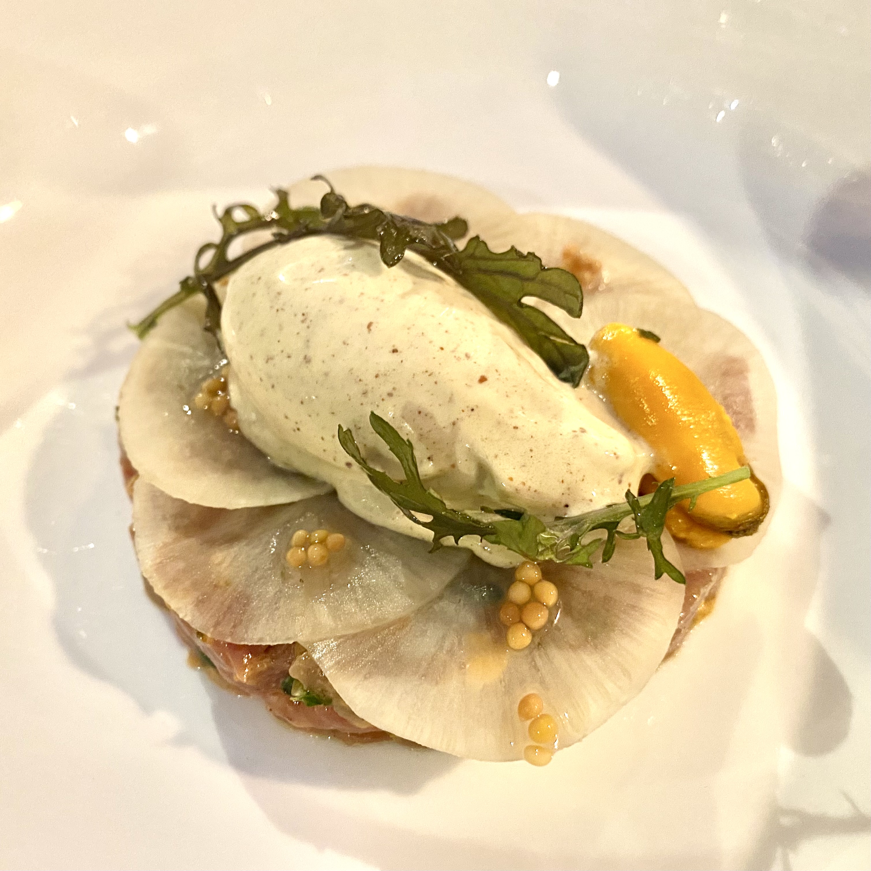 Un serveur agréable mais néophyte ne nous a proposé la carte que 20 minutes après notre arrivée, et il ne la connaissais pas au point de nous proposer un menu découverte au choix (alors qu'il s'agit d'un menu fixe). C'est extrêmement décevant d'attendre 40 minutes et de recevoir quelque chose que l'on n'a pas commandé. Nous n'avons eu aucune question sur des possibles allergies ou forts dégouts. Les autres serveurs, plus expérimentés, étaient tendus et désagréables. Les clients ne ferment pas la porte des toilette et le sèche main est extrêmement bruyant. La musique (du rap) était trop forte, mais a été baissée sur notre demande. Le menu fixe à 57 euros commence par une salade!!!!! Autant dire que ce n'est pas ce pourquoi nous avions réservé dans ce restaurant bistronomique. Toutefois les autres plats étaient souvent réussis et intéressants, même s'ils n'étaient pas parfaits. Joli travail sur les textures.