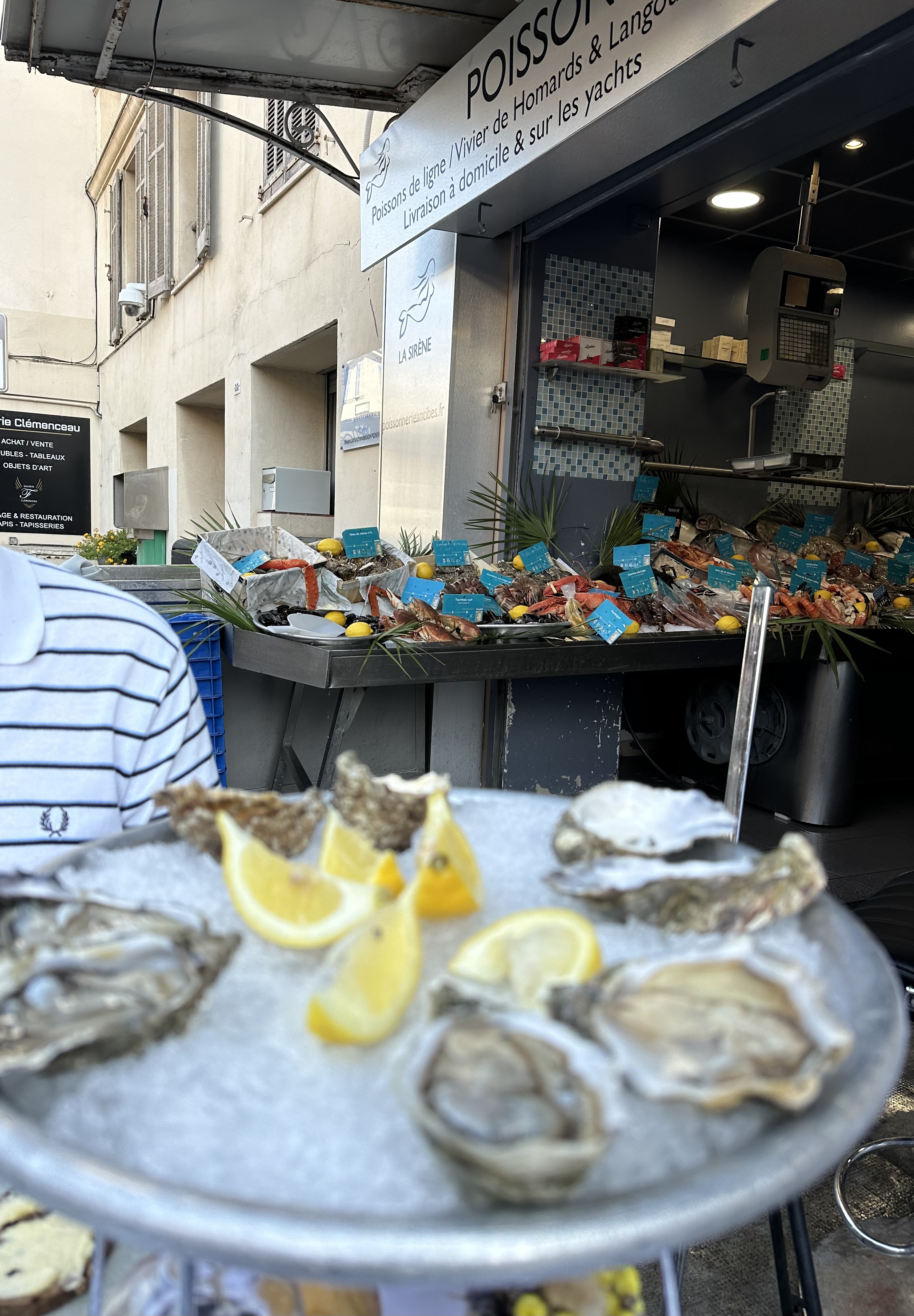 Des fruits de mer super frais, provenant de la Poissinerie (commerce voisin et connecté) servis sur les tables du restaurant et du marché aux poissons et à la nourriture de la ville. L'endroit est un peu bruyant à cause des voitures qui passent, mais très spécial et confortable. J'ai gouté les 4 huîtres disponibles type huîtres (très bonnes, mais il me manquait une sauce mignonette pour accompagner) et le thon flambé, savoureux et bien cuisiné et présenté. Certainement un bon choix à Antibes.