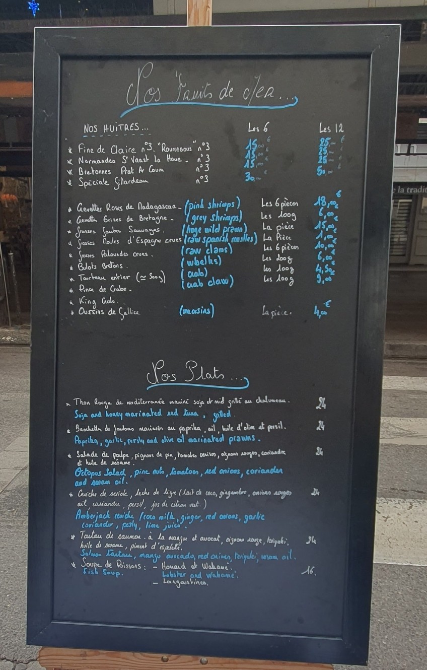 Sélection pédagogique d'huîtres et de poissons de qualité supérieure, certainement le bon choix pour un apéritif ou un dîner au marché provençal d'Antibes. Il y règne une ambiance authentique et agréable, également grâce au gérant qui se prête volontiers à conseiller et à guider les dégustations, dévoilant les petits secrets des plats proposés. Au final, un grand festin à un excellent prix avec le cadre unique de la place du marché