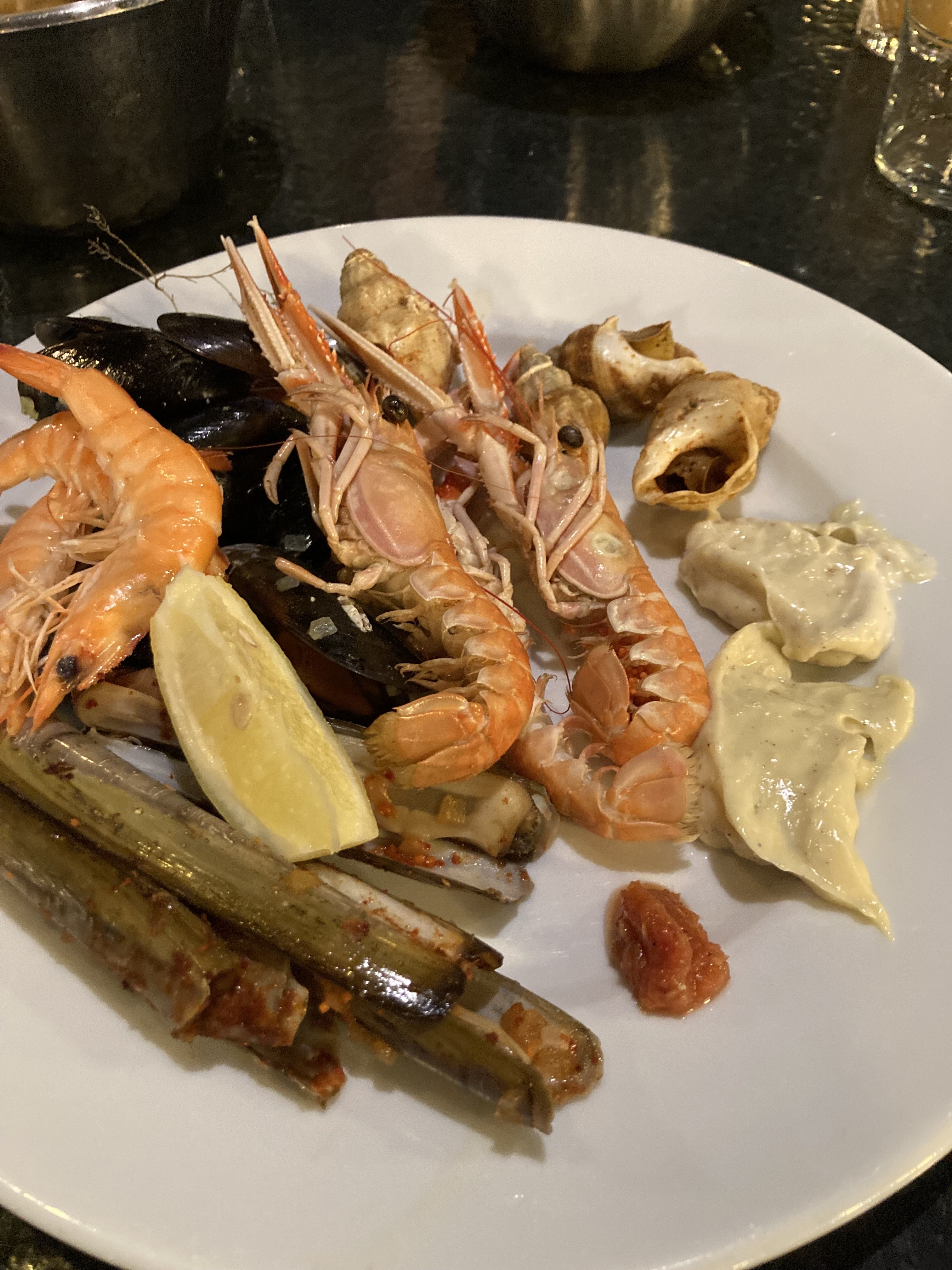 Resto très sympa serveur très attentionné agréable si vous aimez les fruits de mer vous êtes bien servi c est à volonté un régal et une découverte de certains pour moi juste petit bémol les sauces d accompagnements juste agrémenté de citron de sel poivre et d ail et parfait Le lieu superbe vous avez le choix d être en terrasse ou à l intérieur mais avec cette chaleur l interieur climatisé superbe très belle vue resto avec une déco très épuré jolie merci pour cette découverte je reviendrais