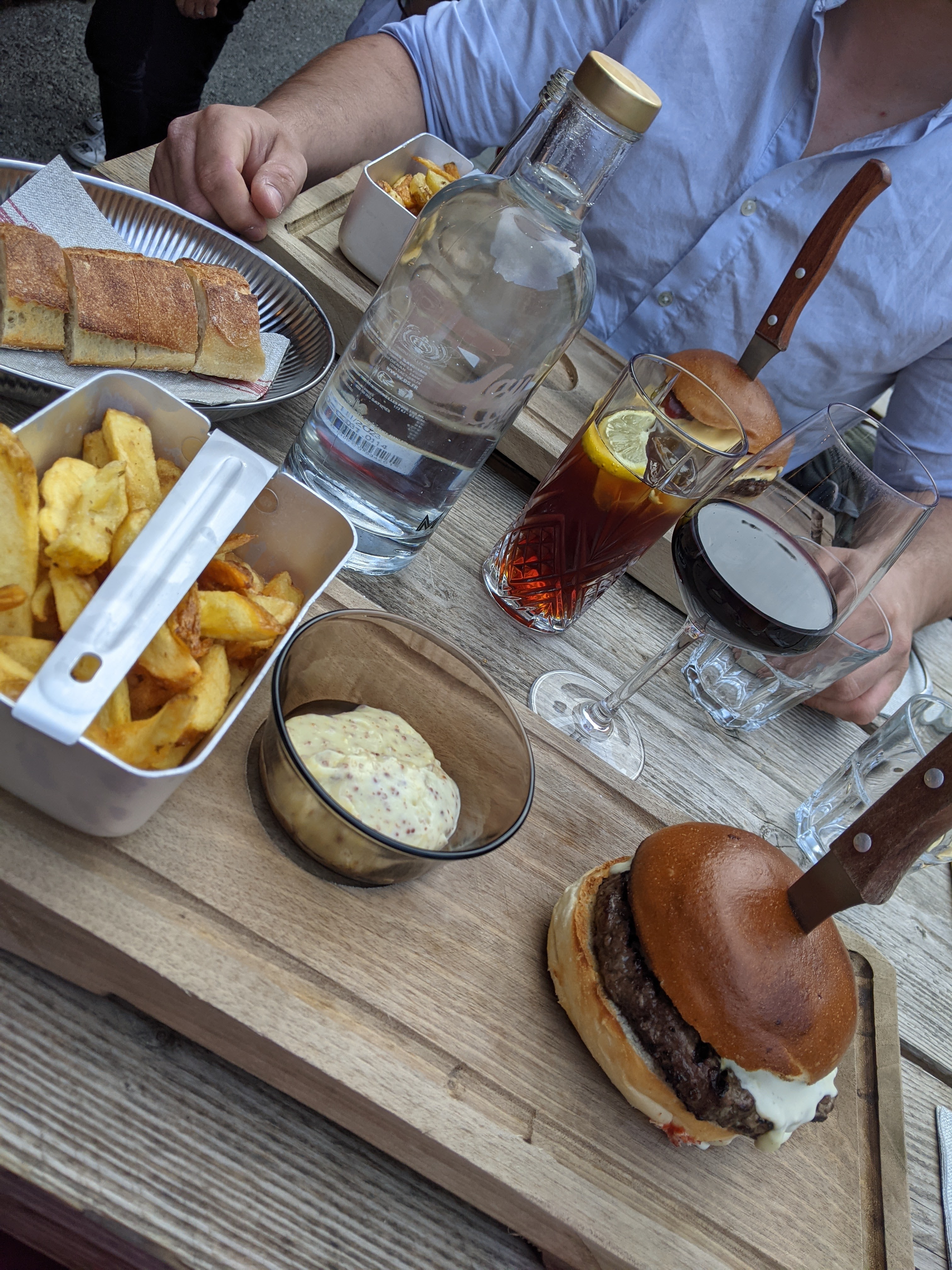 Accueil chaleureux et sympathique Assise super confortable à l'intérieur ( banquette) Humous de betterave..très bon en entrée Cheesburger au top sauce cheddar et reblochon
