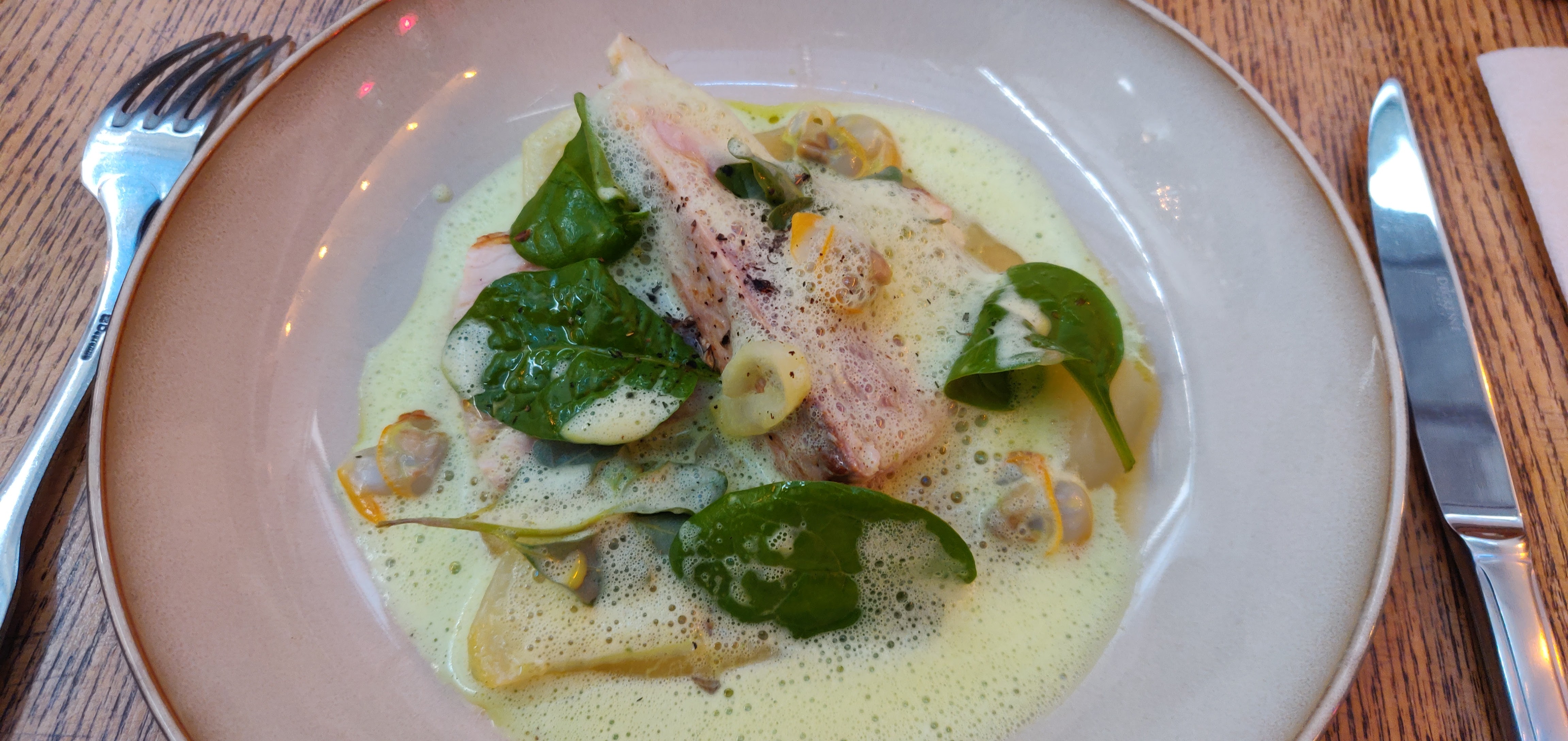 J'ai eu un délicieux déjeuner composé d'une galette aux courgettes et au fromage, d'un bar avec pommes de terre et légumes et d'un plateau de fromages. Les vins blancs proposés au verre ont été décrits par le sommellier et j'ai pu choisir des vins qui s'accordaient bien avec les plats.