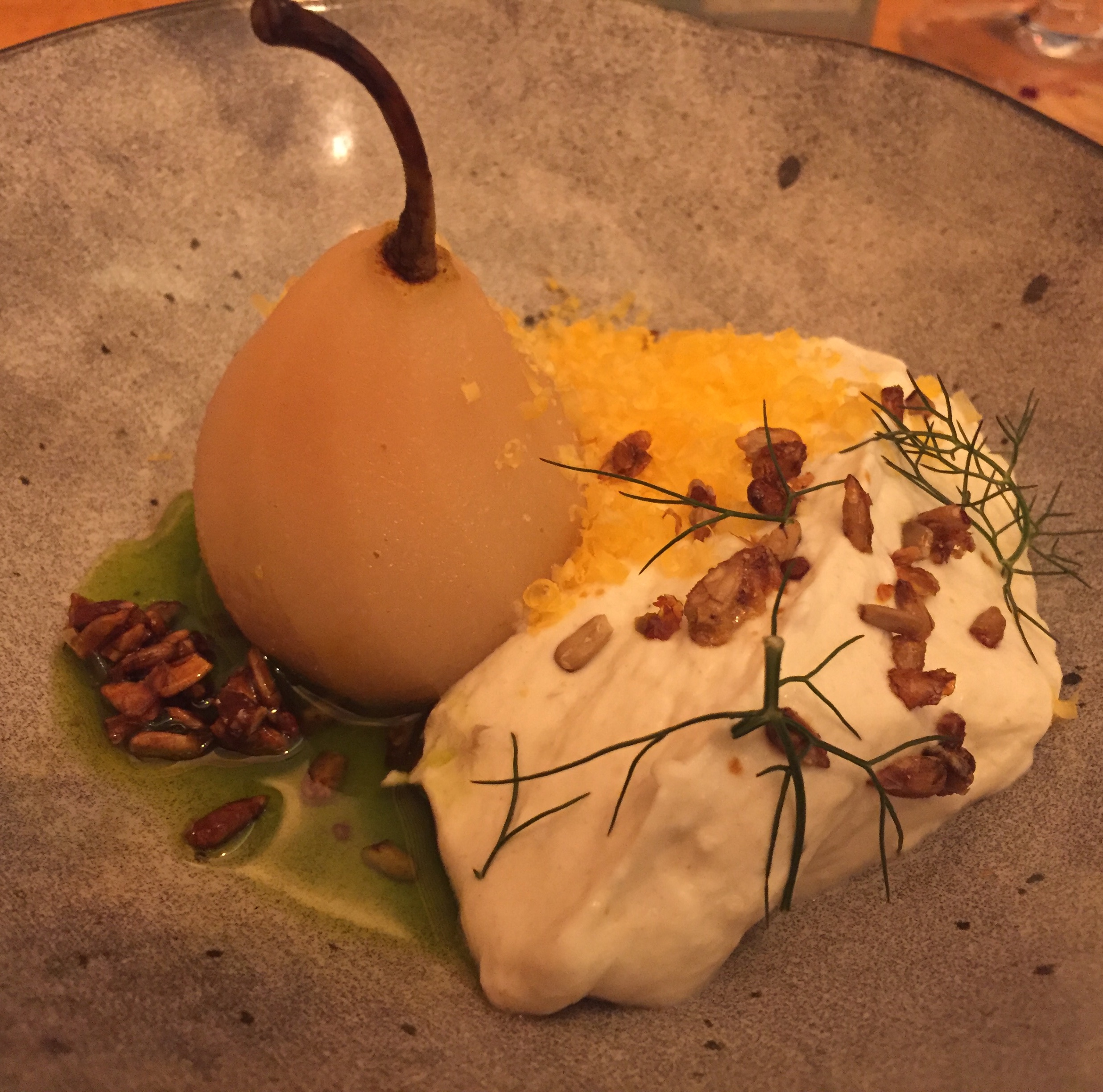 Fabuleuse découverte que nous avons faite avec une amie , mardi soir dans ce petit bijou de resto ...l accueil déjà vaut son pesant d or quand le chef vous raconte u debut du repas pour l ensemble des ta blees avec savoir et humour le menu qu il vous a concocté et les vins qu il y a associés ..c est passionnant ...il rentrait du Québec et si visiblement il est resté un peu sur sa faim question gastronomie , il a su révisiter à merveille leurs traditions culinaires ..Pour faire bref .la neige de sapin saupoudrée sur la raviole de tourteau restera longtemps longtemps dans ma mémoire, je n ai jamais mangé d aussi bons brocolis 😉, la poutine révisitée était délicieuse et quand au dessert à base de pommes , pecan et bourbon ...une tuerie ... Merci à ce chef de nous transmettre toute sa passion et de nous permettre de régaler et de surprendre nos papilles en y associant de fabuleuses découvertes de vins ... Courrez y vite si vous aimez la gastronomie et être surpris....