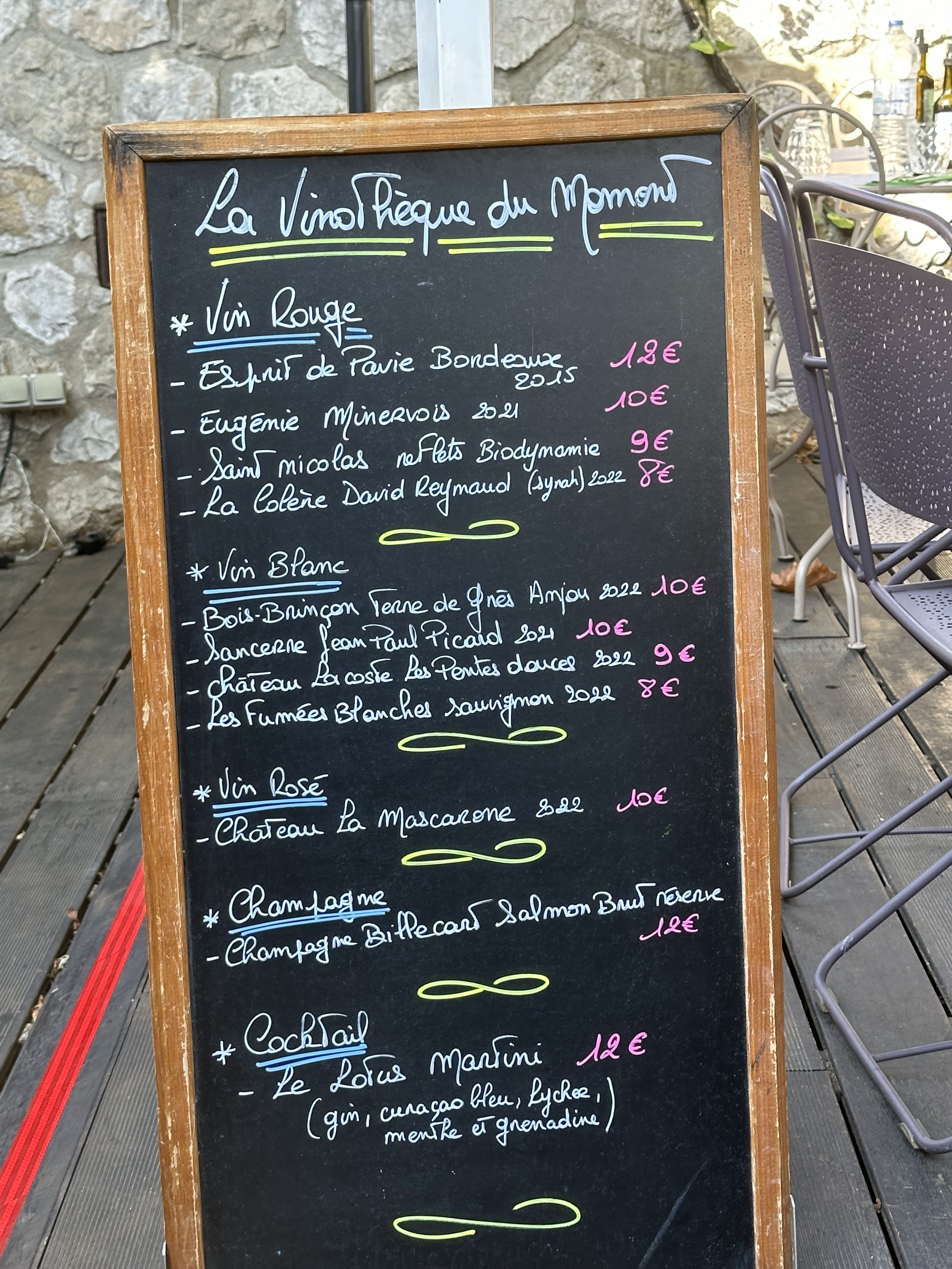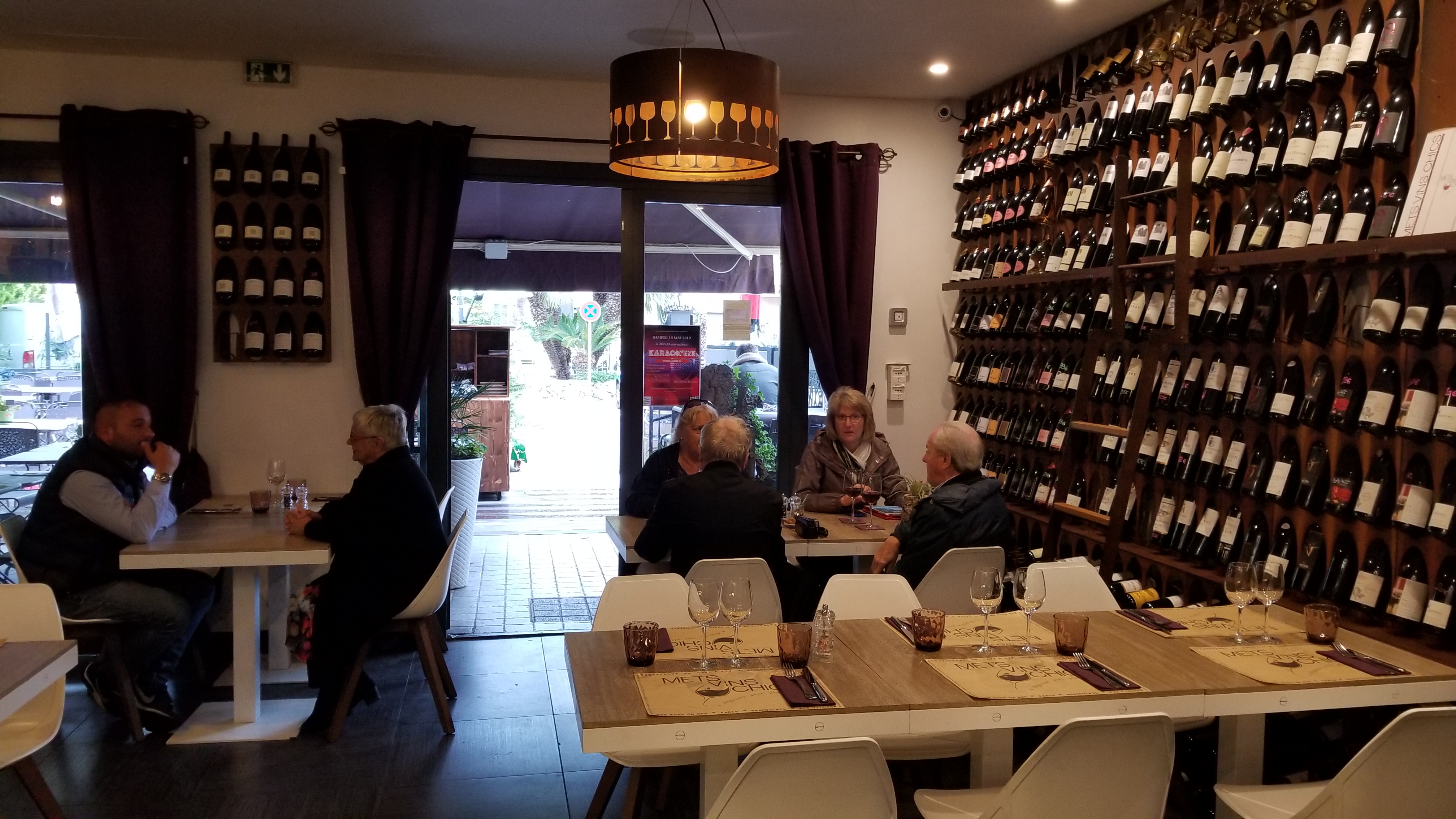 Restaurant, bar à vins situé sur une placette à Èze, petit village très typique et mignon au-dessus de Monaco. Terrasse couverte et salle climatisée. Nous avons été très bien accueillis, la serveuse nous a laissé le choix de la table. Cependant, le bruit de vaisselle et le langage familier des serveurs ont dérangé mon époux ainsi que mes amis. Les salades sont très originales et excellentes. Pour ma part j'ai adoré la mienne, toasts de chèvre chaud, qui était exquise, la meilleure de toutes celles que j'ai mangées. La décoration sur le thème du vin est réussie. La cave est accrochée au mur, c'est original et joli. Je recommande vivement!
