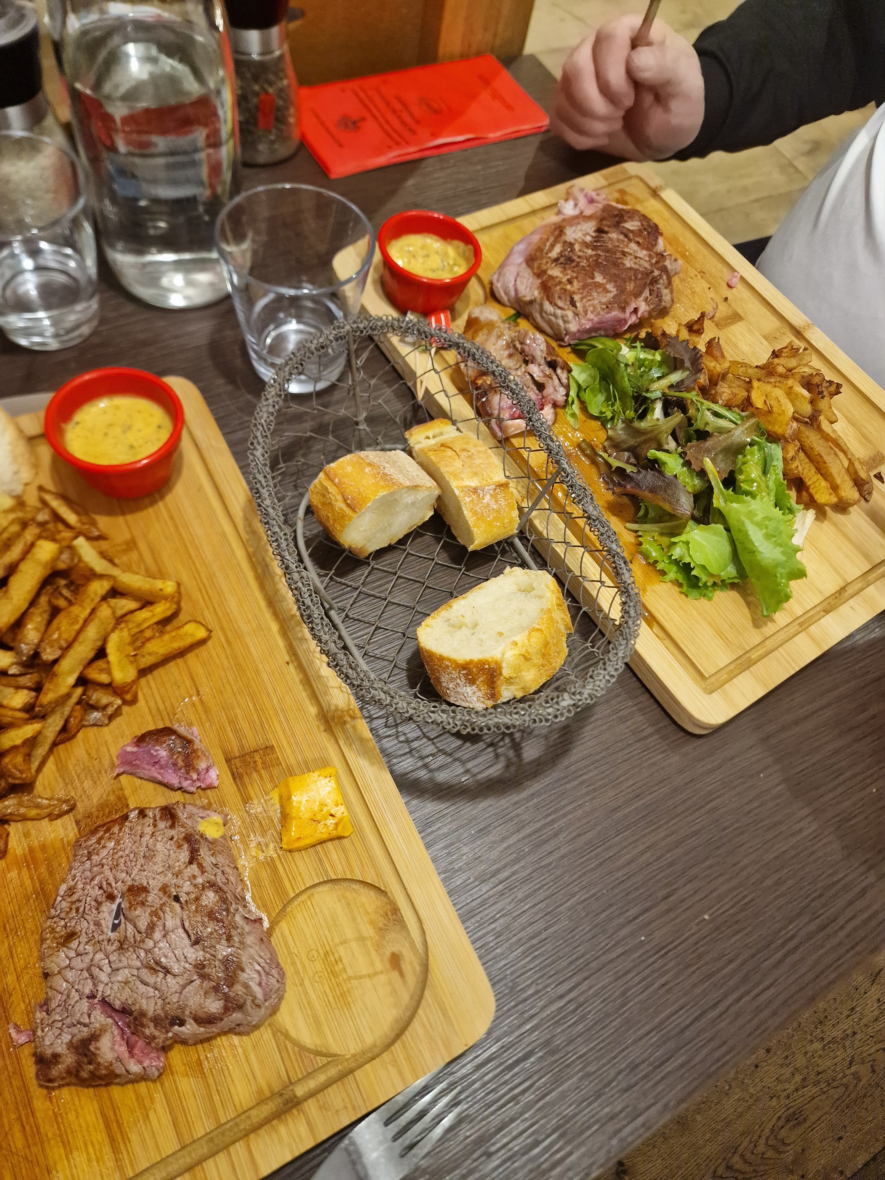 Viande super bonne, et tant mieux car c'est pour cela qu'on vient ! En revanche choisir et payer en entrant c'est perturbant, surtout quand on connaît pas, c'est fouilli fouillon la carte, et si tu veux un second verre de vin pendant le repas on fait comment ? Vu qu'on a payé à l'entrée ? On sait pas.... Bref, on a prit entrecôte intermédiaire pensant que la plus petite, premier prix proposé serait pas assez grosse grosse erreur ! L intermédiaire c'était énorme, nous avons fini notre viande mais en se forçant pour pas gâcher ! La première taille est suffisante ! Très très bon, juste le concept qui nous fera ne pas y retourner.