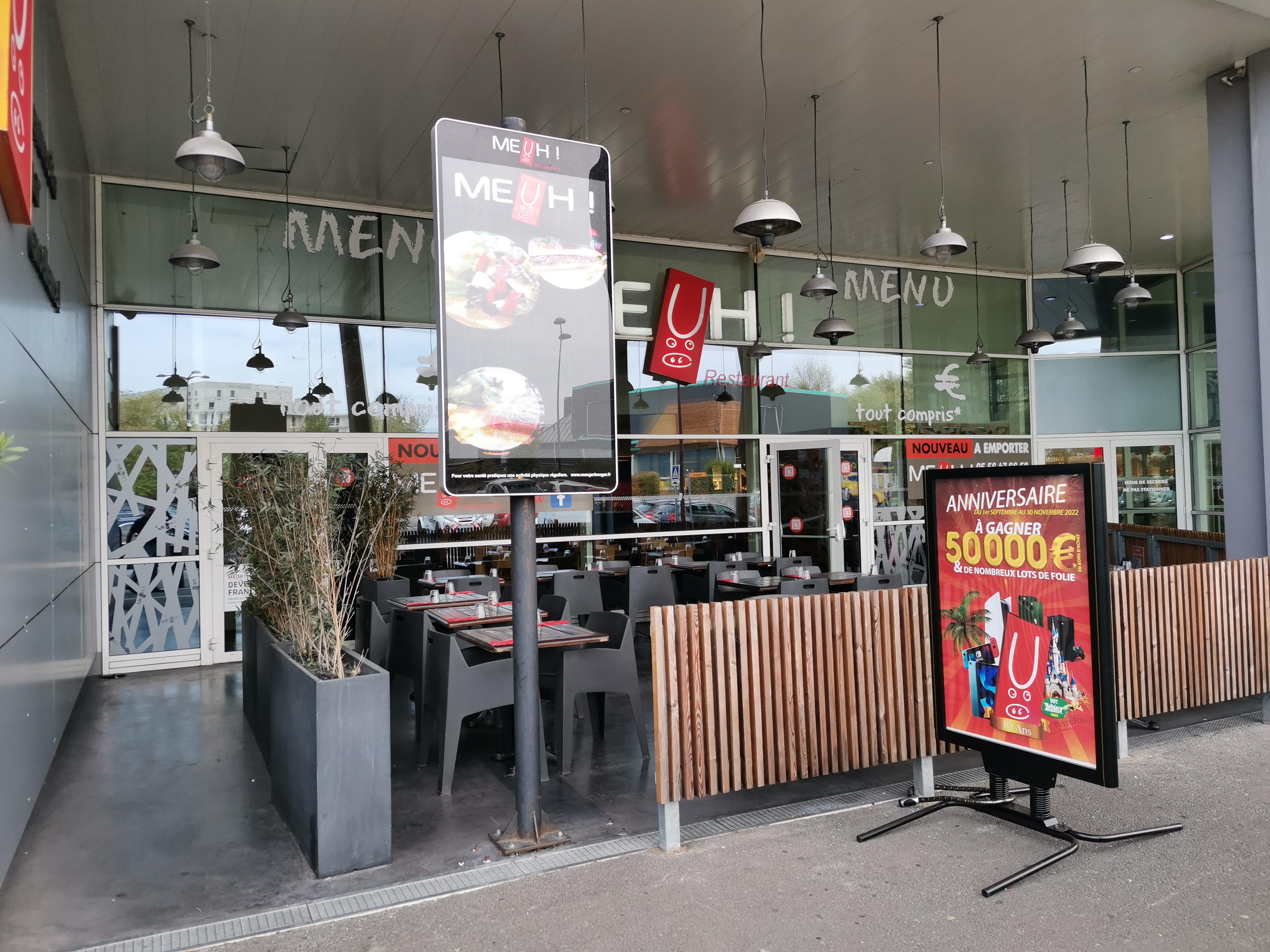 Je suis un habitué de l'enseigne MEUH !, et ce depuis plusieurs années. Ce n'est pas de la grande cuisine mais c'est généralement correct, avec un accueil et une ambiance agréables. Le restaurant de Mérignac fait cependant exception. La dernière fois que j'y suis allé c'était il y a à peu près un an et j'étais pour ainsi dire resté sur ma faim (c'est-à-dire très déçu). Aujourd'hui, ayant très faim en passant dans le secteur, j'ai décidé de donner une seconde chance à l'établissement. Quelle erreur ! Pour ce qui est de l'accueil, je suis arrivé à l'ouverture du service, et j'ai été surpris d'attendre autant pour commander alors que j'étais le seul client. Ce qui m'aurait plu, c'est que les serveurs fassent au moins semblant de vouloir travailler. Point à revoir, donc. Quant au repas, j'ai pris le double steak haché (saignant) avec des frites. J'ai pu apprendre que oui, il était en effet possible de rater un steak haché : j'ai dû mal articuler en disant saignant et on m'a servi de la semelle. Les frites étaient molles et contenaient étonnamment beaucoup plus d'huile que mon moteur Fiat Panda 1,2L essence. Le tiramisù reste mon coup de cœur, bien que je cherche encore où est passé le mascarpone, le café et le tiramisù. Proposition de changement de nom : mousse au spéculoos à 7€. Bonus : j'ai écrit plus haut que j'étais arrivé en premier. En attendant mon plat, je me suis rendu aux toilettes où j'ai découvert, tel Arthur devant Excalibur, la brosse plantée fièrement dans le trou. Sans doute un agent de nettoyage tête-en-l'air ... Pour conclure, je ne reviendrai pas, mais voici un tutoriel pour apprendre à sourire : https://youtu.be/8asyexq1Pdw?feature=shared