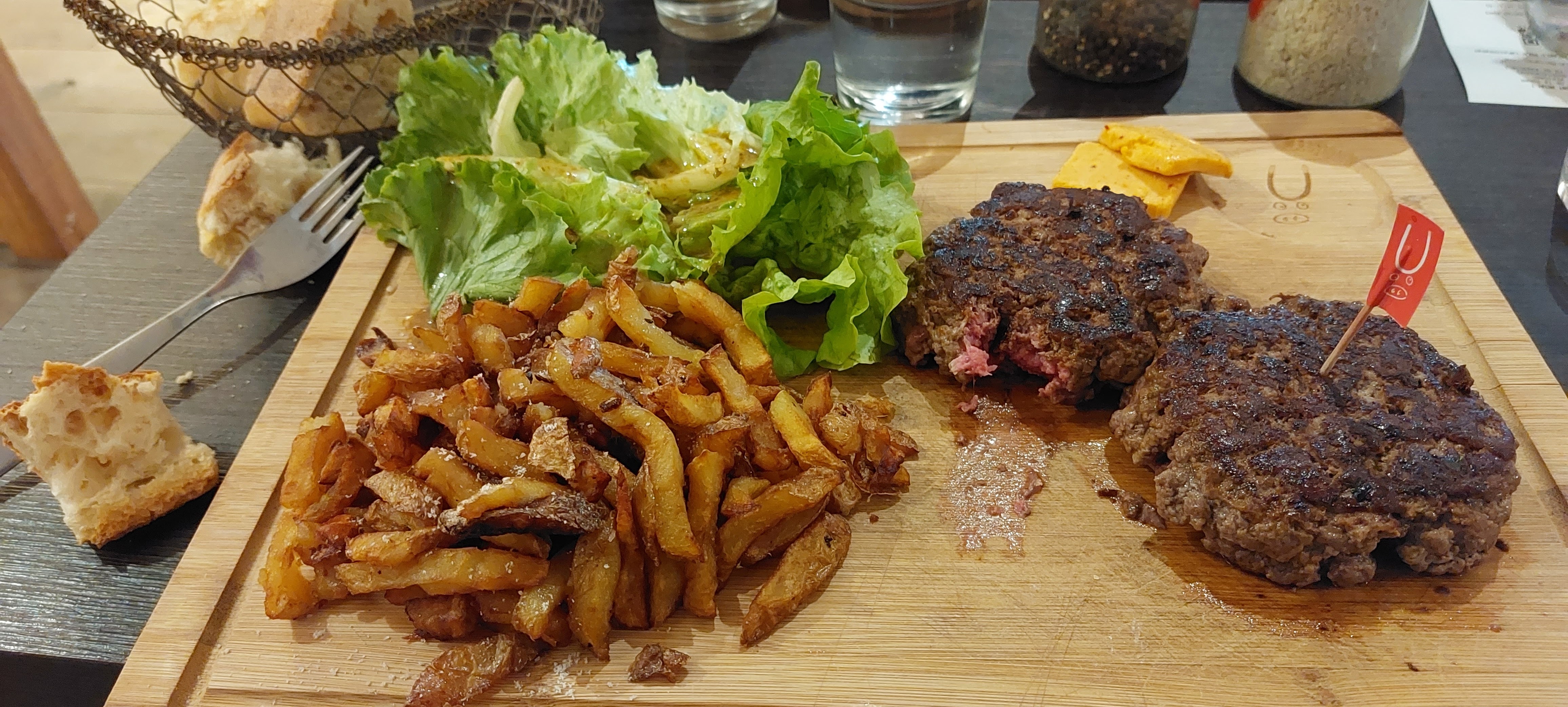 Personnel très sympathique... Mais je déconseille pour les raisons suivantes et évidentes ×× Seulement 2 étoiles car: Des verres avec traces de doigts...👎 Pour moi un repas sur des planches de bois vraiment pas hygiénique !👊👀 Du gros sel et poivre en coupelles OUVERTES et non couvertes: pareil...🥶 Des grillades sans originalités@ Buffalo fait même mieux$ Aucune sauce qui marque l'esprit juste le strict nécessaire, ketchup,moutarde, Mayo pas fou#🤐 Un Fromage blanc fade et douteux goût faisandé 🦚 En ce qui concerne la fin du repas le café avec ou sans sucre usagé dans la coupelle cest au choix!!!! C'est certain je n'y retournerais pas🤮