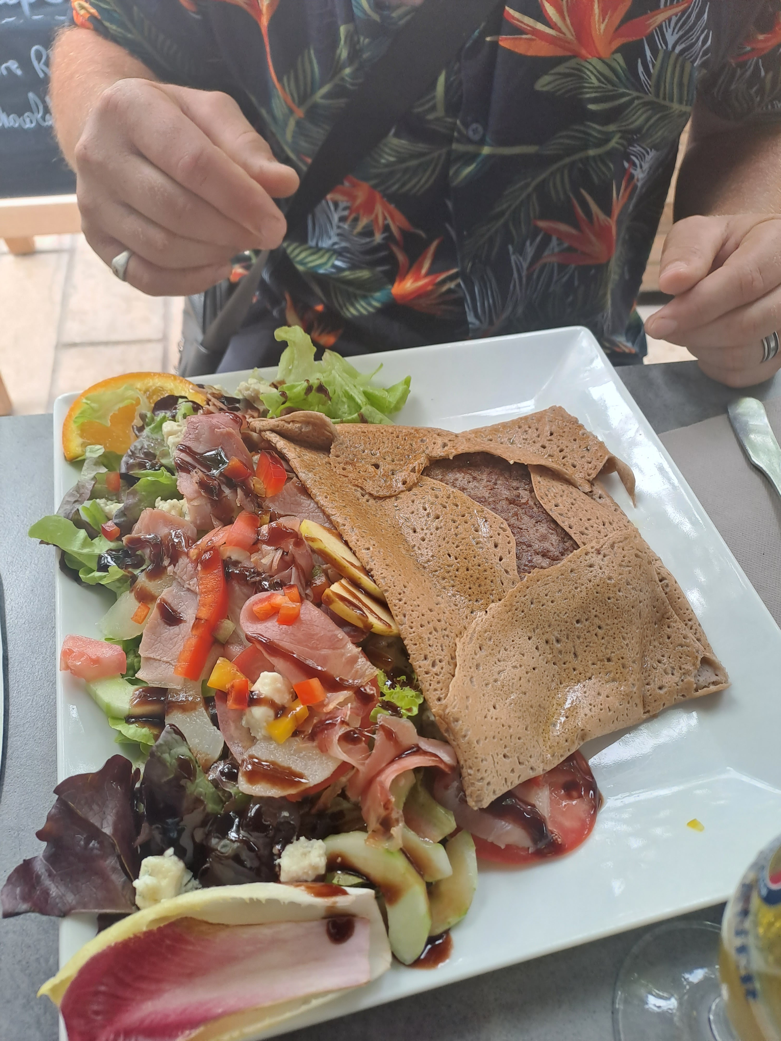 Très bon moment en terrasse dans ce restaurant : ingrédients des crêpes frais, salades copieuses, service très agréable !