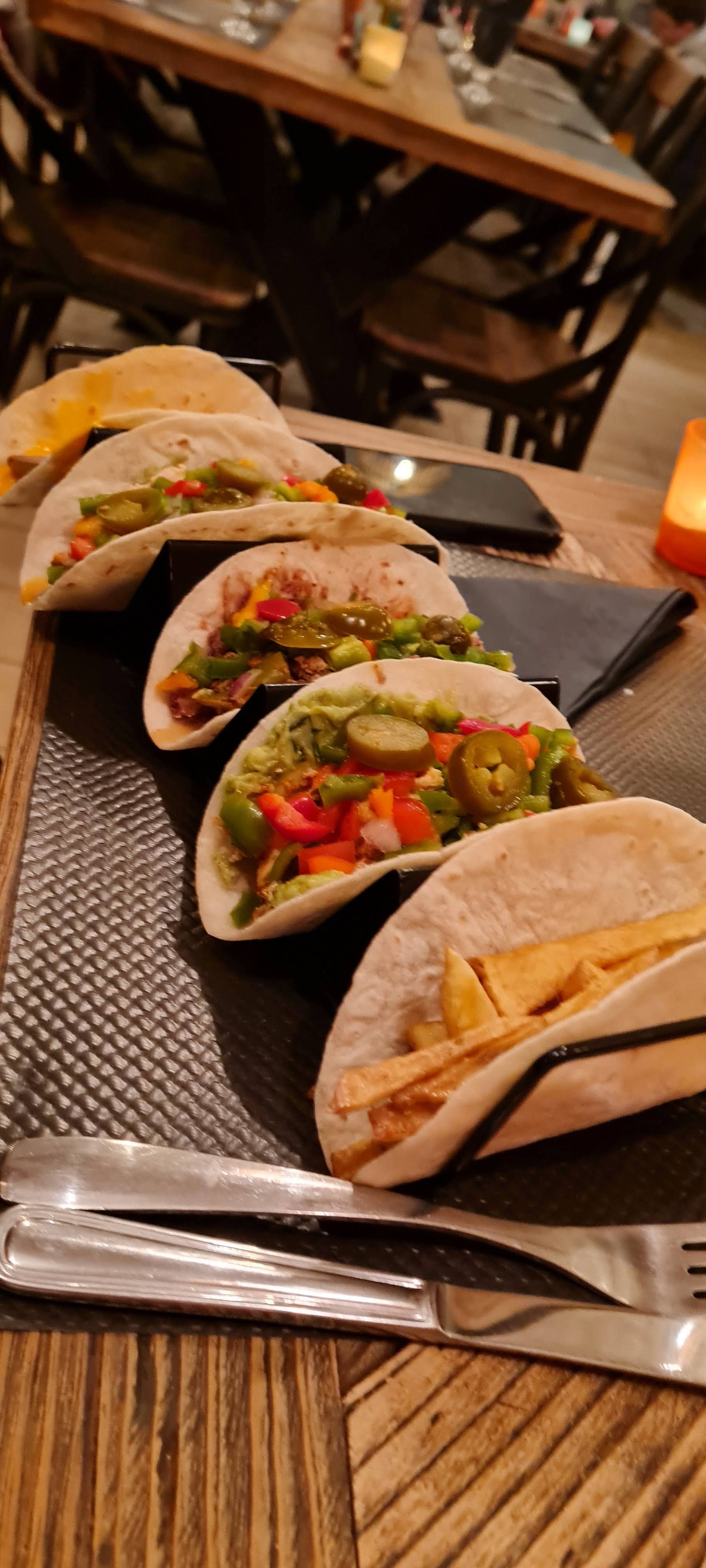 Bof.. les tacos sont servis froids, très écœurants. 5 petites galettes de blés donc 1 avec que des frites dedans 1 autre avec que de la sauce cheddar et les 3 autres remplis d’une espèce de salade tunisienne avec 3 bouts de viandes qui se courent après. Très pénible à manger, le jus des tomates faisait que couler, dommage qu’on ne serve pas automatiquement des assiettes ça aurait été plus simple je pense… La quesadillas était très bonne et l’entrée aussi. Déçue juste au niveau du plat :/ J’ai trouvé ça un peu trop cher pour la qualité et quantité. Pour se garer, il faut chercher un peu plus loins. A tester….